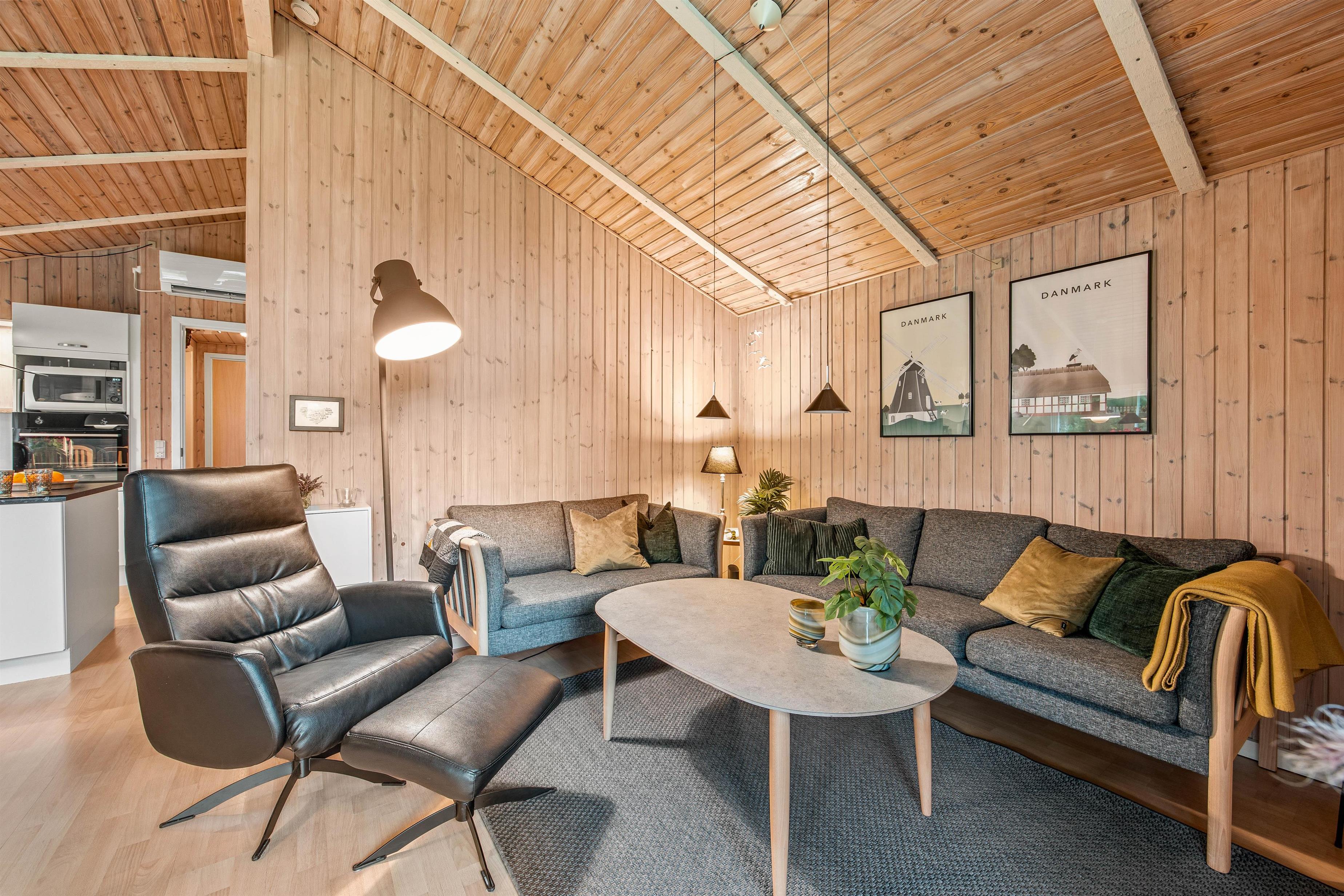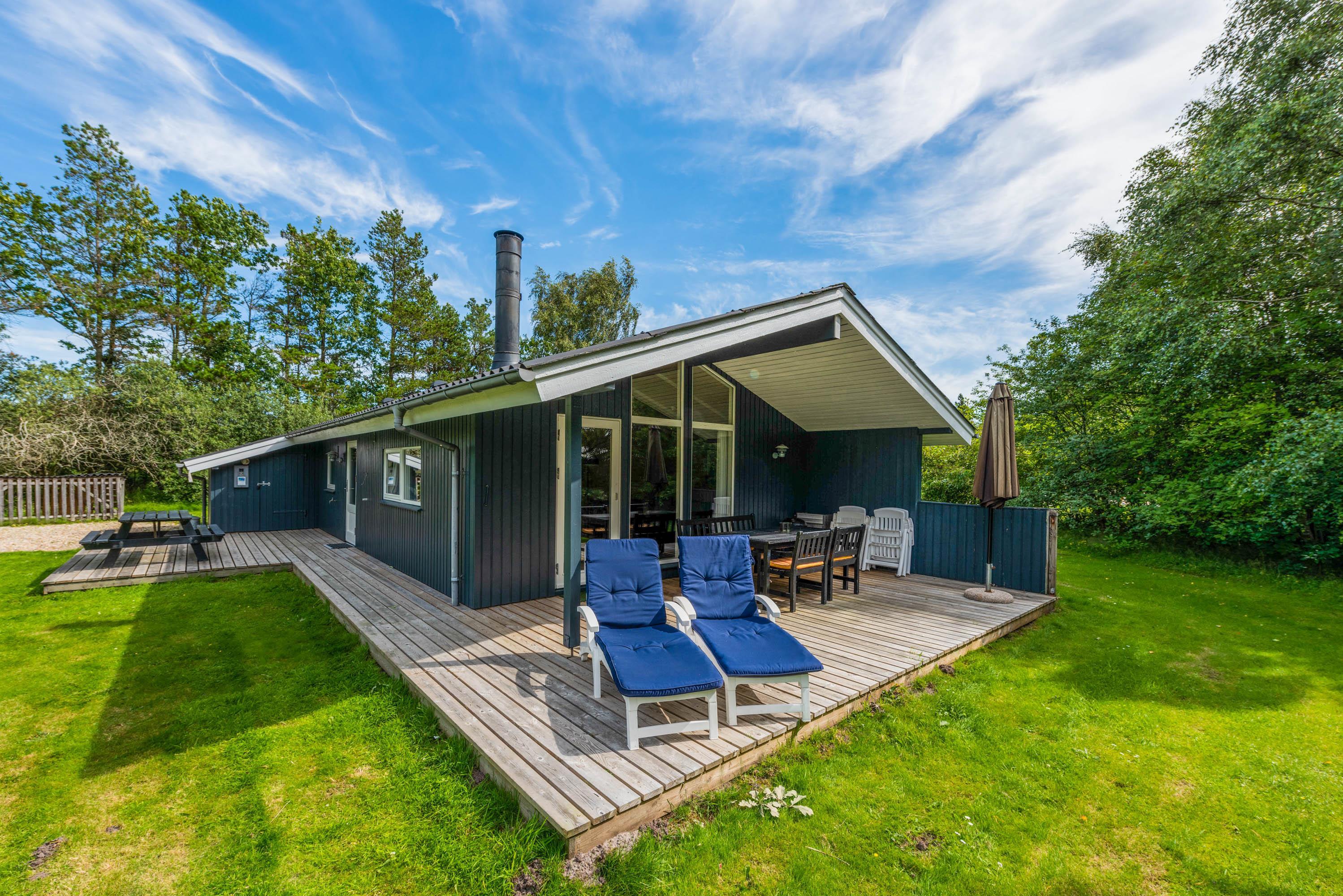 Med denne blå sommerhusdrøm bor I med op til 6 personer helt perfekt, hvis I gerne vil tilbringe en naturnær ferie ved den danske vestkyst uden at gå ned på komforten. Her får I både jeres egen sauna, en hyggelig brændeovn og selvfølgelig, gulvvarme på badeværelset.