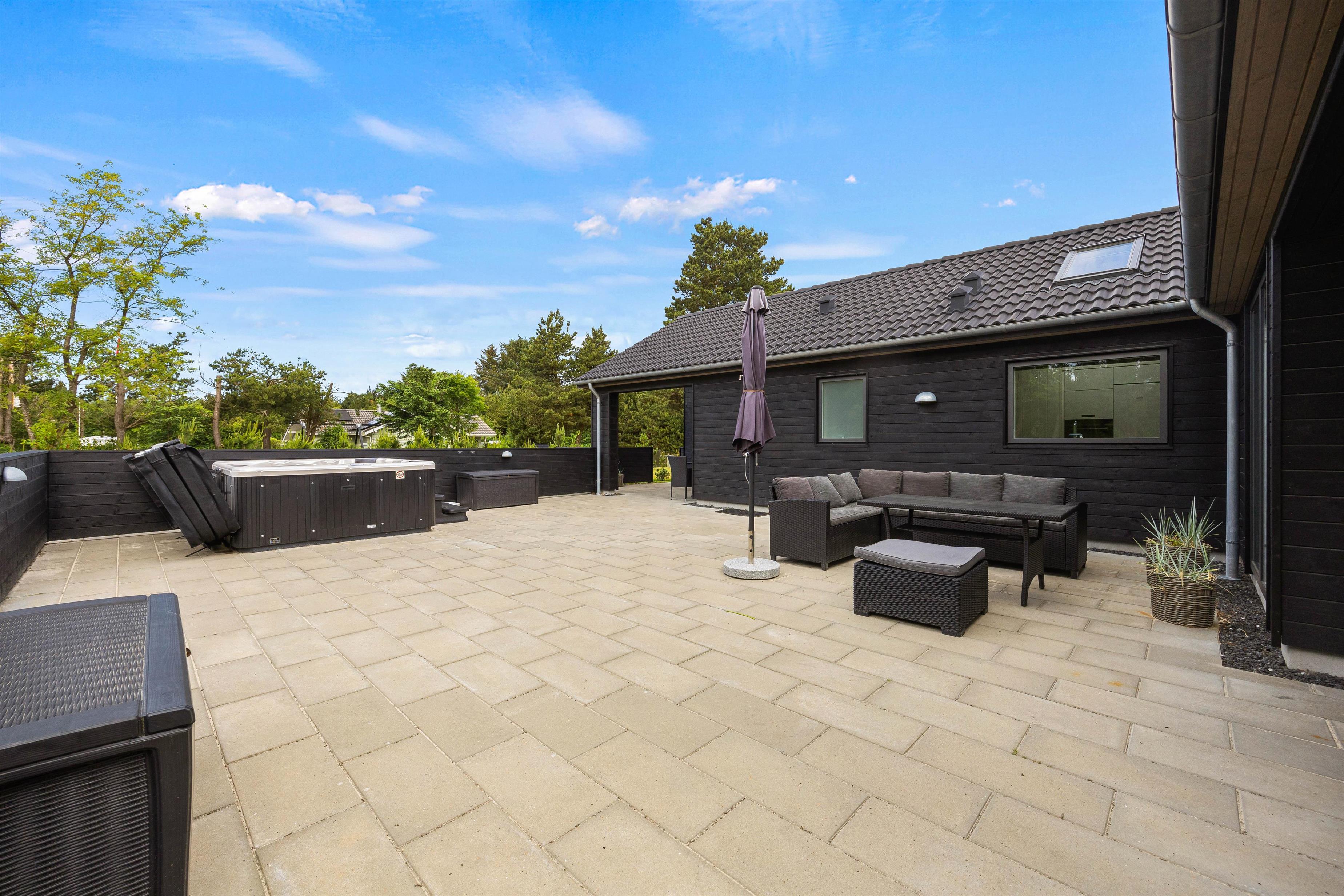 Feriehusets store terrasse inviterer til mange hyggelige og afslappende timer i den friske luft. På terrassen er der både en udespa, der byder på masser af afslapning. Desuden er der en udebruser på terrassen, I kan blive skyllet under.