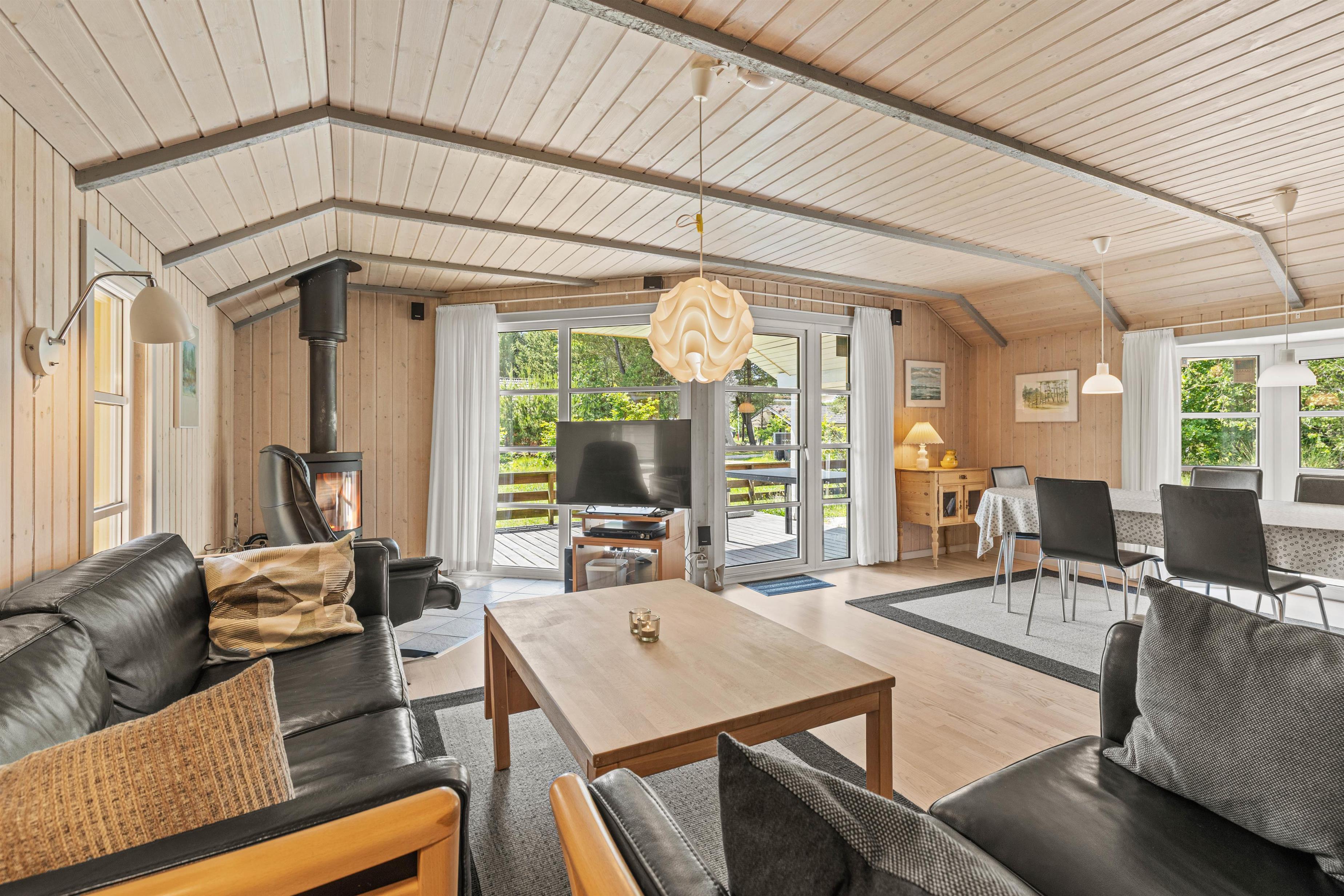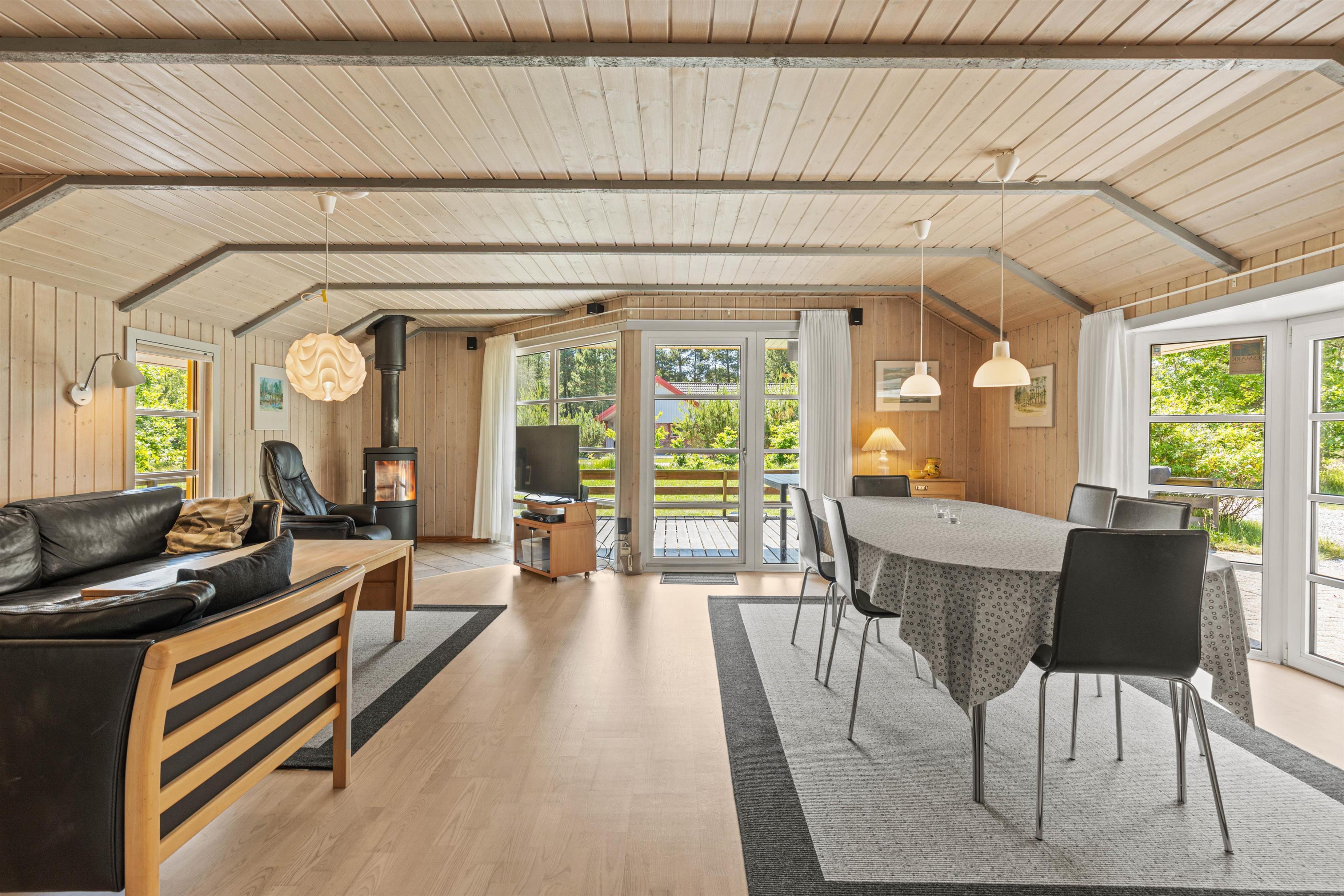 Sommerhuset fik splinternyt køkken i 2021 og den rummelige spisestue indbyder til masser af samvær og hyggelige stunder med den knitrende brændeovn i baggrunden, og de store vinduespartier lader masser af lys slippe ind, samtidig med I har udsyn til haven og de naturskønne omgivelser.