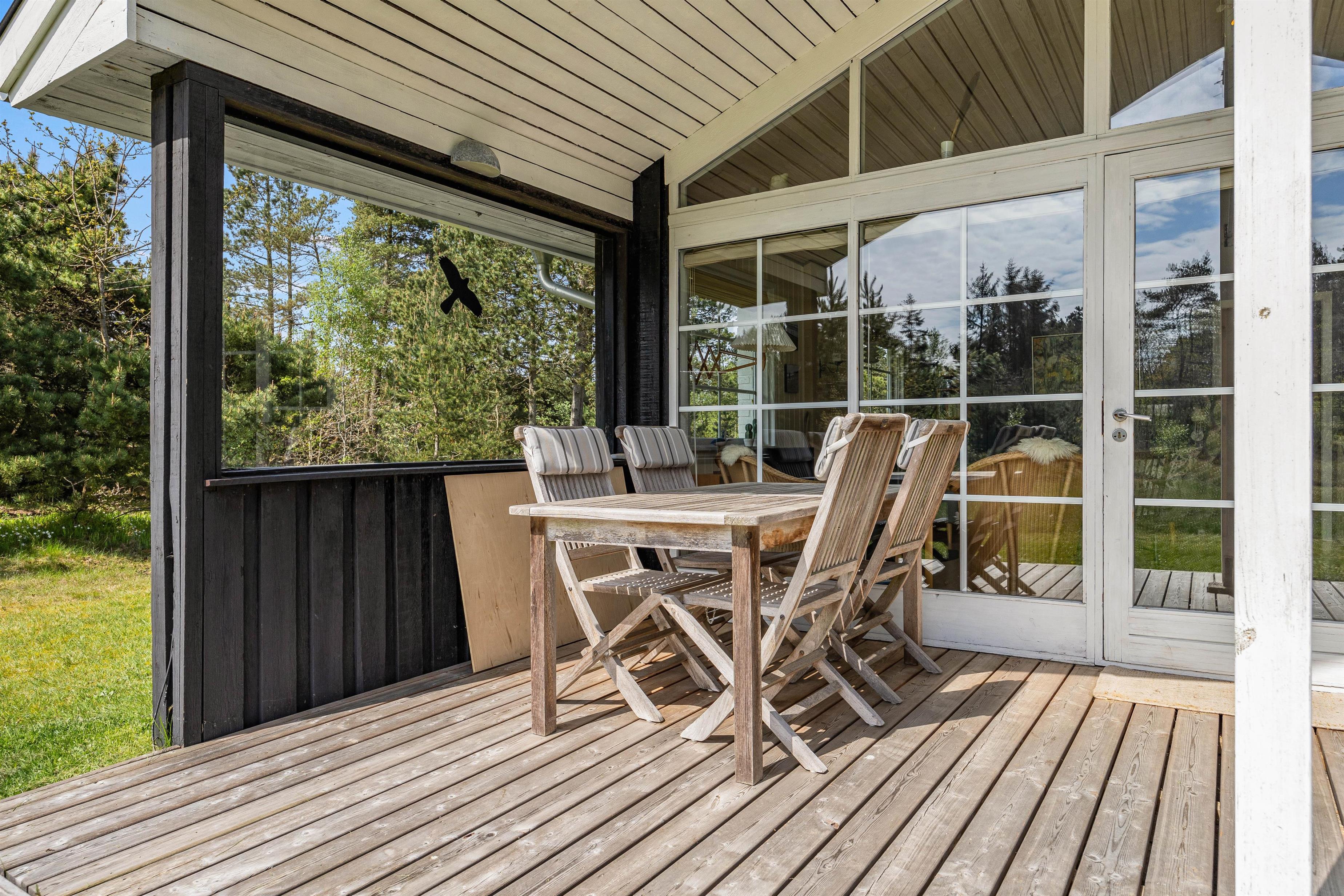Gennem terrassedøren kan I bevæge jer fra stuen og direkte ud på terrassen. Her er der mulighed for at sidde afskærmet og overdækket, hvis vejret ikke viser sig fra sin bedste side, eller I blot foretrækker skygge. I kan også bevæge jer ud og sidde under åben himmel. Uanset hvad I foretrækker, står her både havemøbler, parasol, solvogne og en grill klar til at give jer en skøn dag i haven.