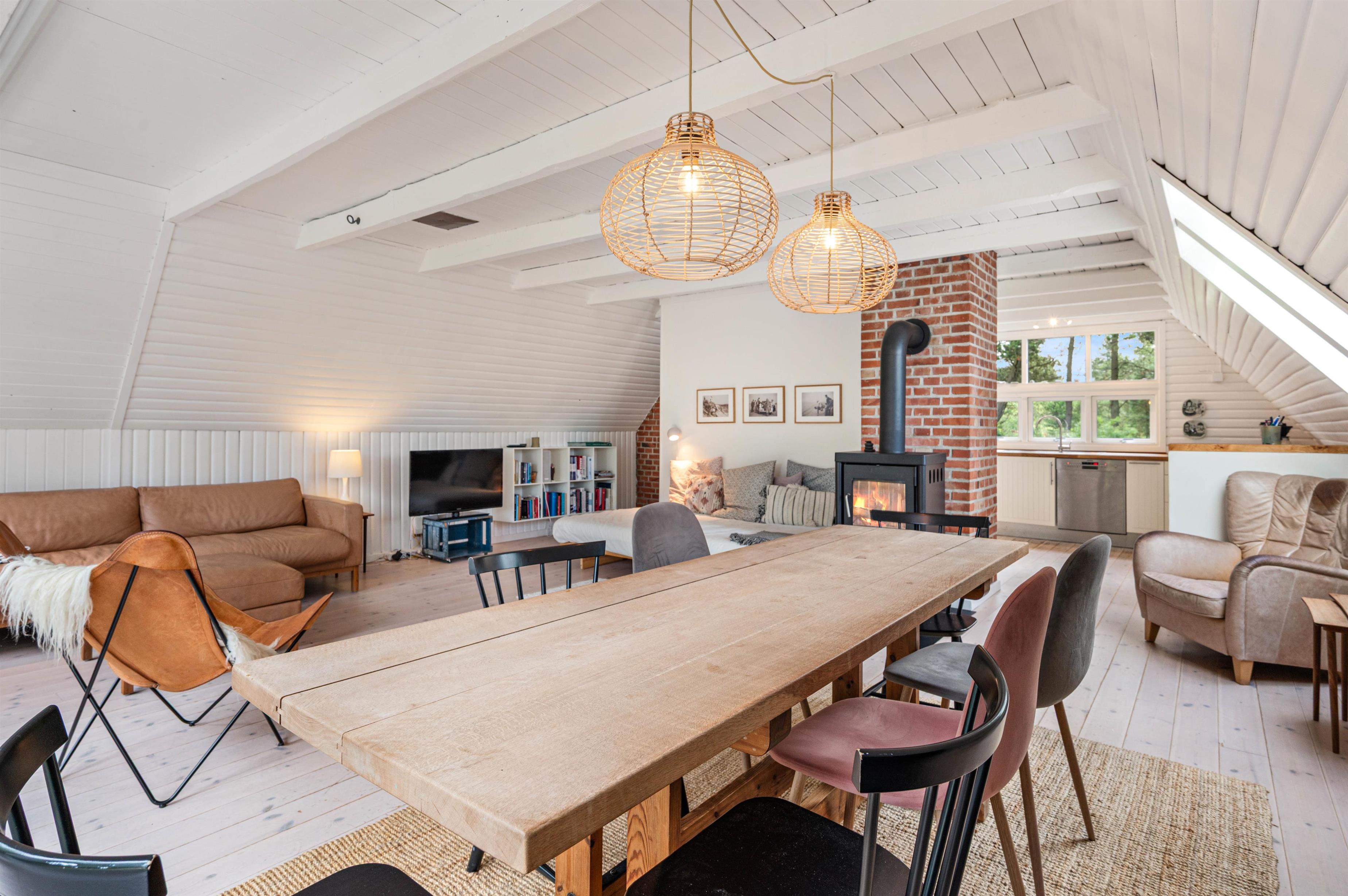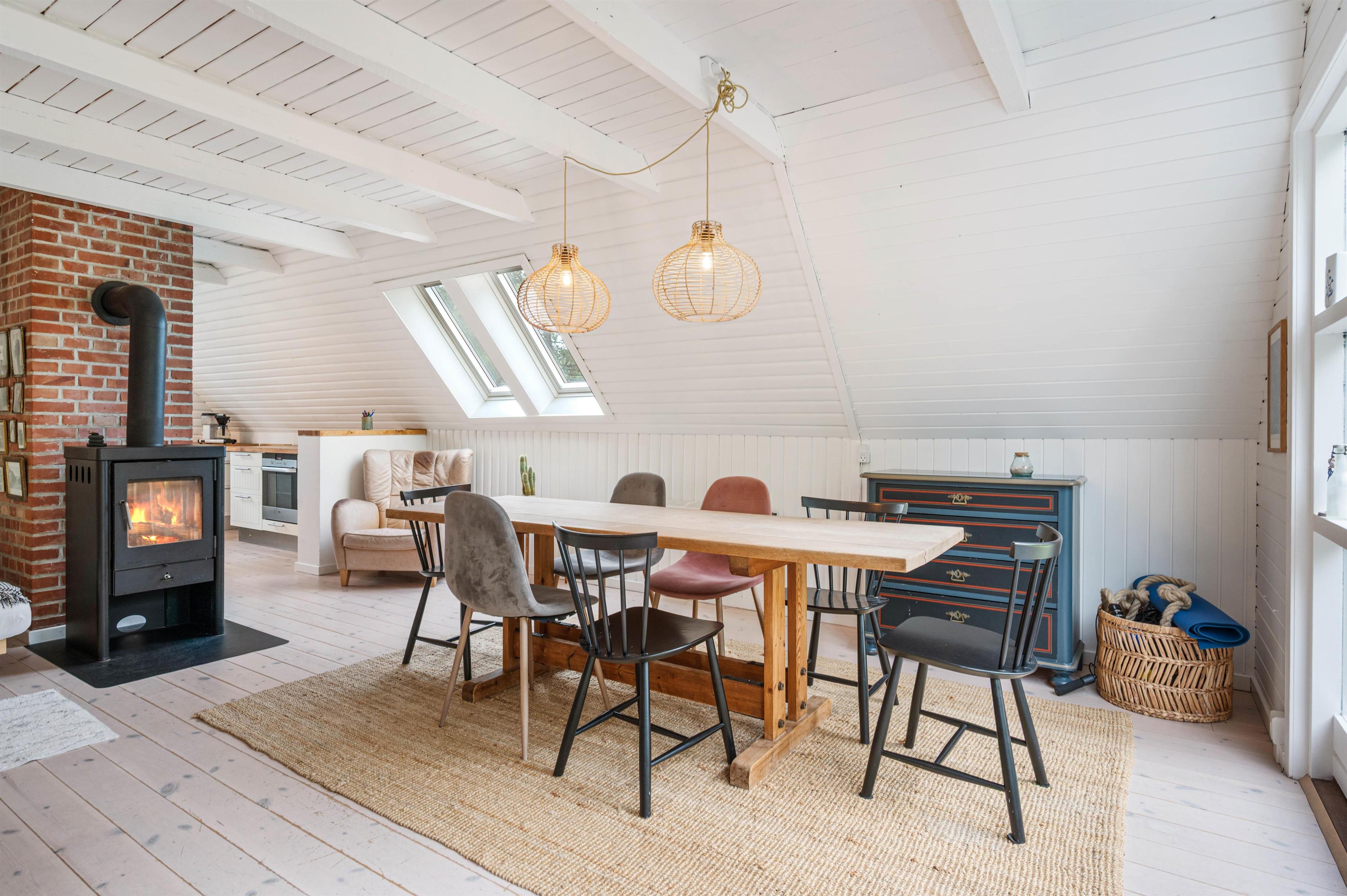 Alrummet rummer også en brændeovn, der fuldender den hyggelige feriestemning med sine knitrende flammer. Samtidig spreder den også en dejlig varme. Derudover har I en varmepumpe i feriehuset, der sørger for et godt indeklima på jeres ferie.