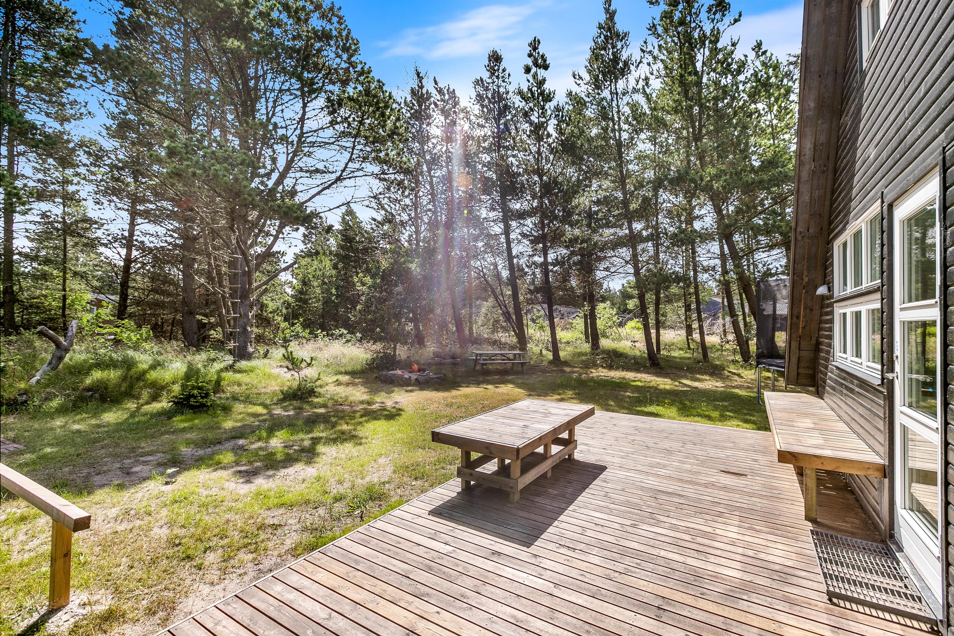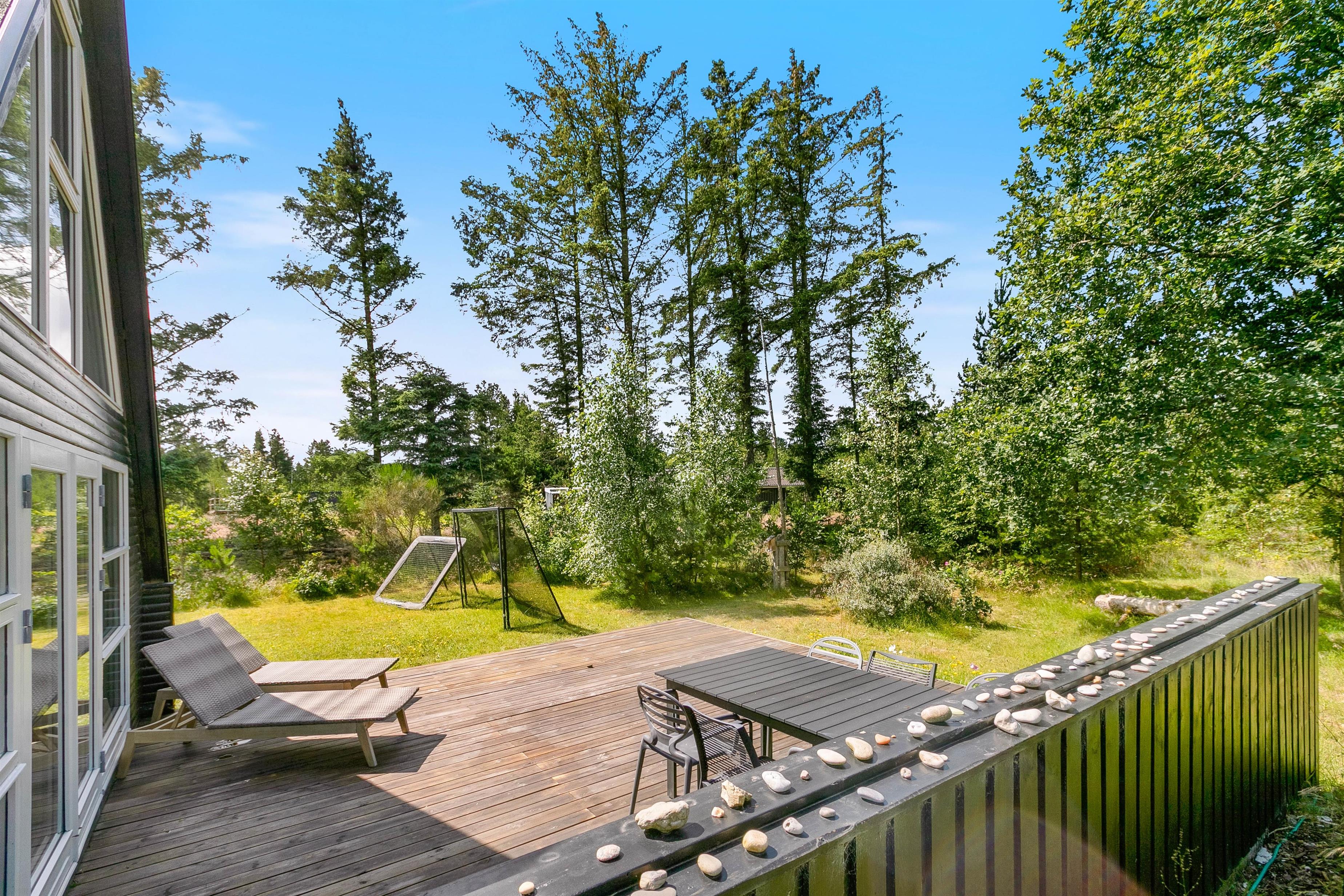 Sommerhuset ligger på en 2.100 kvadratmeter stor naturgrund i Houstrup, og her er I altså omgivet af den vestjyske natur på jeres ferie.