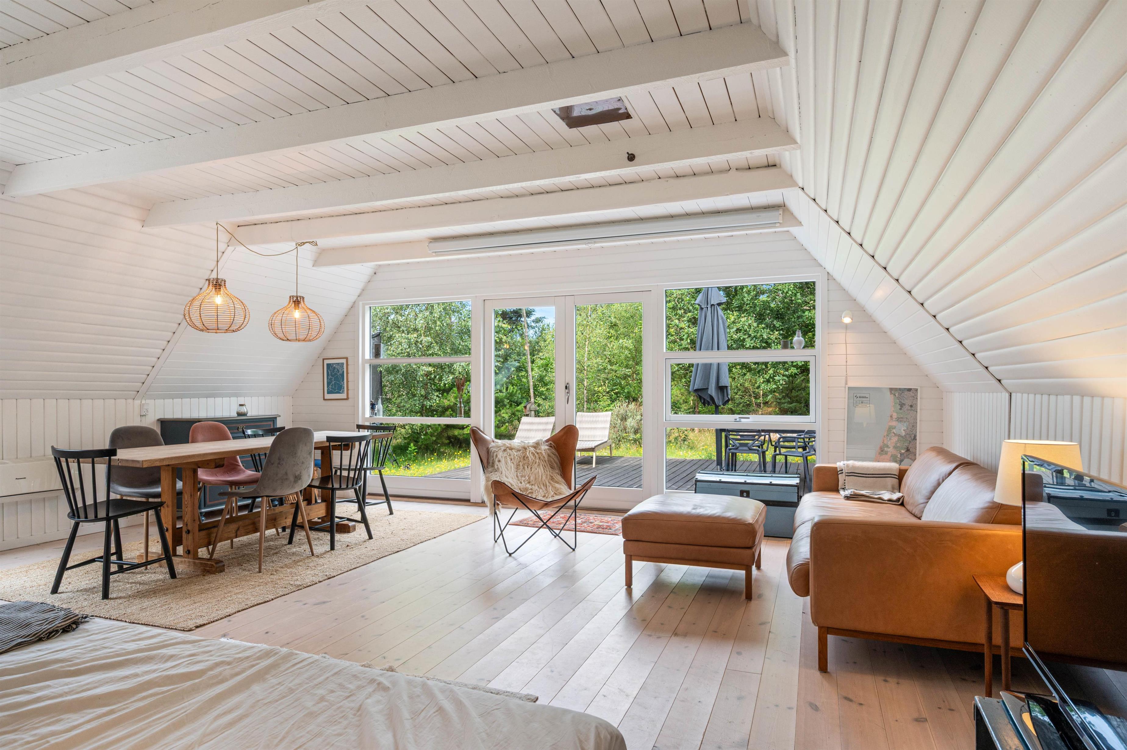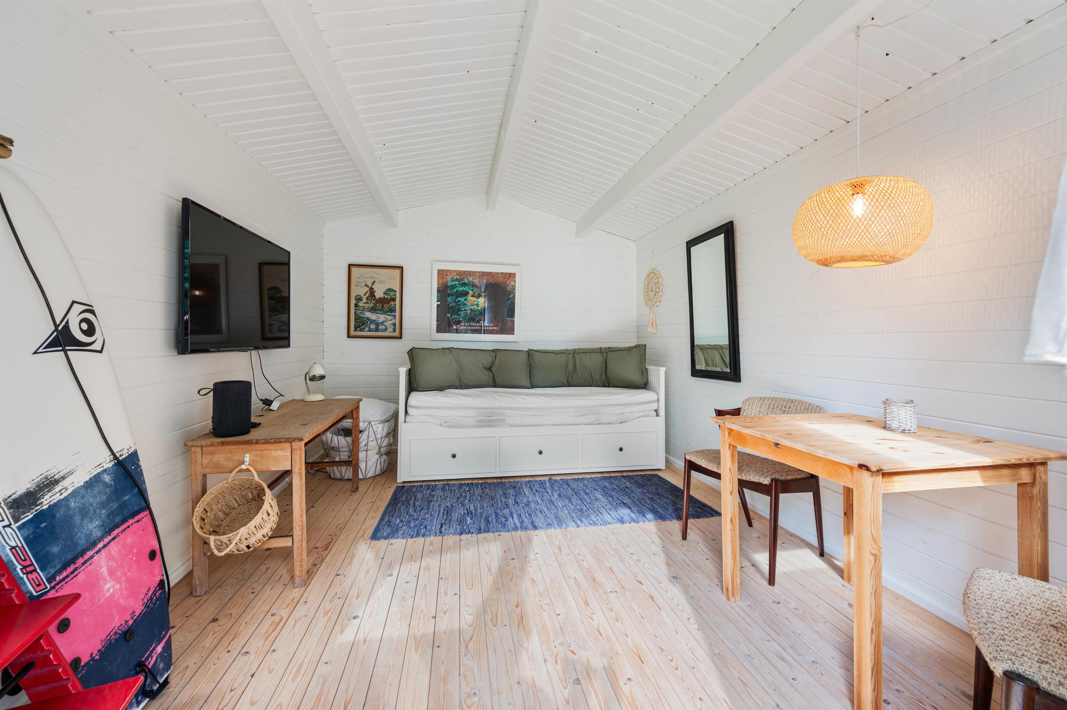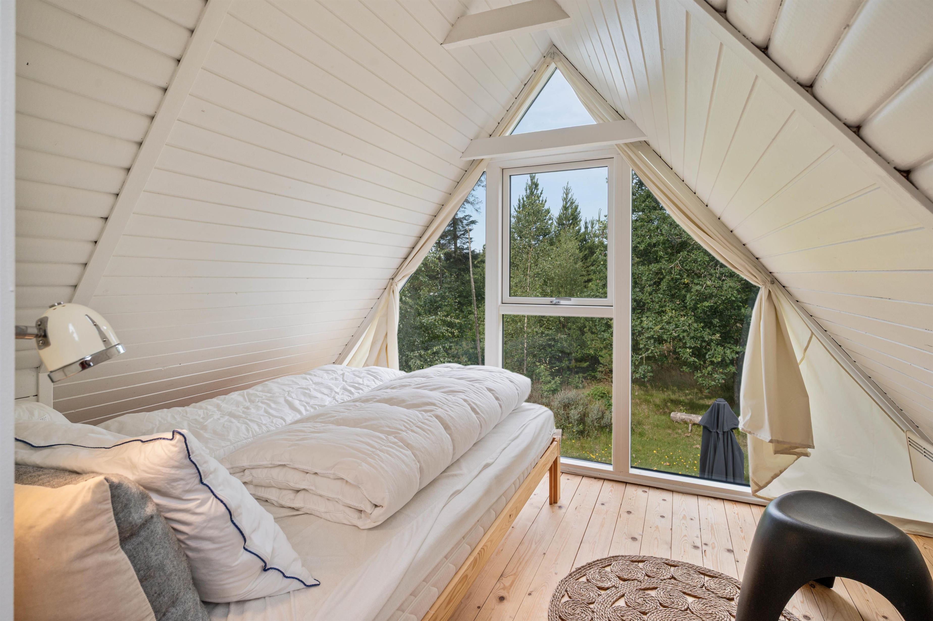 På sommerhusets førstesal finder I 2 soveværelser. Det ene er indrettet med 2 enkeltsenge, mens der på det andet soveværelse er 1 dobbeltseng og 1 enkeltseng. De resterende 2 sovepladser finder I i annekset, hvor der står en dobbeltseng klar til jer.