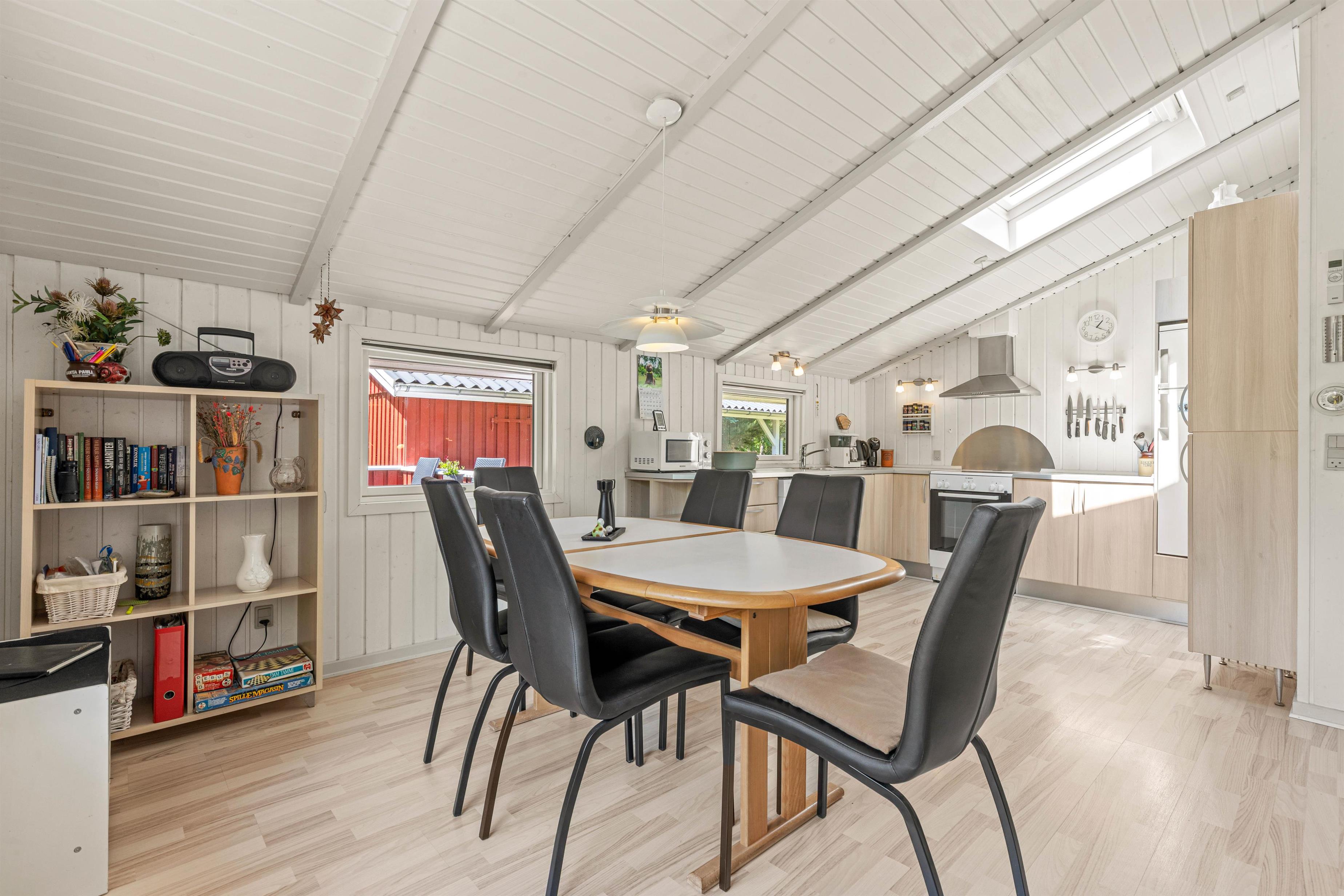 Det røde træhus udstråler idyl på bedste vis, og også indvendigt finder I venlige og lyse omgivelser, hvor I vil falde godt til fra start. Indenfor finder I en stor køkken- og spisestueafdeling, hvor hele familien kan nyde en lækker middag eller samles til en hyggelig filmaften på sofaen.