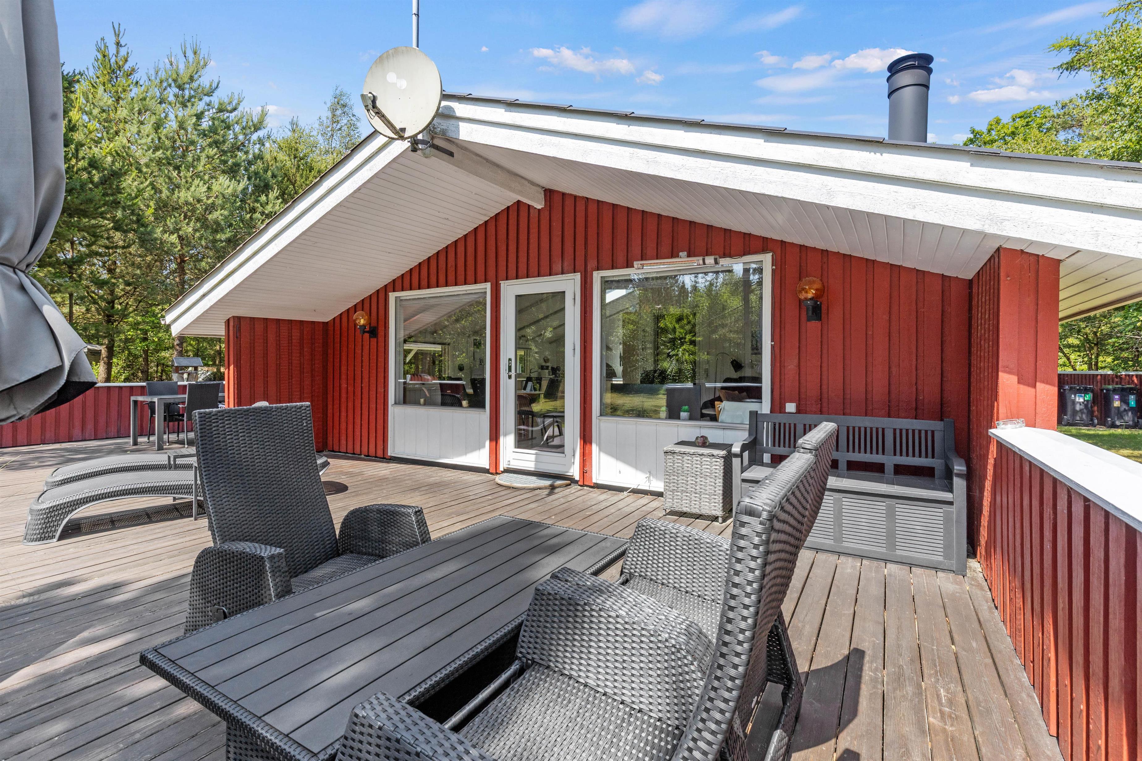 På den store og overdækkede terrasser er der rigelig med plads til at slappe af og nyde solstrålerne fra liggestolene, og grillen står klar, så I kan tilberede et rigtigt feriemåltid om aftenen.