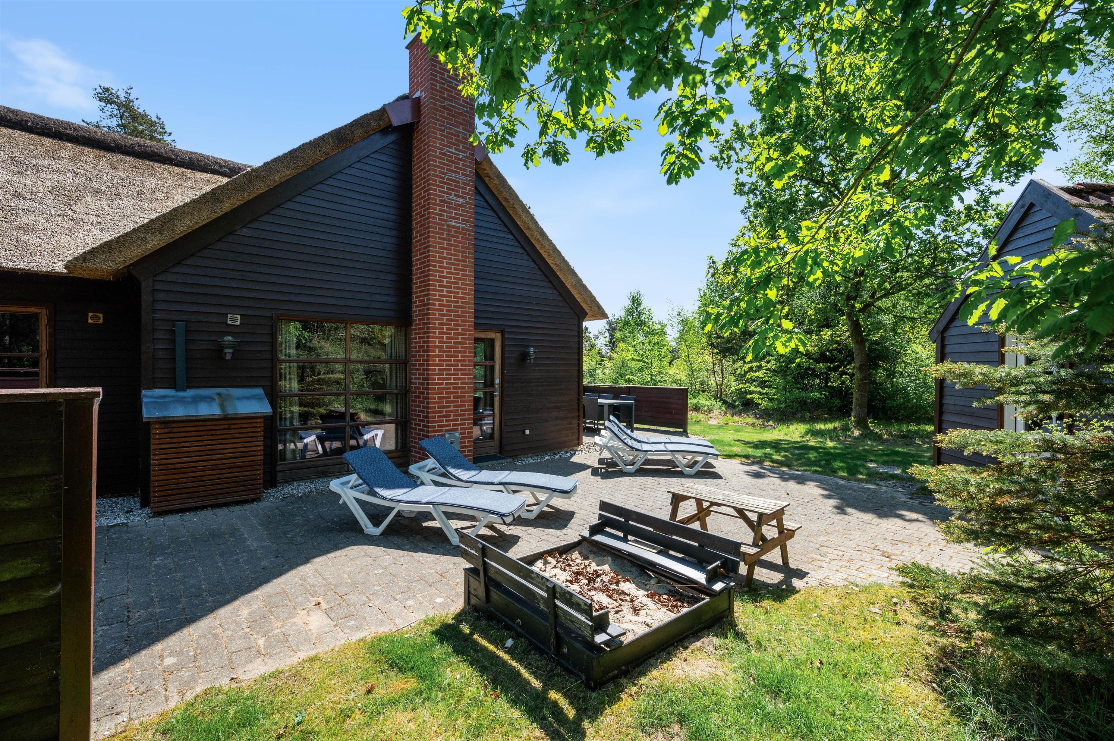Omkring sommerhuset løber en stor, delvist afskærmet terrasse, hvor I har god plads at tilbringe ferien udendørs på. Med liggestole, havemøbler og grill til rådighed kan I tilbringe ferien på terrassen fra morgenstund til sen aften. Sommerhusets grund er omgivet af træer, så I har masser af privatliv under ferien.