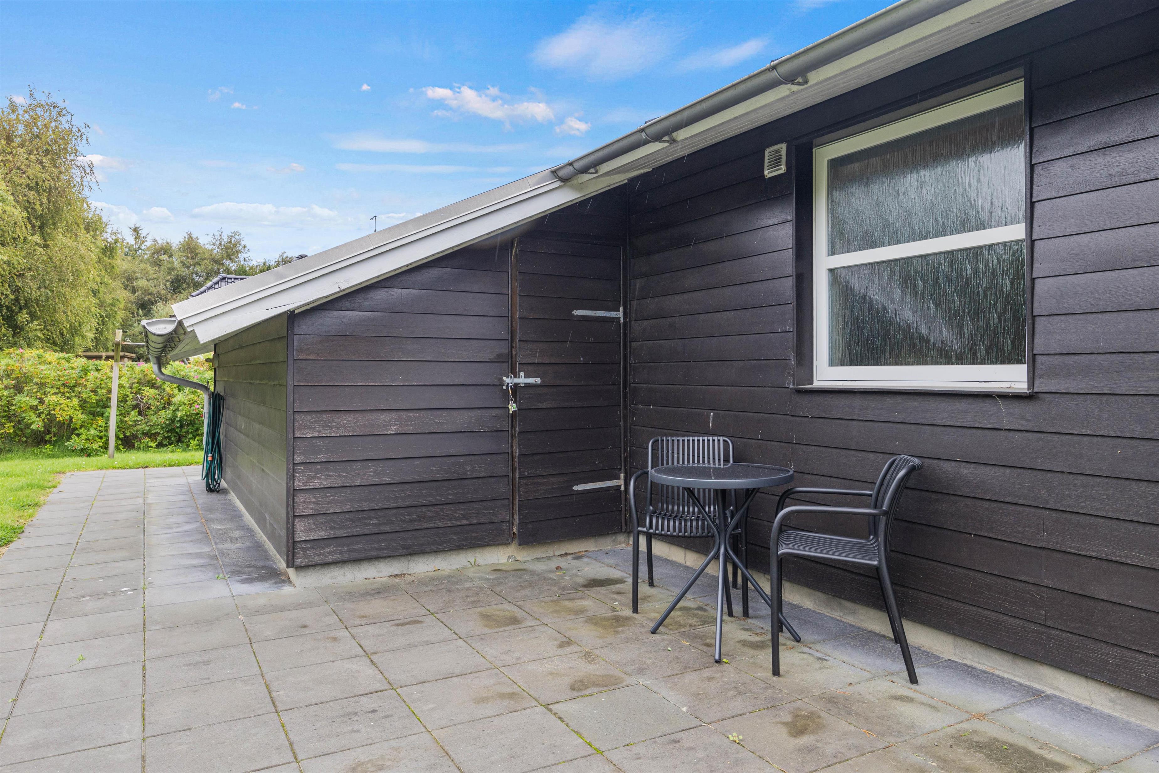 Sommerhuset byder på en afskærmet og delvist overdækket terrasse, der giver mulighed for at nyde udendørslivet i fulde drag, uanset vejret. Fra stuen kan I træde direkte ud på terrassen og lade den friske luft og den smukke natur strømme ind.