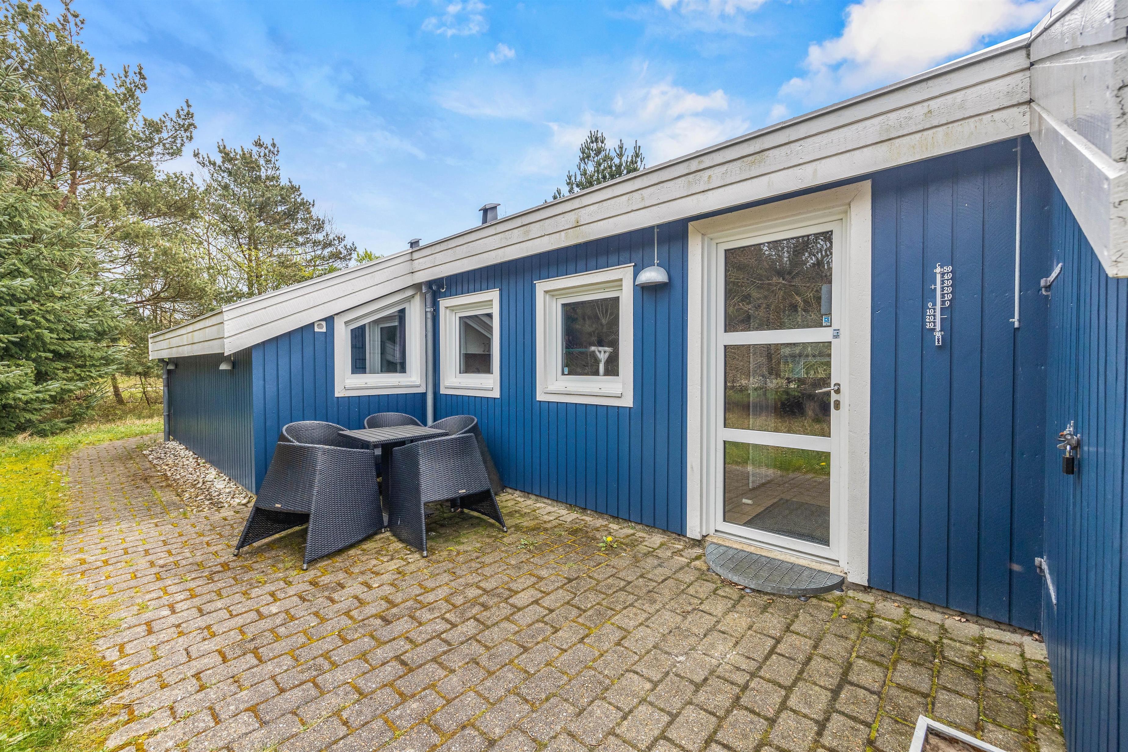 Den delvist overdækkede og afskærmede terrasse omkring sommerhuset er en oase af komfort og hygge. Her er alt, hvad I behøver for en perfekt ferieoplevelse. Fra komfortable havemøbler til afslappende solvogne, parasol og en grill - ideelt til hyggelige aftener under åben himmel.