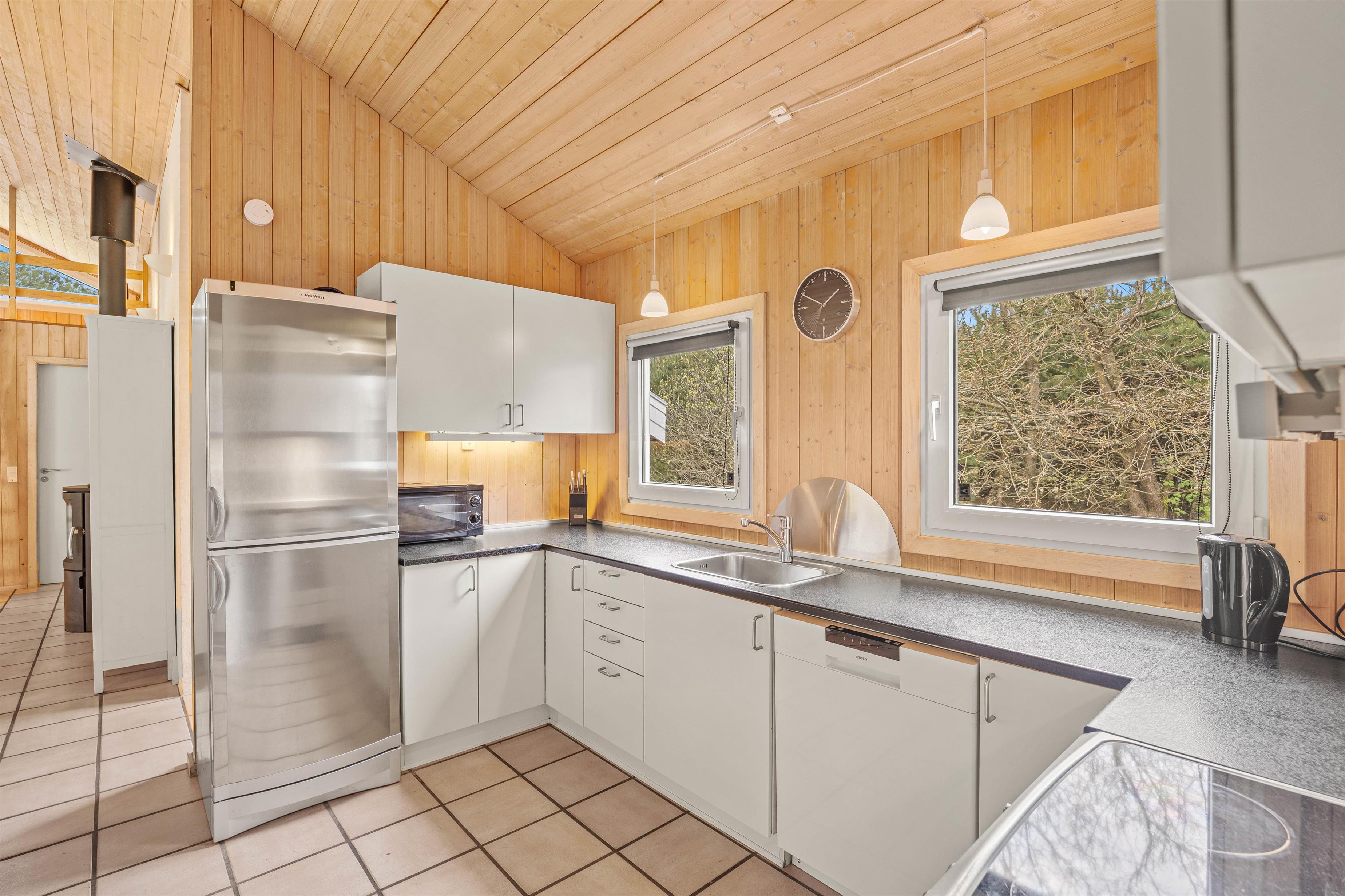 I dette sommerhus er køkkenet åbent og indbydende, forbundet med stuen, så I kan lave mad og hygge jer med familien, mens I sidder om spisebordet og spiller kort. Og med den praktiske opvaskemaskine er oprydningen en leg efter de gode måltider.