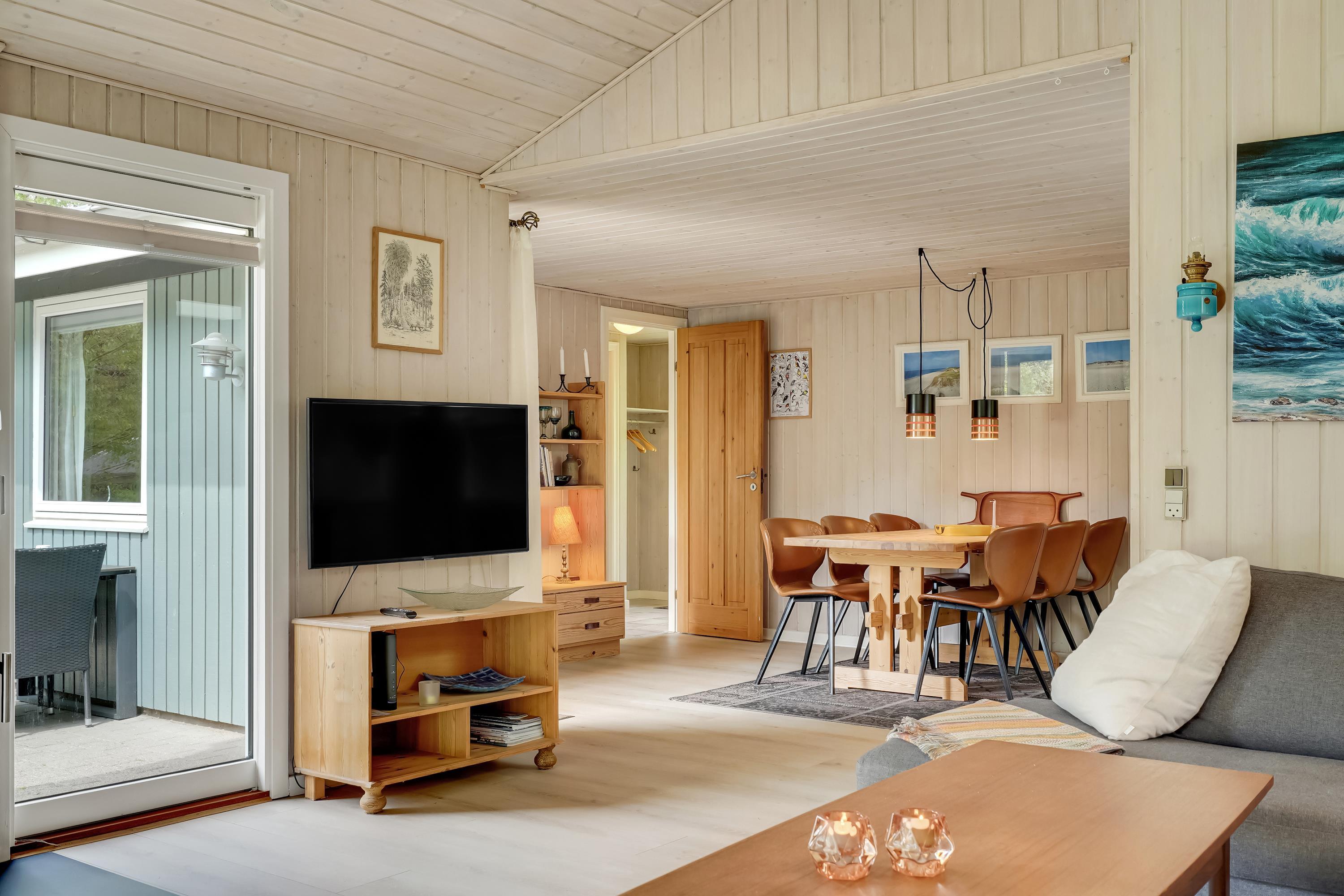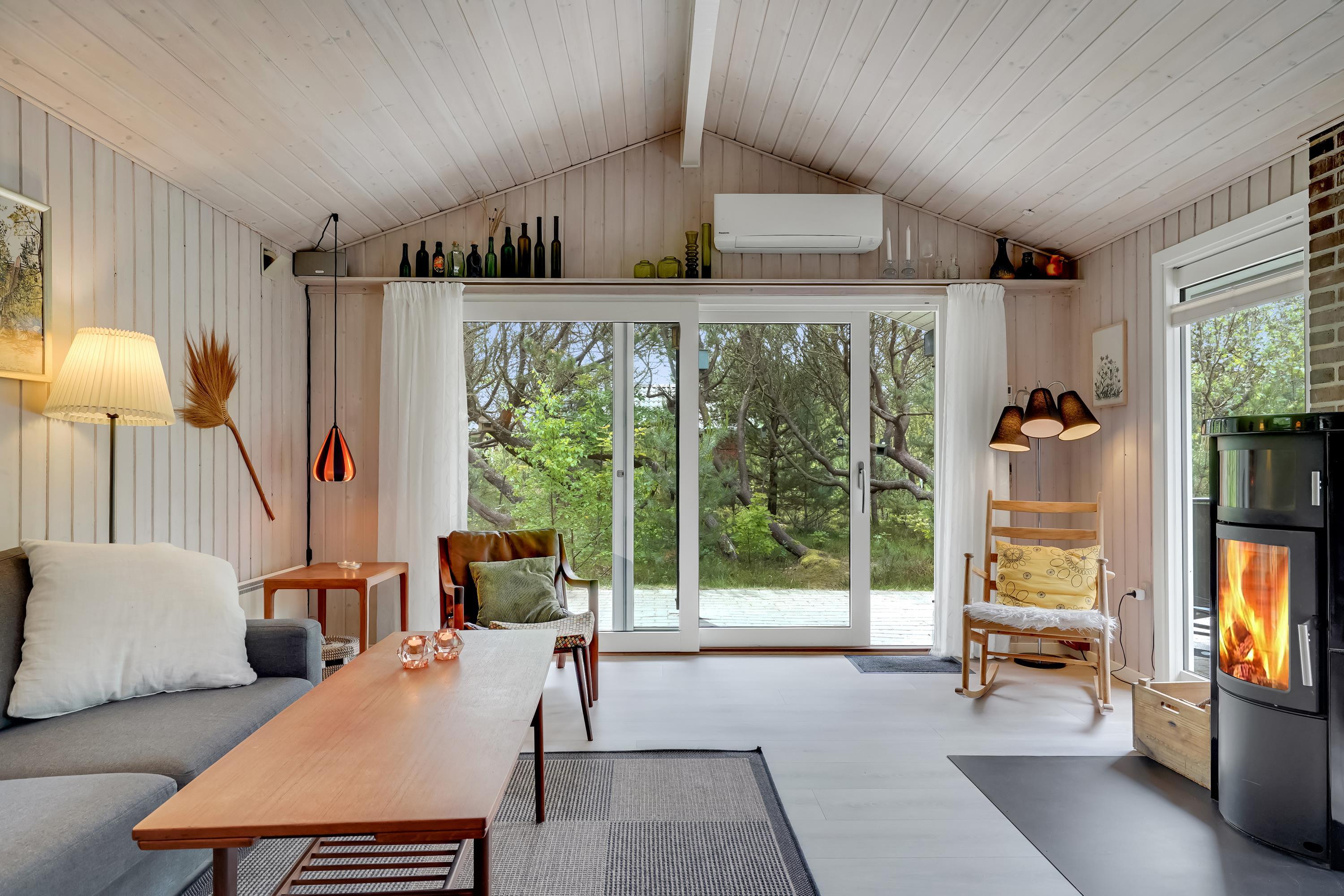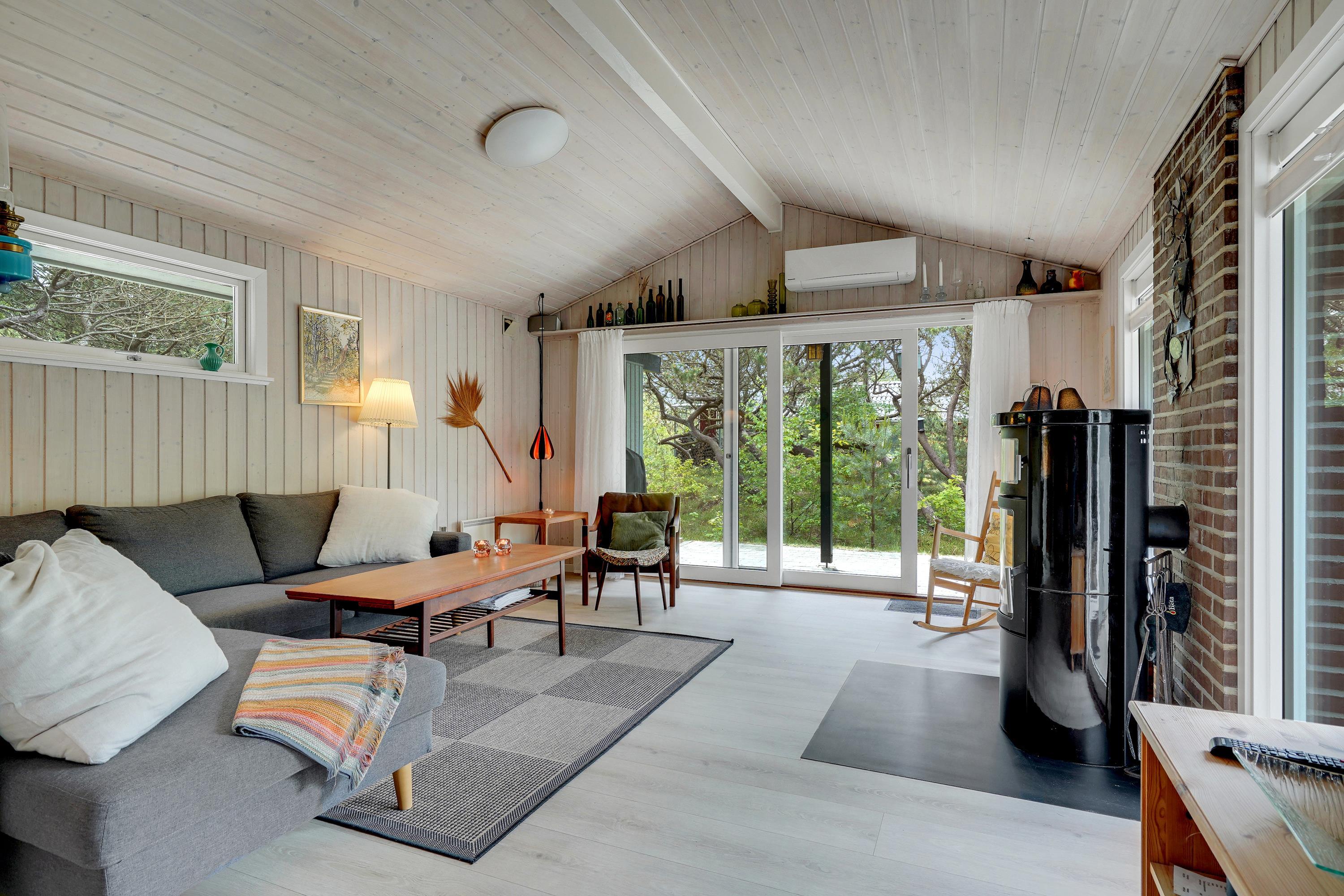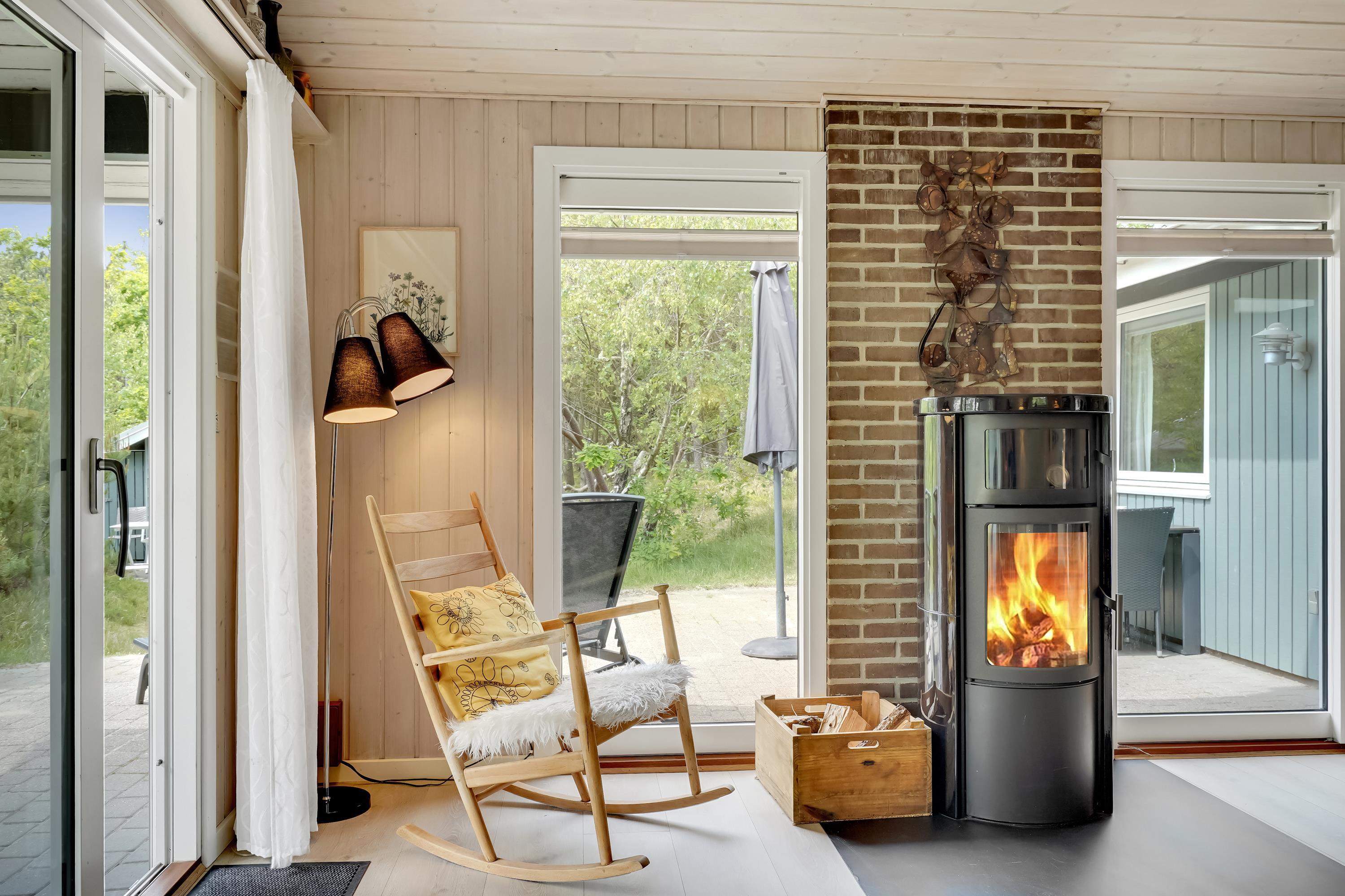 En hyggelig stue med brændeovn, varmepumpe og TV – det perfekte sted at slappe af i komfortable møbler. Desuden DVD og CD afspiller.