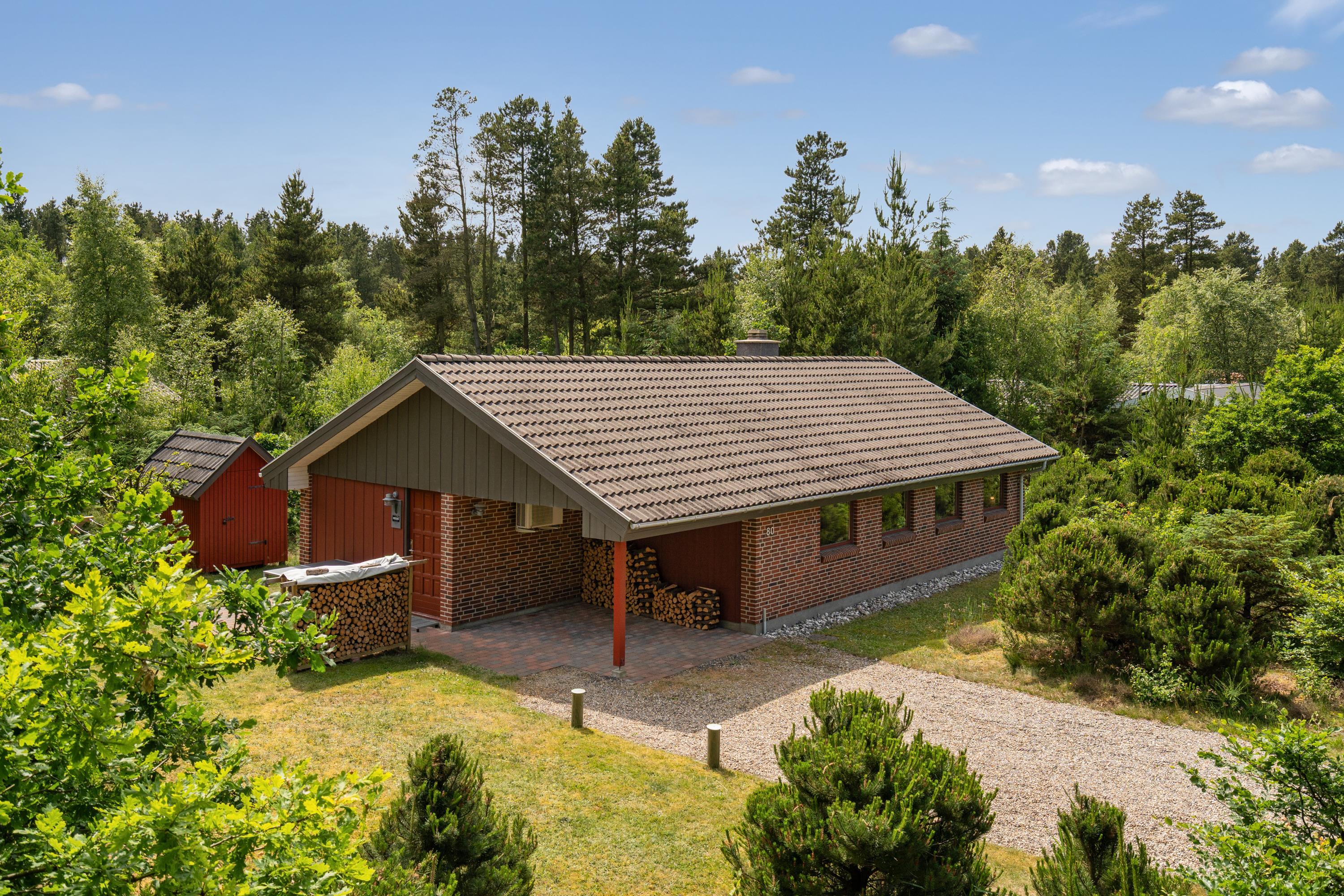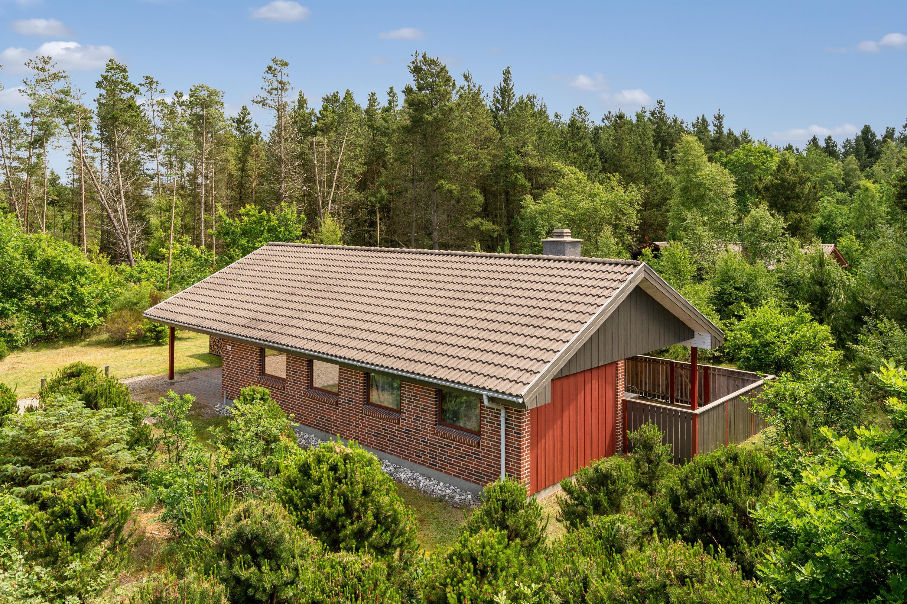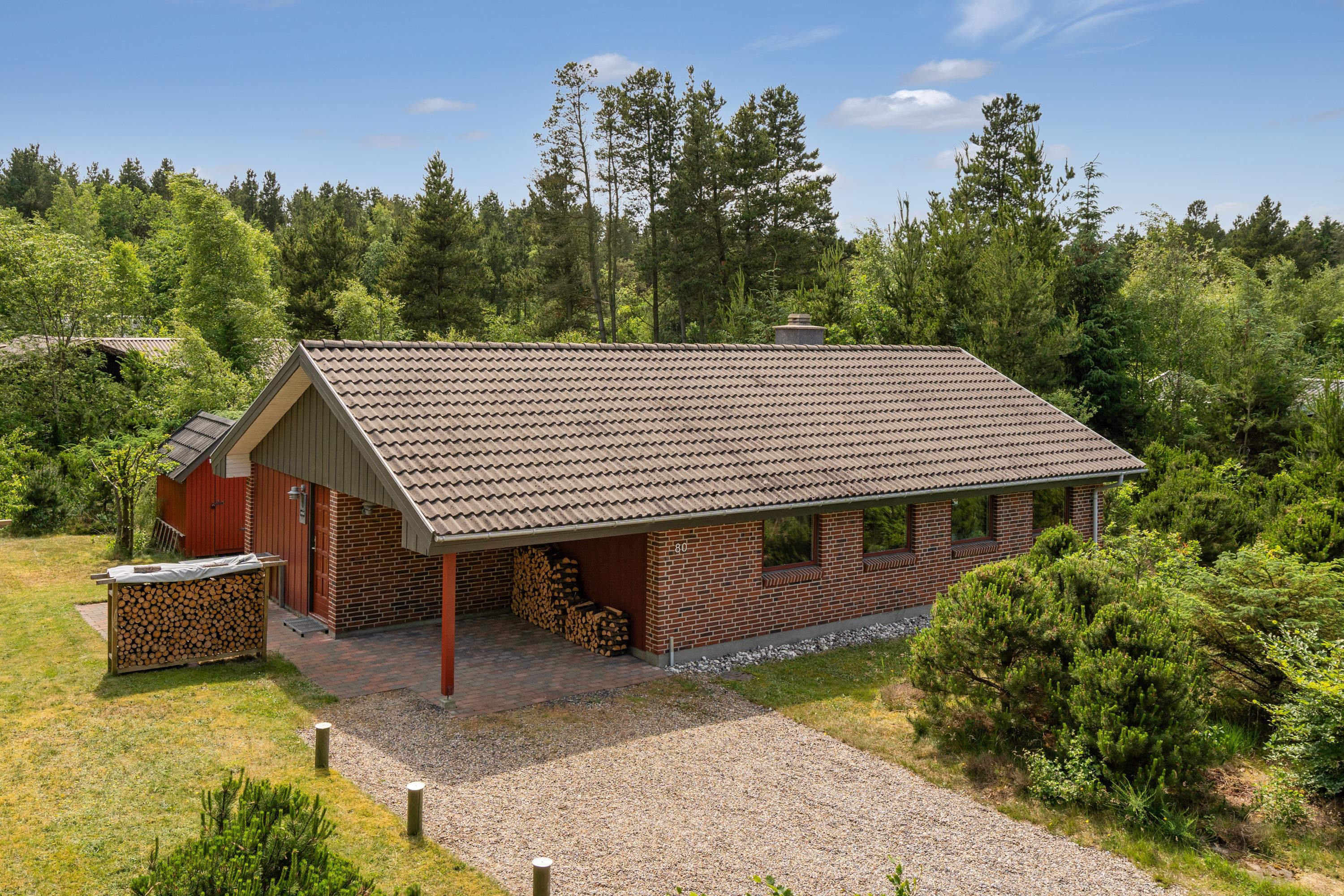 **Huset udlejes med forbrug af varme, vand, strøm inkluderet. Sengelinned og håndklæder ligger klar i huset ved ankomst**For ende af vej i naturskønne omgivelser, kan du booke Skovvang 80, som har direkte sti til Blåbjerg Plantage, hvor du kan nyde lange gå- eller cykelture. Tag hunden med, der er nok at snuse til. Huset byder på 2 soverum med henholdsvis dobbeltsenge og enkeltsenge. Et nyere badeværelse med gulvvarme og sauna. Et åbent køkkenalrum i forbindelse med stuen med brændeovn, varmepumpe og TV. Her findes et viktualierum til opbevaring samt adgang til skur, evt. til jeres medbragte cykler. Grunden er med varierende beplantning, masser af muligheder, hvad enten I søger læ, sol eller skygge. Terrasserne er såvel overdækket som åbne.