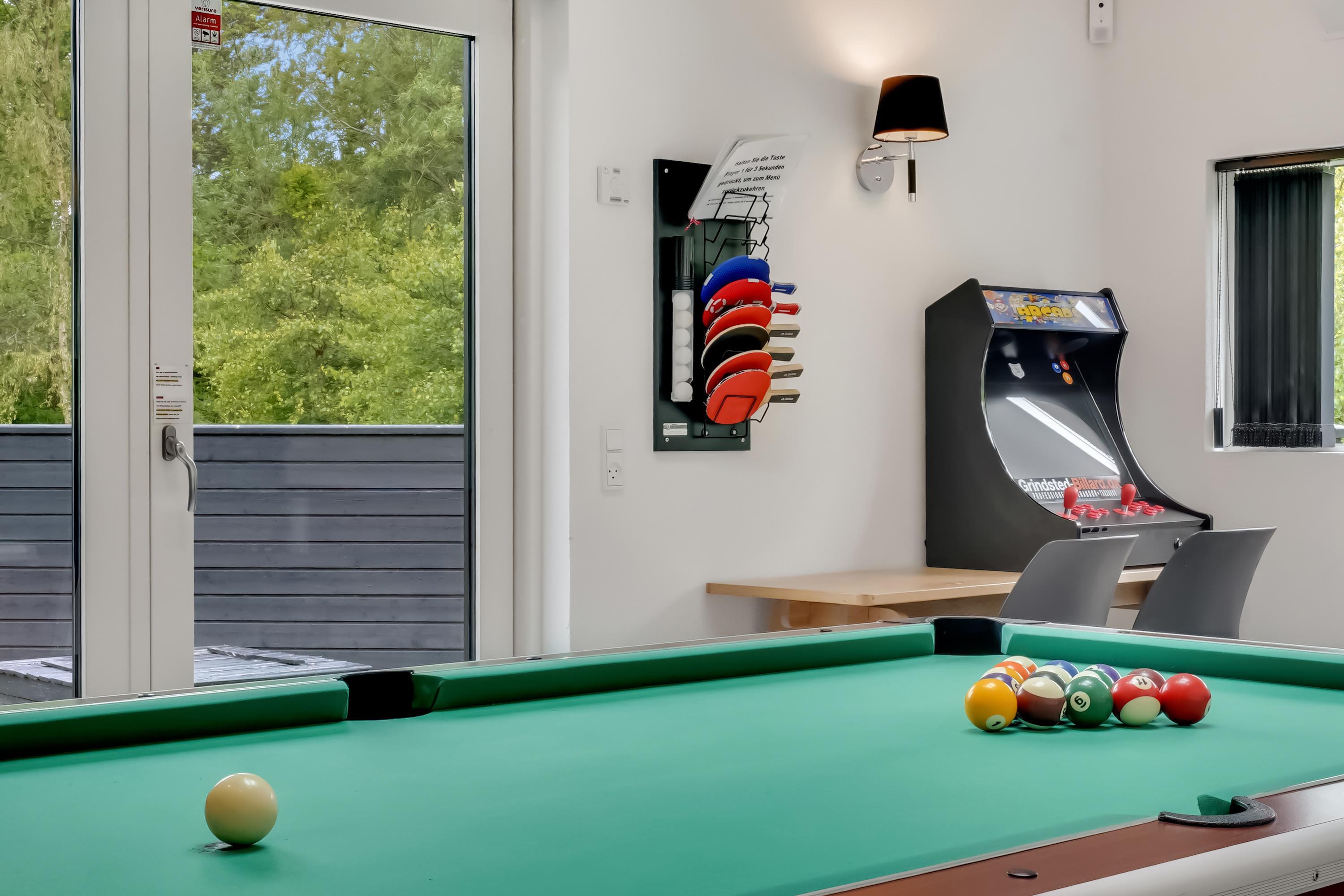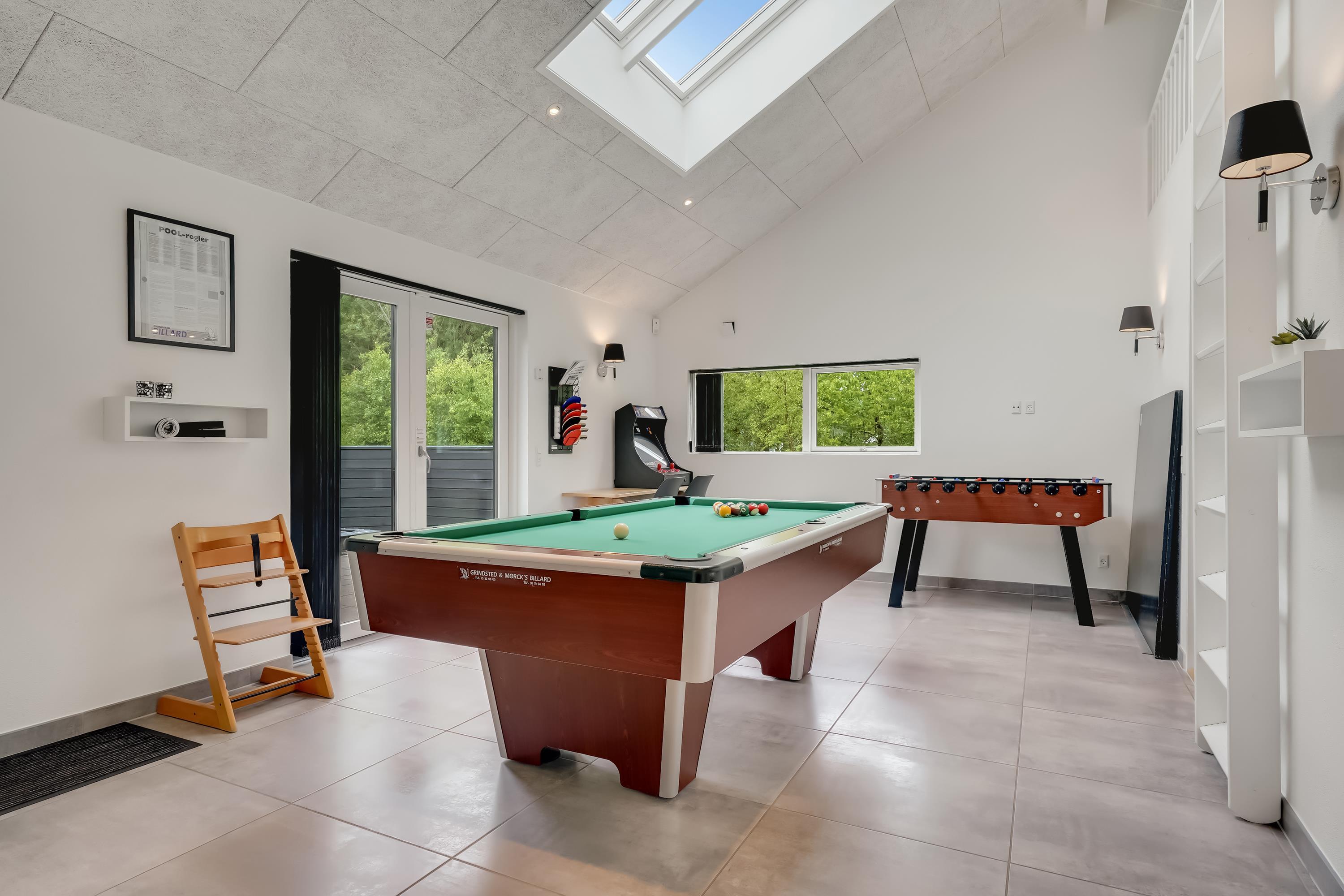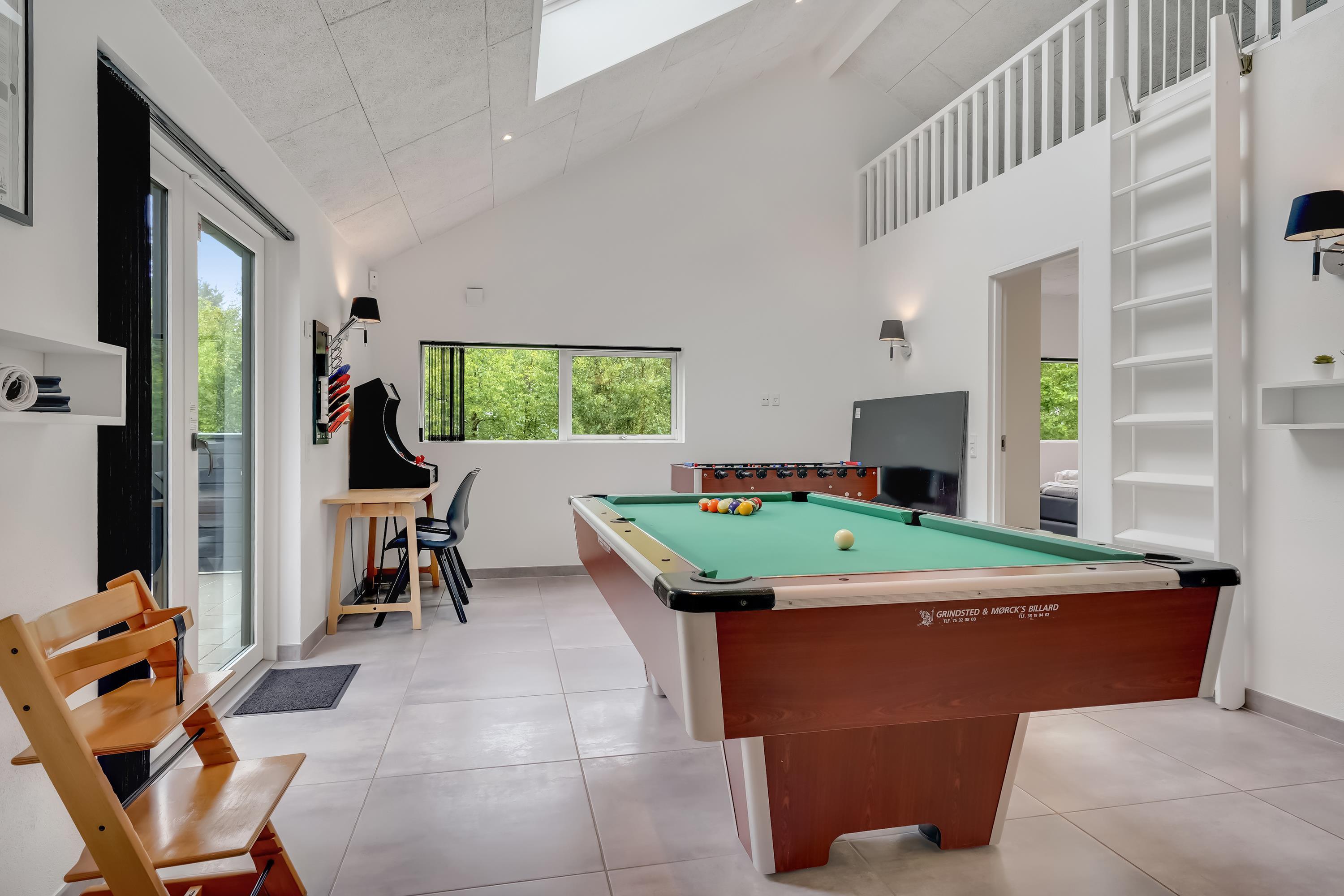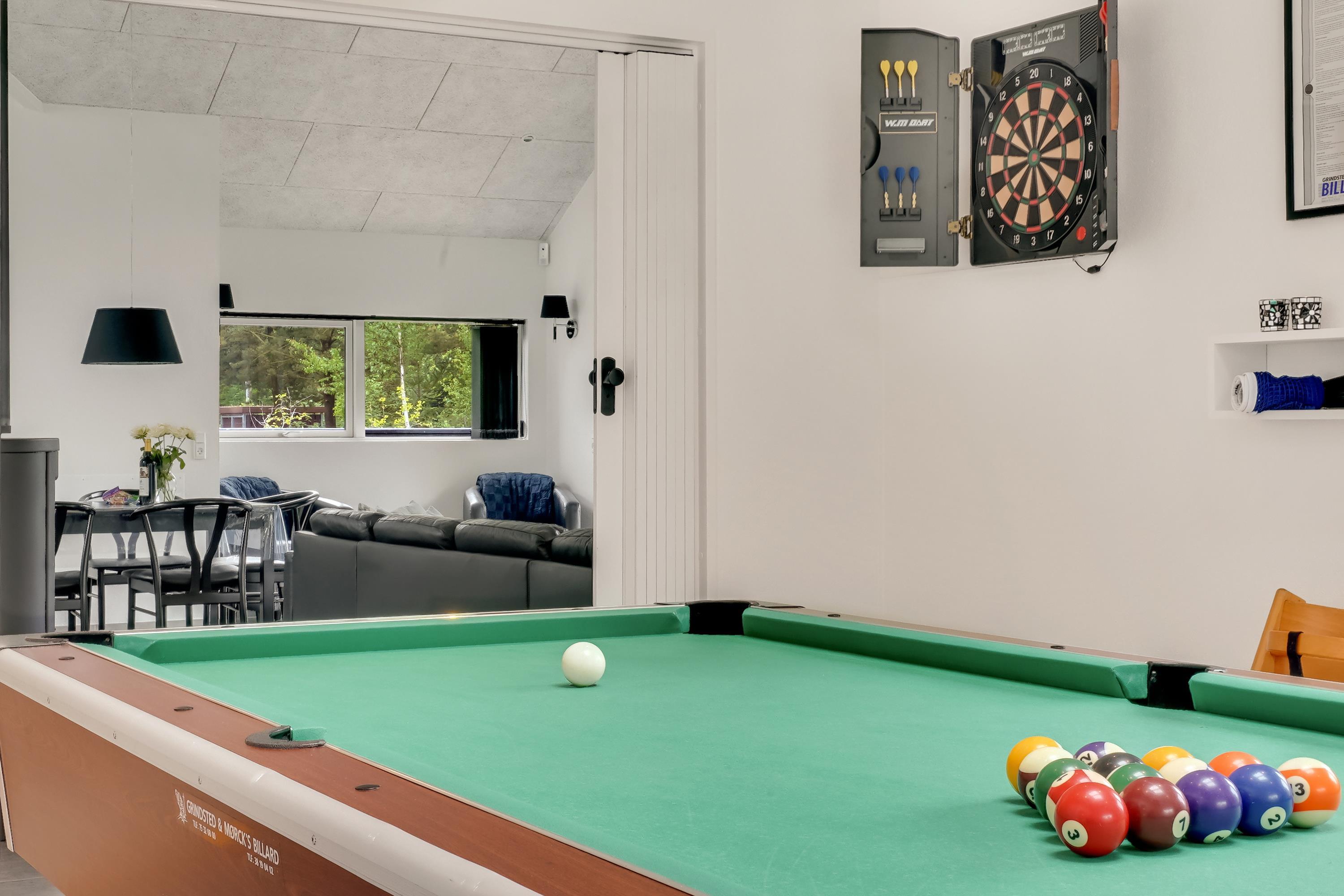 HUSET UDLEJES MED GRATIS FORBRUG, LINNED OG HÅNDKLÆDER VED ANKOMST SAMT OBLIGATORISK RENGØRING. Aktivitetshus med faciliteter som billard, bordfodbold, bordtennis, spillemaskine og dart, beliggende på en indhegnet grund på Hedevang 22. Dette nyere kvalitetsbyggeri er placeret i et fuldt udviklet feriehusområde. Det har et SEPARAT AKTIVITETSRUM, hvor hele familien kan nyde tid sammen med sjove spil og afslapning. Med sine 150 m2 tilbyder huset masser af plads til to familier. Der er to afdelinger, hver med to soveværelser og et badeværelse. Derudover er der wellness-faciliteter med spa og infrarød sauna, og det store badeværelse har to brusere. Puslebord til de mindste.