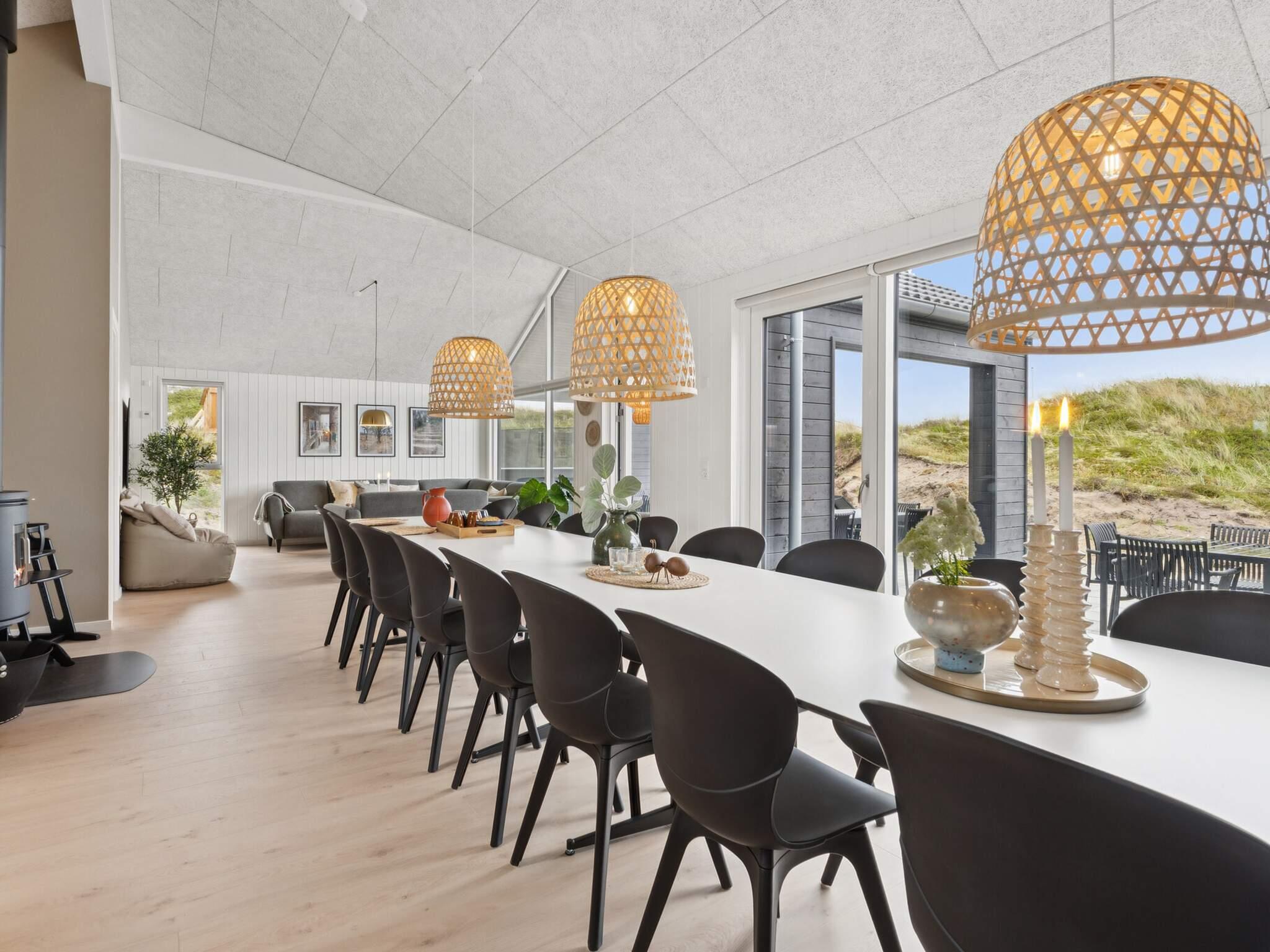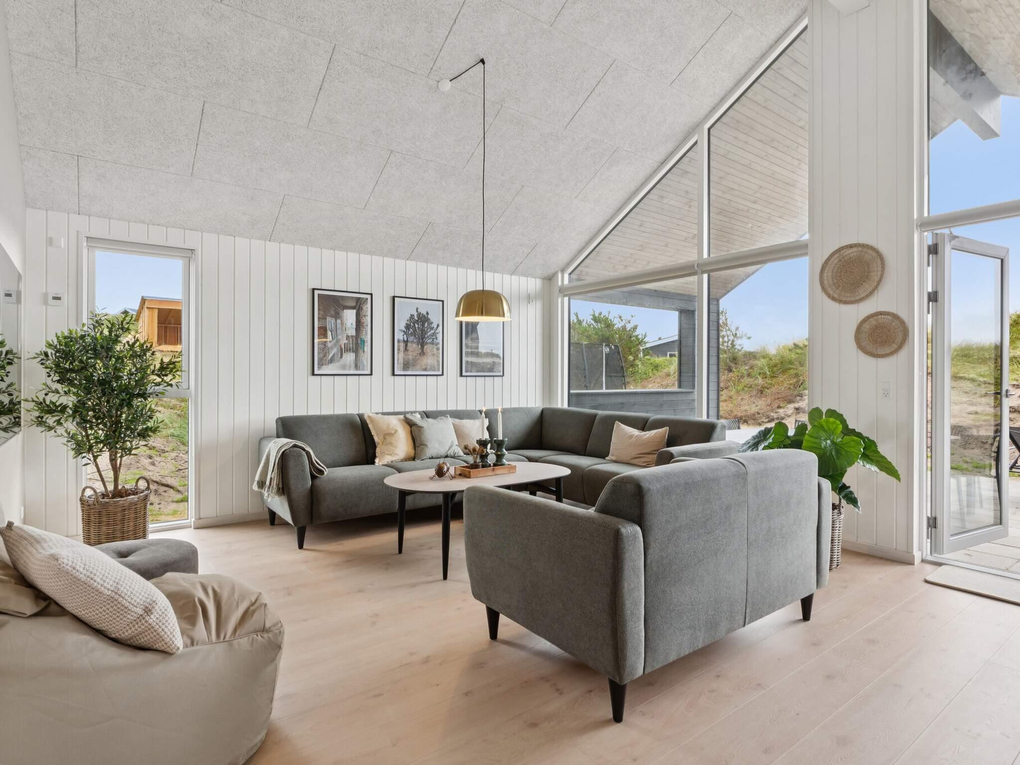 Udendørs kan I slappe af på husets store terrasse, som er en oase af velvære. Her står et træopbygget spabad med udebruser, hvor I kan nyde varme bobler under åben himmel. Lige ved siden af spabadet finder I en sauna, ideel til at varme sig op efter en forfriskende dukkert i havet. På den overdækkede terrasse kan I samles omkring langbordet til hyggelige grillaftener, mens børnene kan have det sjovt på trampolinen eller gyngerne i haven. Fra terrassen er der en betagende udsigt over de omkringliggende klitter, og med kun fem minutters gang til stranden, kan I hurtigt nyde sol, sand og hav. Sommerhuset har også et hyggeligt shelter, hvor I kan tilbringe natten under åben himmel og nyde den smukke solnedgang.
