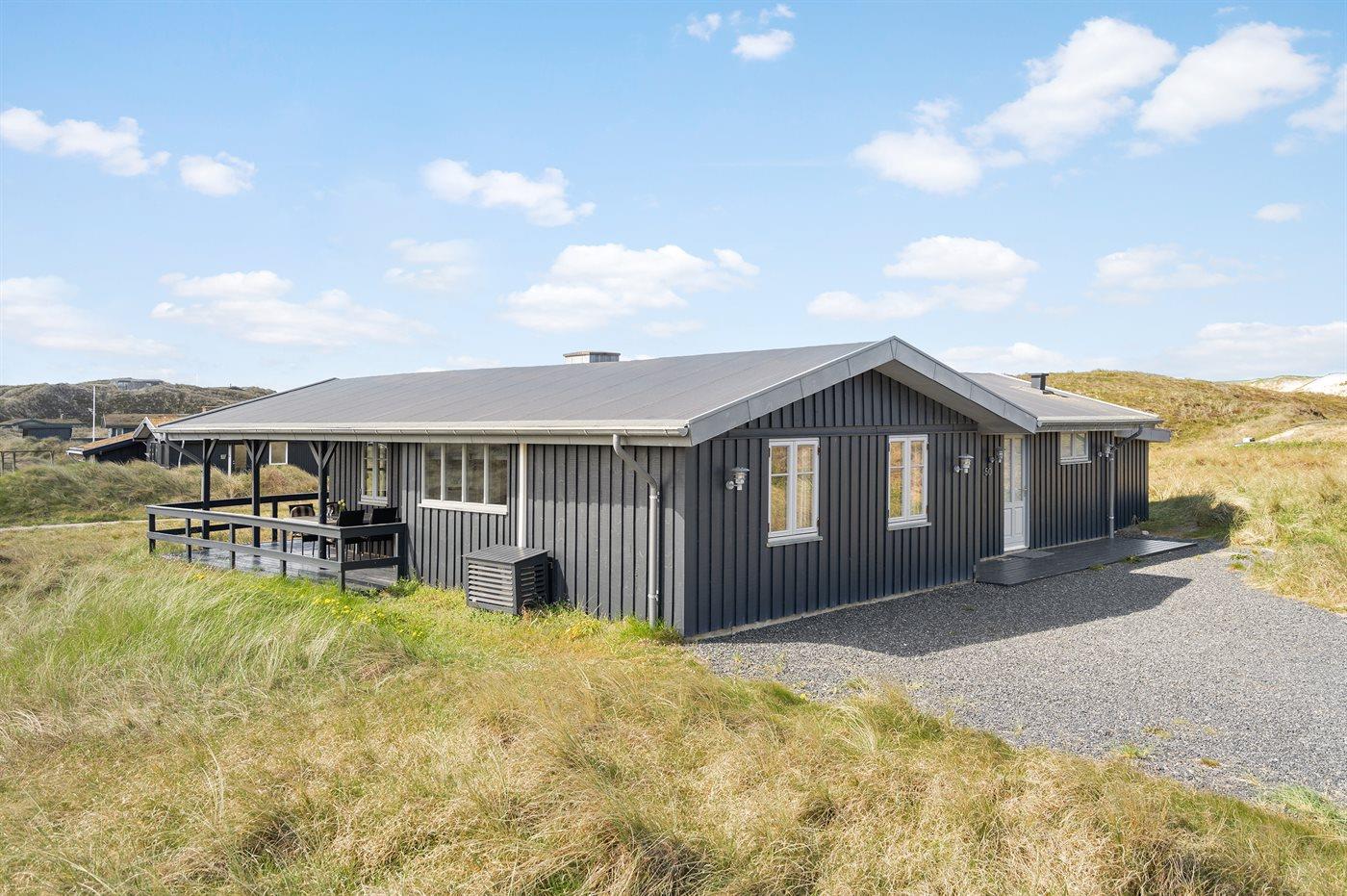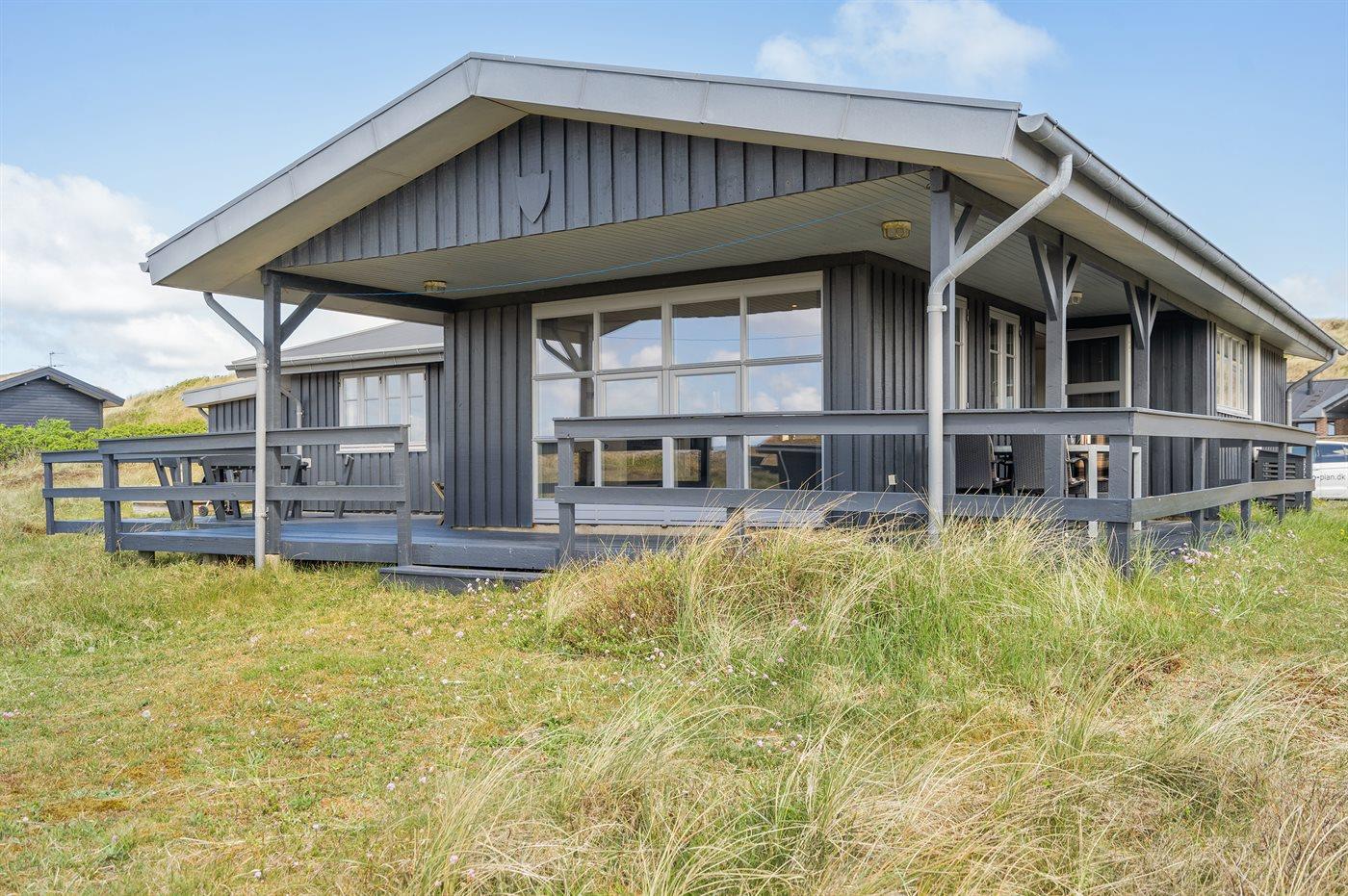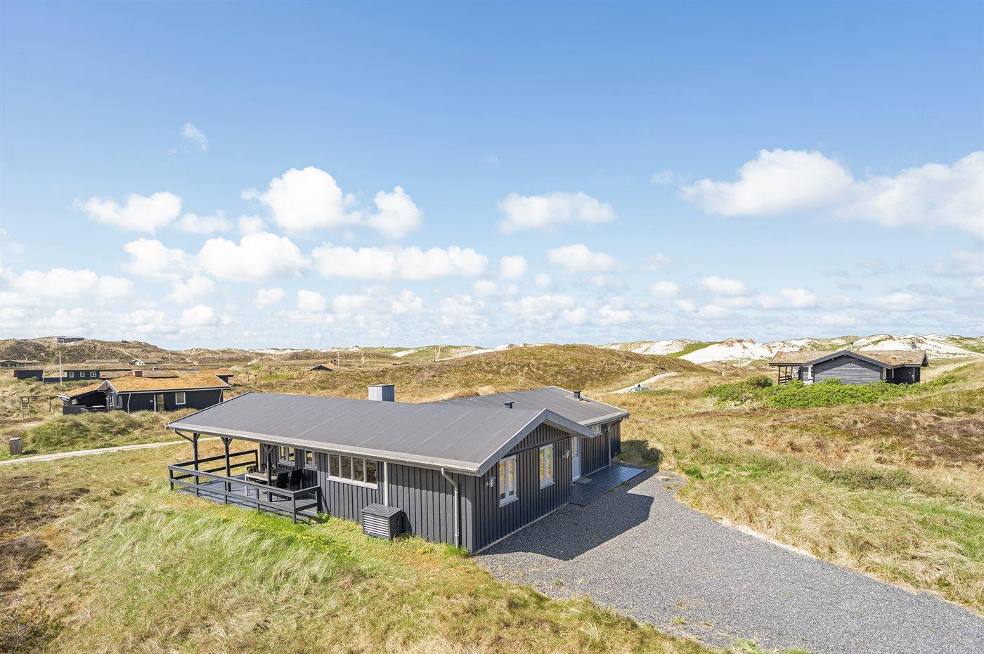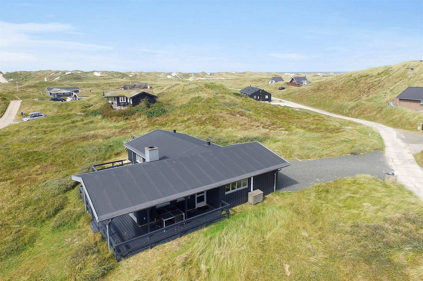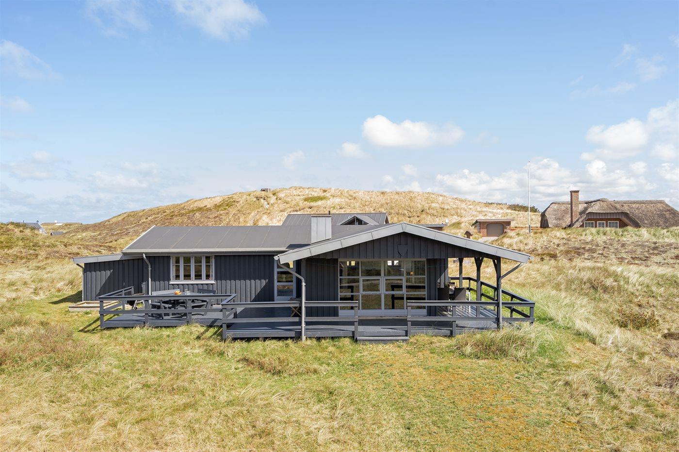 På en dejlig, kuperet klitgrund, kun 200 m fra Vesterhavet, ligger dette dejlige og velholdte sommerhus i træ, bygget i 1980 og løbende moderniseret, senest i 2010. Gode åbne og overdækkede terrassearealer med havemøbler, hvor man kan nyde udsigten over det naturskønne klitområde. Trævægge og -lofter. Gulvtæpper overalt, dog klinkegulv i køkken-alrum. Dejligt badeværelse med bruseniche og gulvvarme. Vaskemaskine og tørretumbler. Sauna. Moderne køkken med mikrobølgeovn, fryser, opvaskemaskine, varmluftovn samt komfur med keramiske kogeplader. Stor, hyggelig opholdsstue med brændeovn, TV med parabol (digital), DVD-afspiller og CD-afspiller. 3 soverum; 2 med dobbeltseng og 1 med 2 enkeltsenge. Desuden barneseng, 1 høj barnestole samt sandkasse til rådighed. Af yderligere udstyr kan gratis, trådløs internetforbindelse nævnes (computer skal medbringes) og der er installeret energibesparende varmepumpe/aircondition. Et dejligt sommerhus beliggende i et naturskønt område - få min. kørsel til badebyen Søndervig.