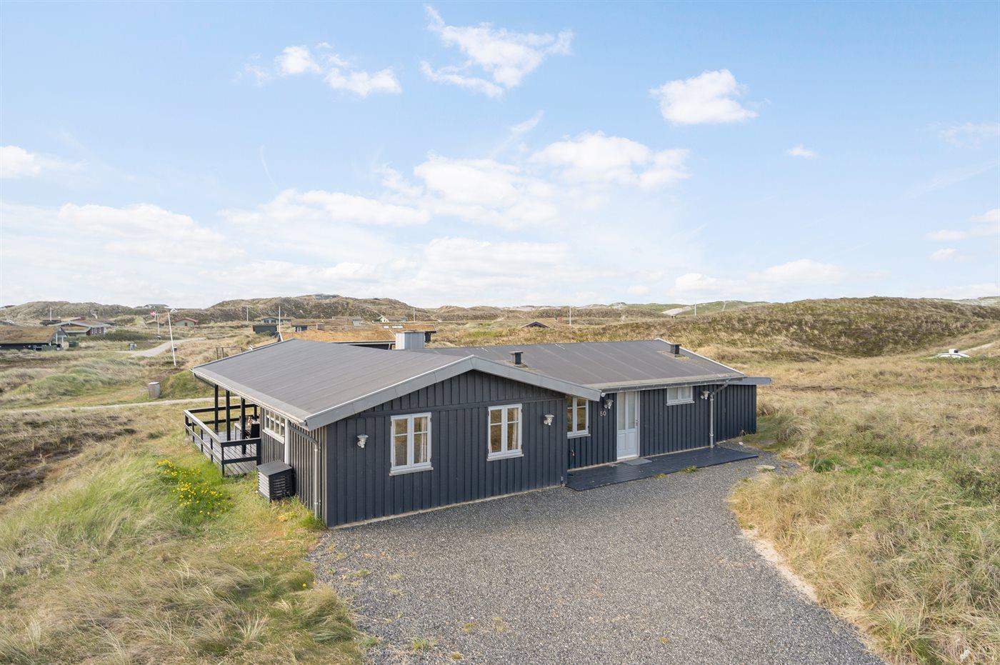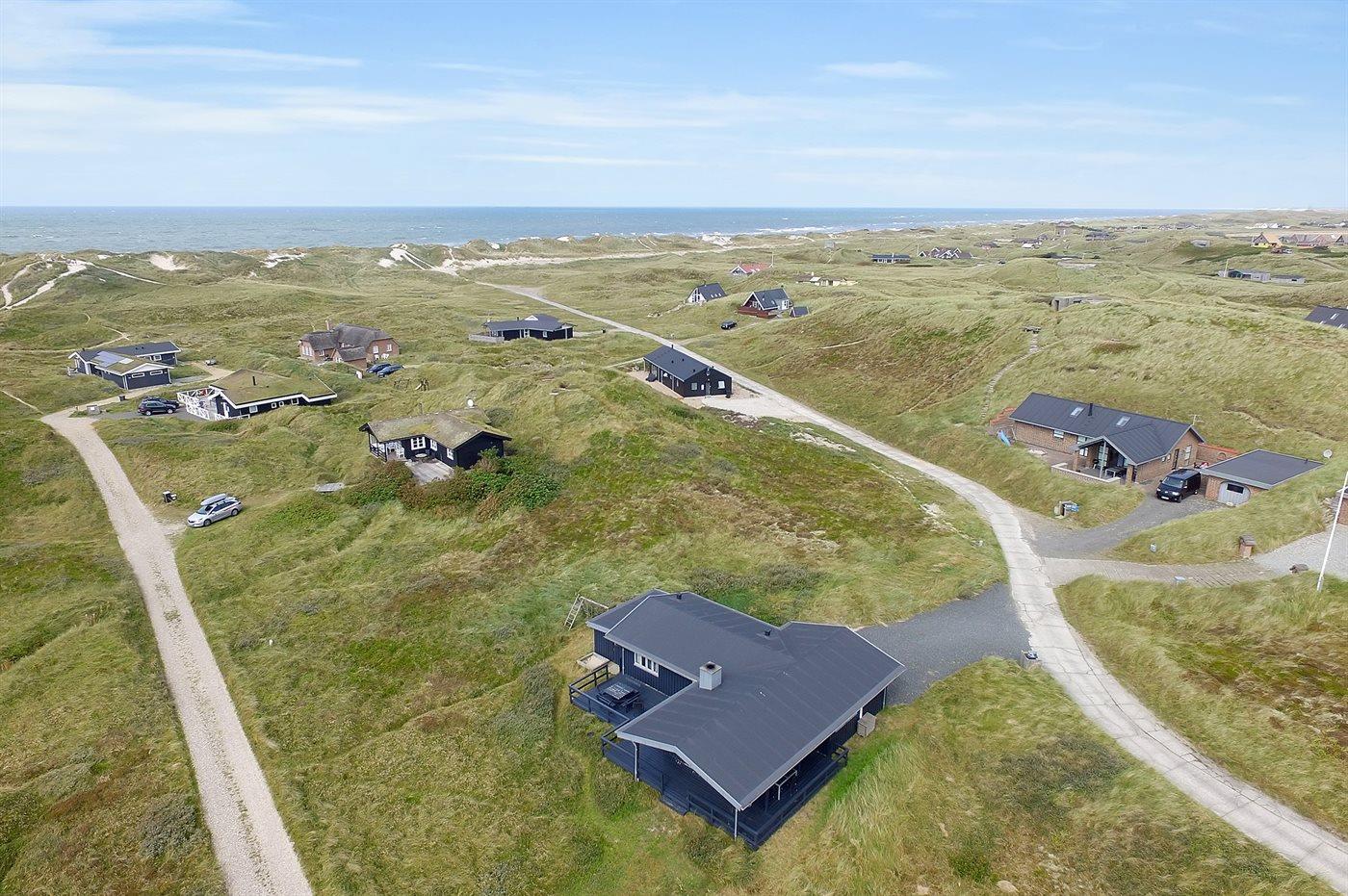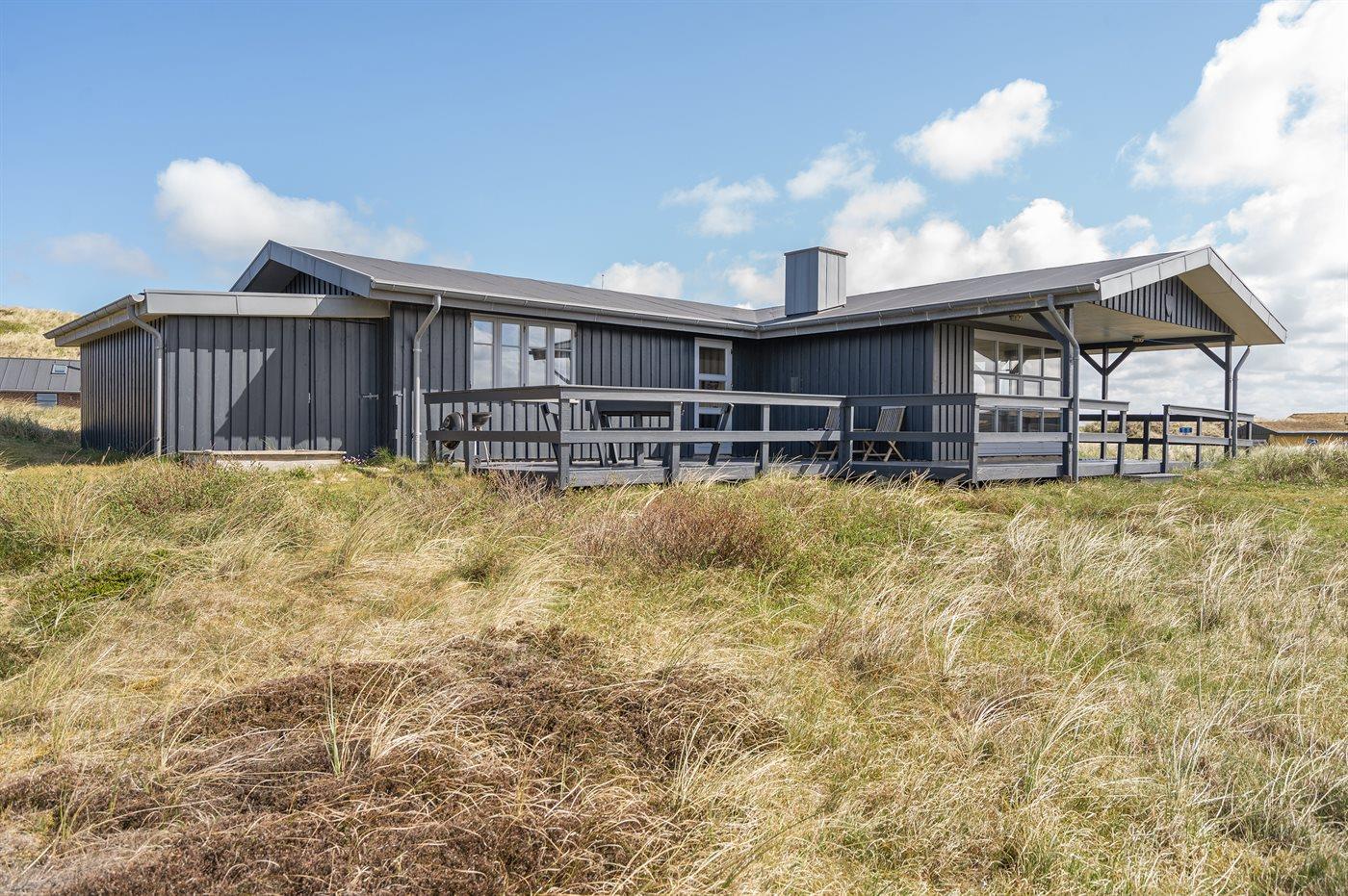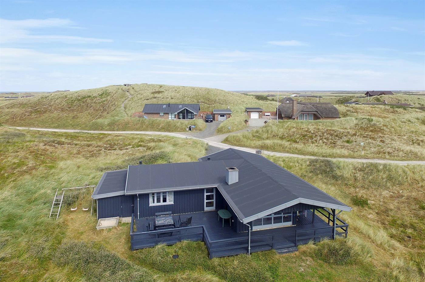 På en dejlig, kuperet klitgrund, kun 200 m fra Vesterhavet, ligger dette dejlige og velholdte sommerhus i træ, bygget i 1980 og løbende moderniseret, senest i 2010. Gode åbne og overdækkede terrassearealer med havemøbler, hvor man kan nyde udsigten over det naturskønne klitområde. Trævægge og -lofter. Gulvtæpper overalt, dog klinkegulv i køkken-alrum. Dejligt badeværelse med bruseniche og gulvvarme. Vaskemaskine og tørretumbler. Sauna. Moderne køkken med mikrobølgeovn, fryser, opvaskemaskine, varmluftovn samt komfur med keramiske kogeplader. Stor, hyggelig opholdsstue med brændeovn, TV med parabol (digital), DVD-afspiller og CD-afspiller. 3 soverum; 2 med dobbeltseng og 1 med 2 enkeltsenge. Desuden barneseng, 1 høj barnestole samt sandkasse til rådighed. Af yderligere udstyr kan gratis, trådløs internetforbindelse nævnes (computer skal medbringes) og der er installeret energibesparende varmepumpe/aircondition. Et dejligt sommerhus beliggende i et naturskønt område - få min. kørsel til badebyen Søndervig.