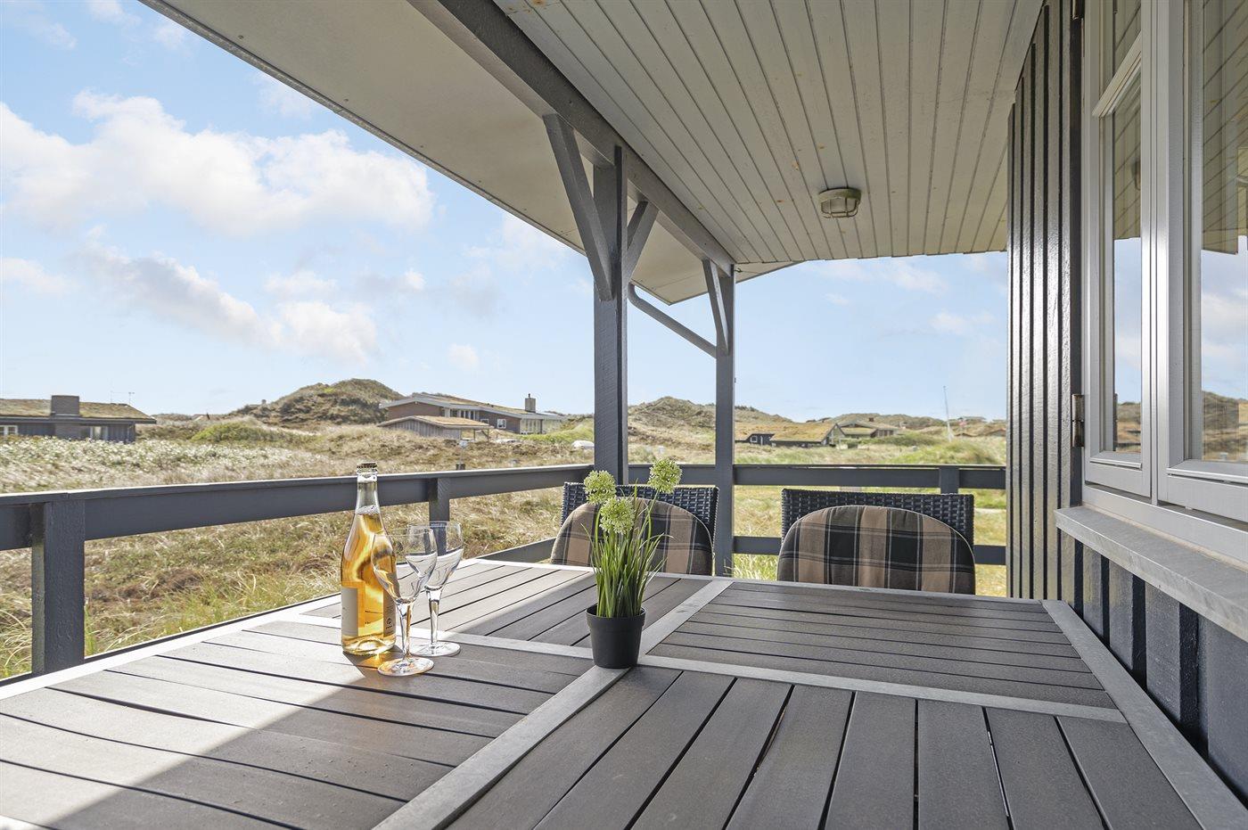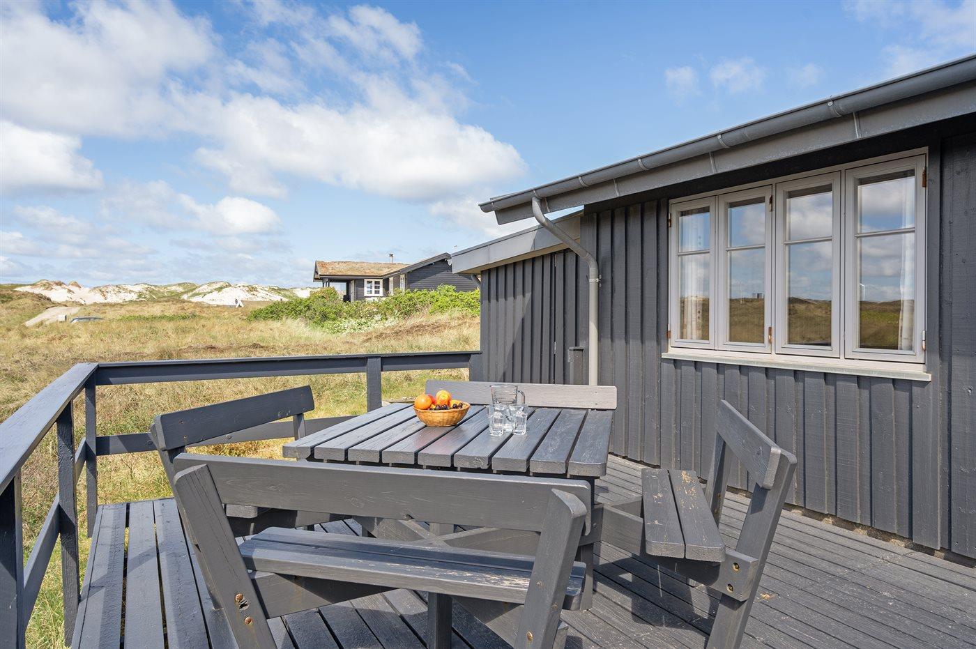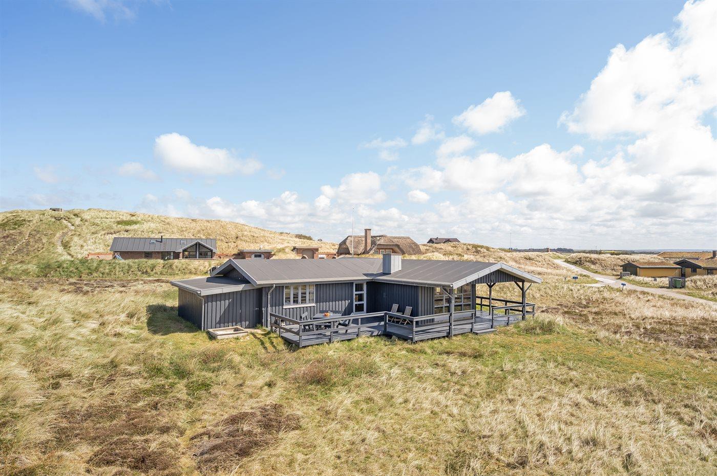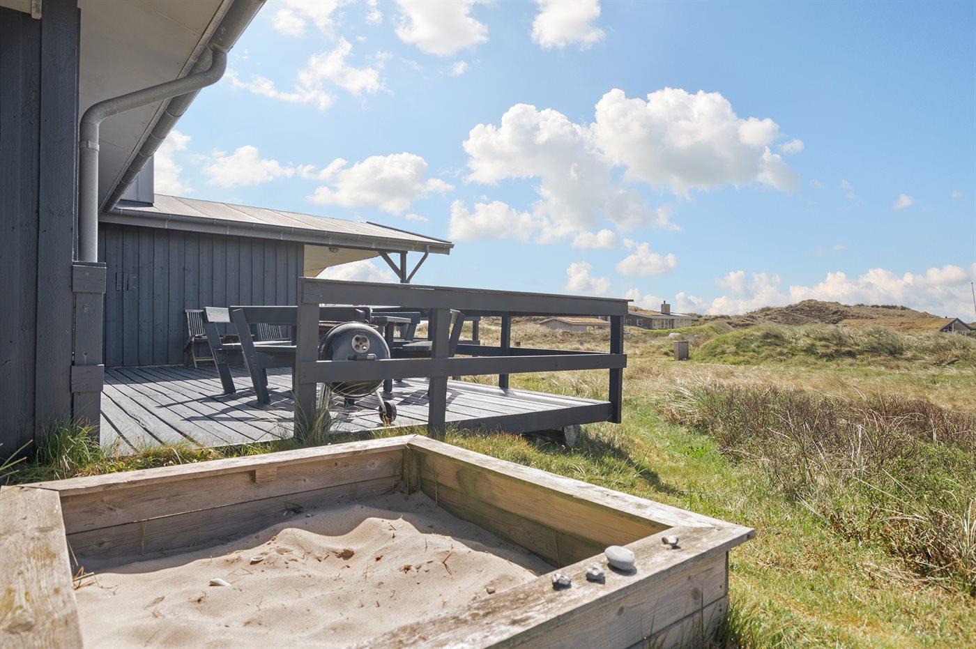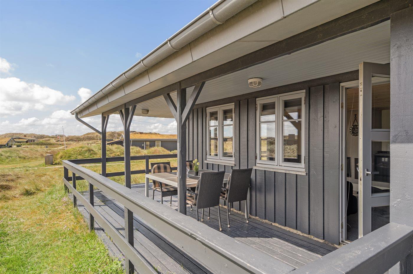 På en dejlig, kuperet klitgrund, kun 200 m fra Vesterhavet, ligger dette dejlige og velholdte sommerhus i træ, bygget i 1980 og løbende moderniseret, senest i 2010. Gode åbne og overdækkede terrassearealer med havemøbler, hvor man kan nyde udsigten over det naturskønne klitområde. Trævægge og -lofter. Gulvtæpper overalt, dog klinkegulv i køkken-alrum. Dejligt badeværelse med bruseniche og gulvvarme. Vaskemaskine og tørretumbler. Sauna. Moderne køkken med mikrobølgeovn, fryser, opvaskemaskine, varmluftovn samt komfur med keramiske kogeplader. Stor, hyggelig opholdsstue med brændeovn, TV med parabol (digital), DVD-afspiller og CD-afspiller. 3 soverum; 2 med dobbeltseng og 1 med 2 enkeltsenge. Desuden barneseng, 1 høj barnestole samt sandkasse til rådighed. Af yderligere udstyr kan gratis, trådløs internetforbindelse nævnes (computer skal medbringes) og der er installeret energibesparende varmepumpe/aircondition. Et dejligt sommerhus beliggende i et naturskønt område - få min. kørsel til badebyen Søndervig.
