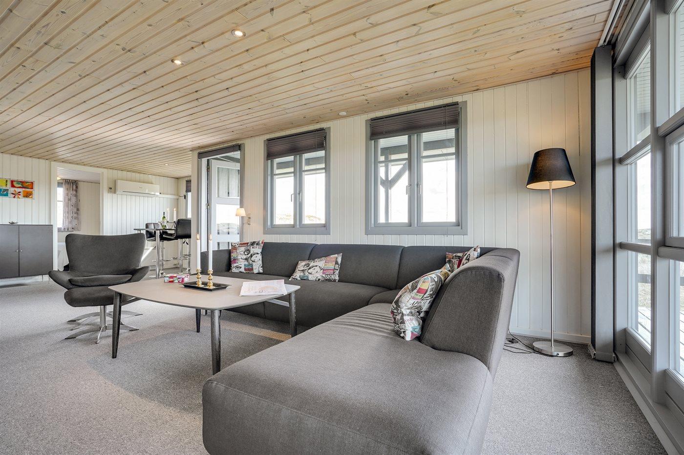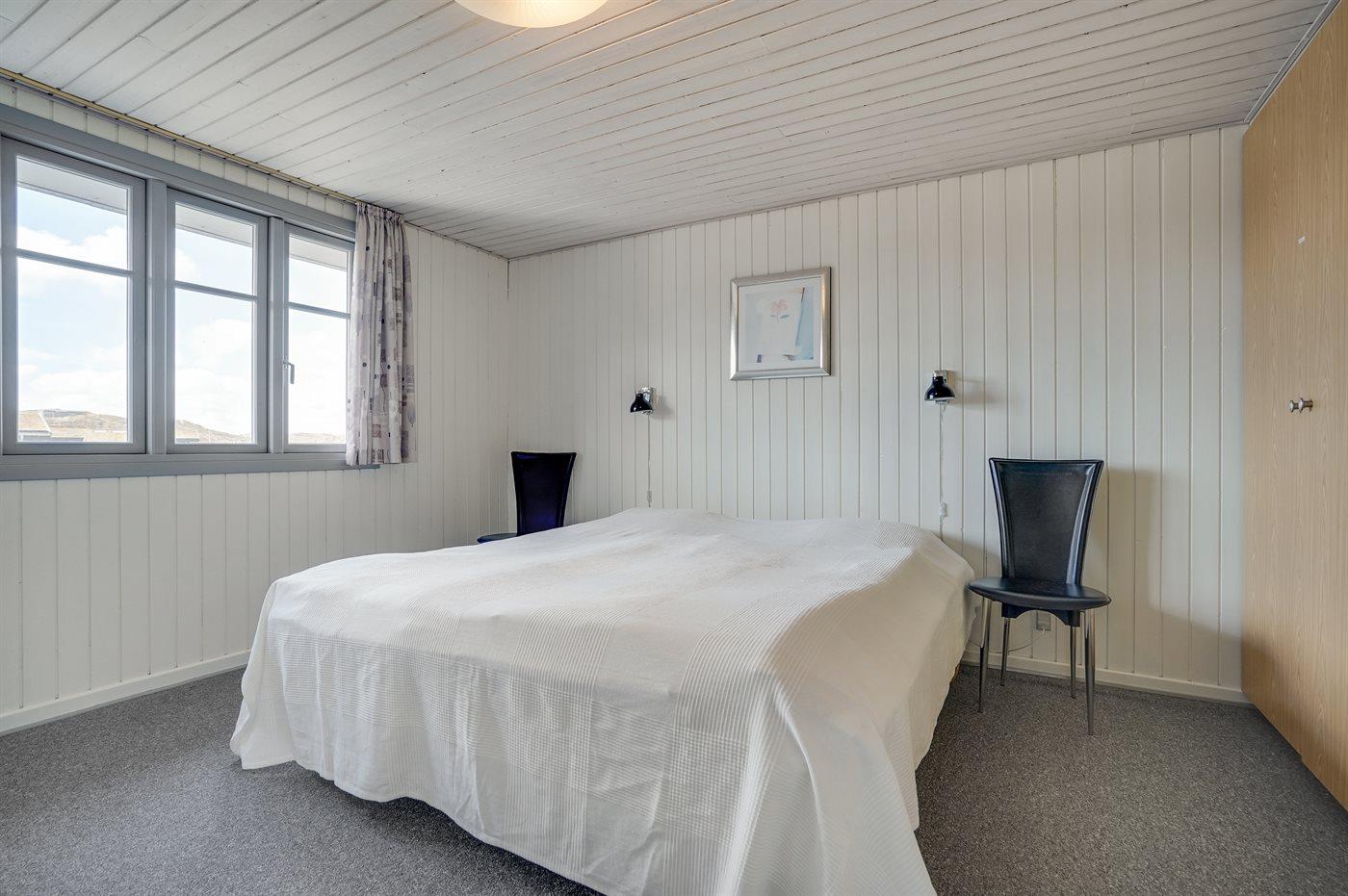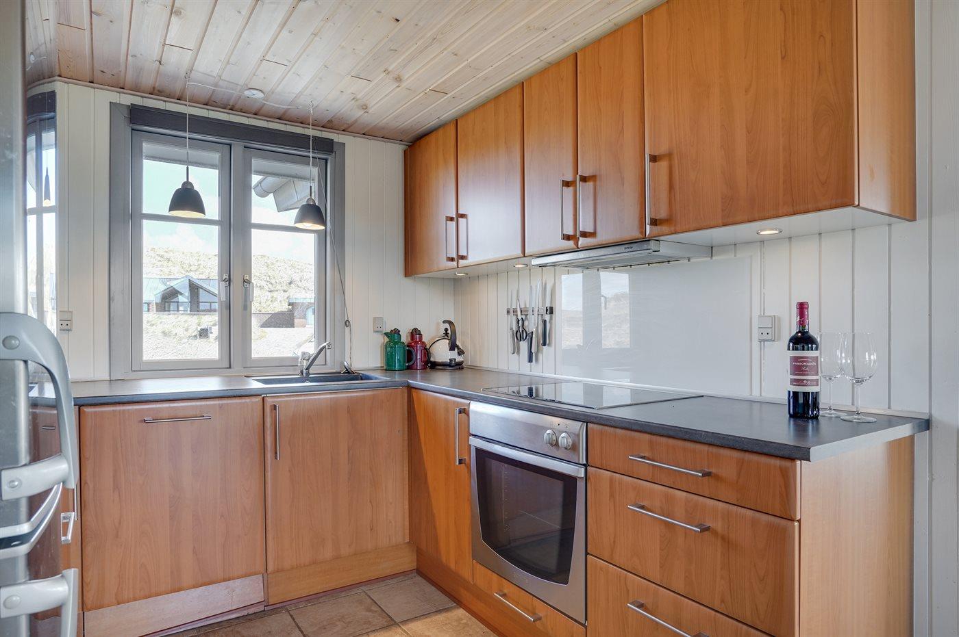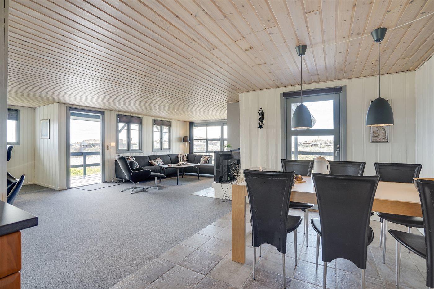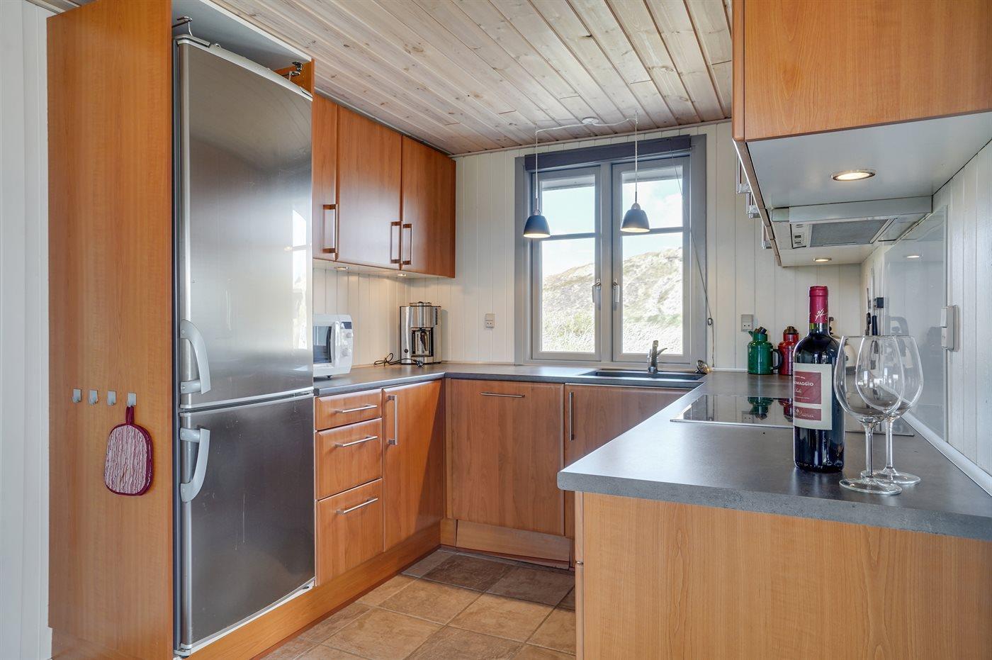 På en dejlig, kuperet klitgrund, kun 200 m fra Vesterhavet, ligger dette dejlige og velholdte sommerhus i træ, bygget i 1980 og løbende moderniseret, senest i 2010. Gode åbne og overdækkede terrassearealer med havemøbler, hvor man kan nyde udsigten over det naturskønne klitområde. Trævægge og -lofter. Gulvtæpper overalt, dog klinkegulv i køkken-alrum. Dejligt badeværelse med bruseniche og gulvvarme. Vaskemaskine og tørretumbler. Sauna. Moderne køkken med mikrobølgeovn, fryser, opvaskemaskine, varmluftovn samt komfur med keramiske kogeplader. Stor, hyggelig opholdsstue med brændeovn, TV med parabol (digital), DVD-afspiller og CD-afspiller. 3 soverum; 2 med dobbeltseng og 1 med 2 enkeltsenge. Desuden barneseng, 1 høj barnestole samt sandkasse til rådighed. Af yderligere udstyr kan gratis, trådløs internetforbindelse nævnes (computer skal medbringes) og der er installeret energibesparende varmepumpe/aircondition. Et dejligt sommerhus beliggende i et naturskønt område - få min. kørsel til badebyen Søndervig.