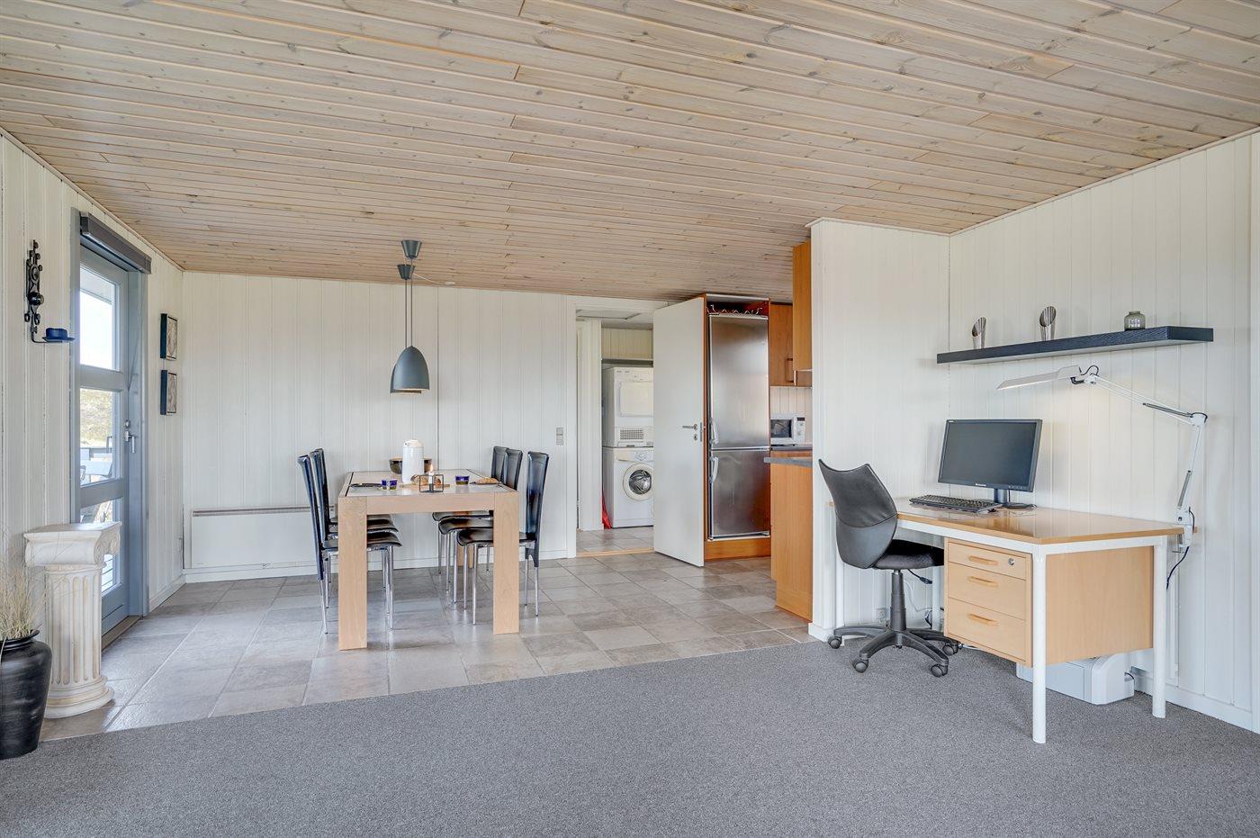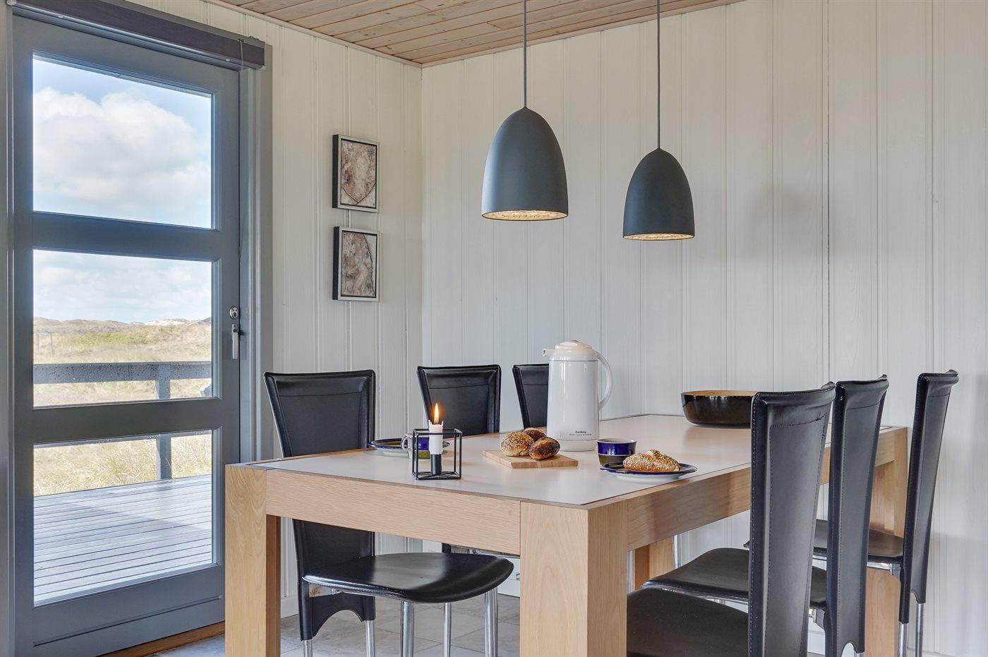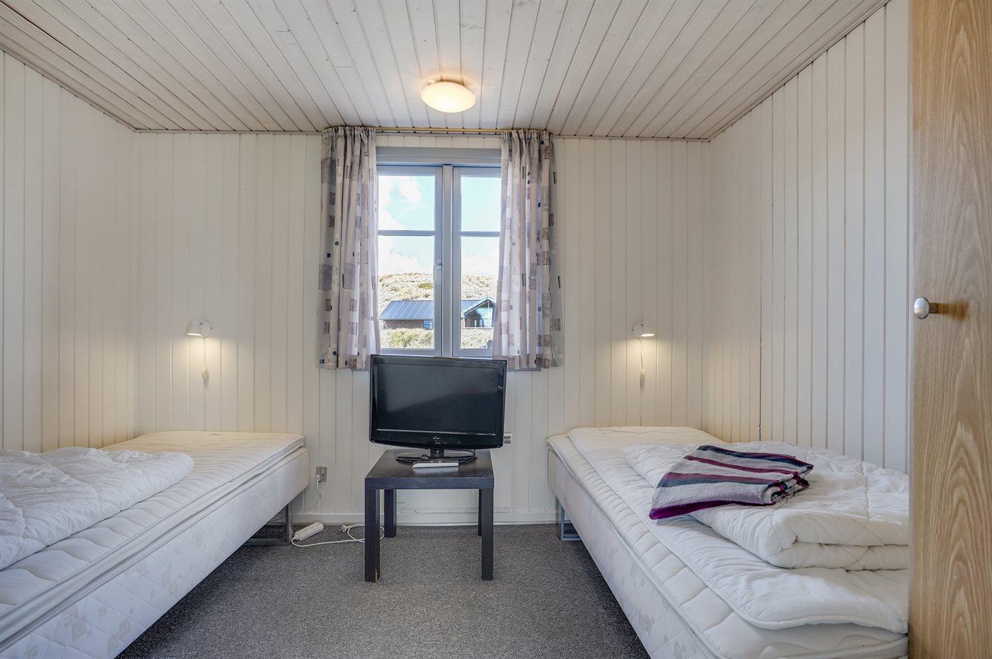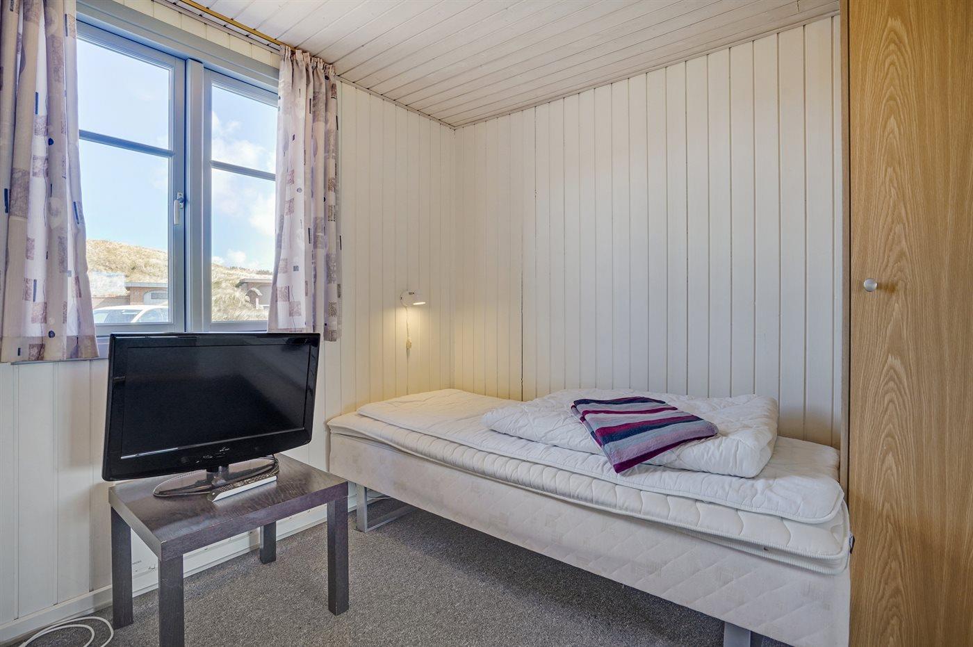 På en dejlig, kuperet klitgrund, kun 200 m fra Vesterhavet, ligger dette dejlige og velholdte sommerhus i træ, bygget i 1980 og løbende moderniseret, senest i 2010. Gode åbne og overdækkede terrassearealer med havemøbler, hvor man kan nyde udsigten over det naturskønne klitområde. Trævægge og -lofter. Gulvtæpper overalt, dog klinkegulv i køkken-alrum. Dejligt badeværelse med bruseniche og gulvvarme. Vaskemaskine og tørretumbler. Sauna. Moderne køkken med mikrobølgeovn, fryser, opvaskemaskine, varmluftovn samt komfur med keramiske kogeplader. Stor, hyggelig opholdsstue med brændeovn, TV med parabol (digital), DVD-afspiller og CD-afspiller. 3 soverum; 2 med dobbeltseng og 1 med 2 enkeltsenge. Desuden barneseng, 1 høj barnestole samt sandkasse til rådighed. Af yderligere udstyr kan gratis, trådløs internetforbindelse nævnes (computer skal medbringes) og der er installeret energibesparende varmepumpe/aircondition. Et dejligt sommerhus beliggende i et naturskønt område - få min. kørsel til badebyen Søndervig.