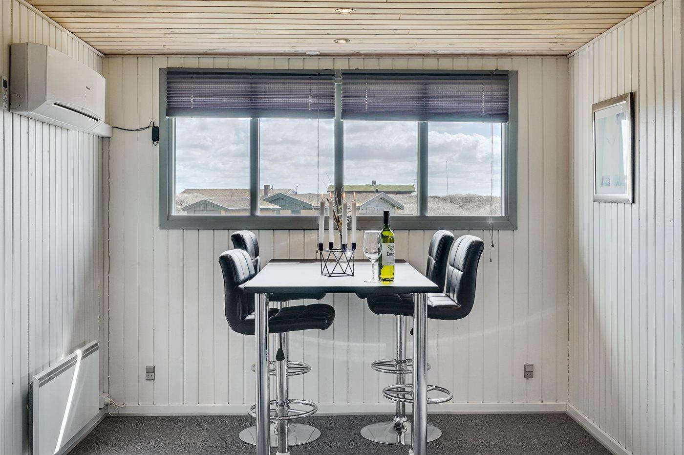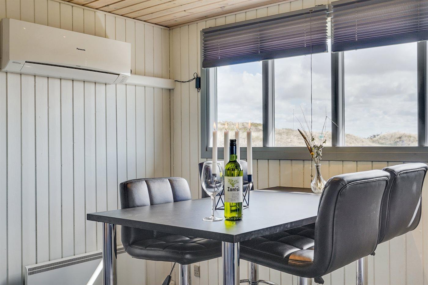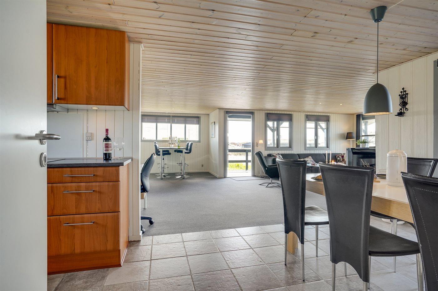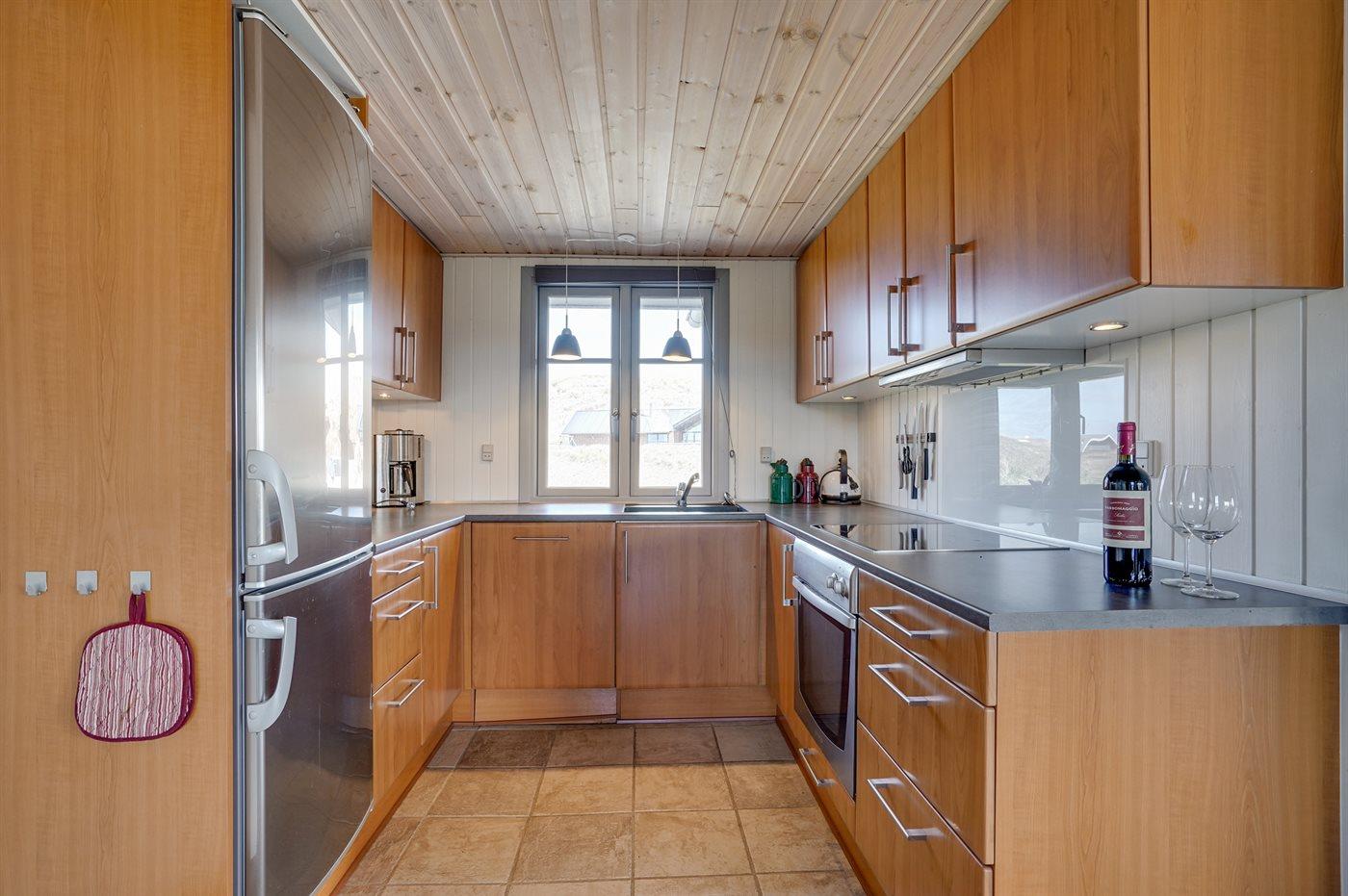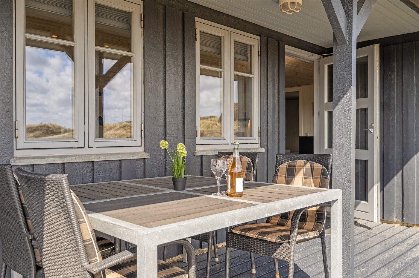 På en dejlig, kuperet klitgrund, kun 200 m fra Vesterhavet, ligger dette dejlige og velholdte sommerhus i træ, bygget i 1980 og løbende moderniseret, senest i 2010. Gode åbne og overdækkede terrassearealer med havemøbler, hvor man kan nyde udsigten over det naturskønne klitområde. Trævægge og -lofter. Gulvtæpper overalt, dog klinkegulv i køkken-alrum. Dejligt badeværelse med bruseniche og gulvvarme. Vaskemaskine og tørretumbler. Sauna. Moderne køkken med mikrobølgeovn, fryser, opvaskemaskine, varmluftovn samt komfur med keramiske kogeplader. Stor, hyggelig opholdsstue med brændeovn, TV med parabol (digital), DVD-afspiller og CD-afspiller. 3 soverum; 2 med dobbeltseng og 1 med 2 enkeltsenge. Desuden barneseng, 1 høj barnestole samt sandkasse til rådighed. Af yderligere udstyr kan gratis, trådløs internetforbindelse nævnes (computer skal medbringes) og der er installeret energibesparende varmepumpe/aircondition. Et dejligt sommerhus beliggende i et naturskønt område - få min. kørsel til badebyen Søndervig.