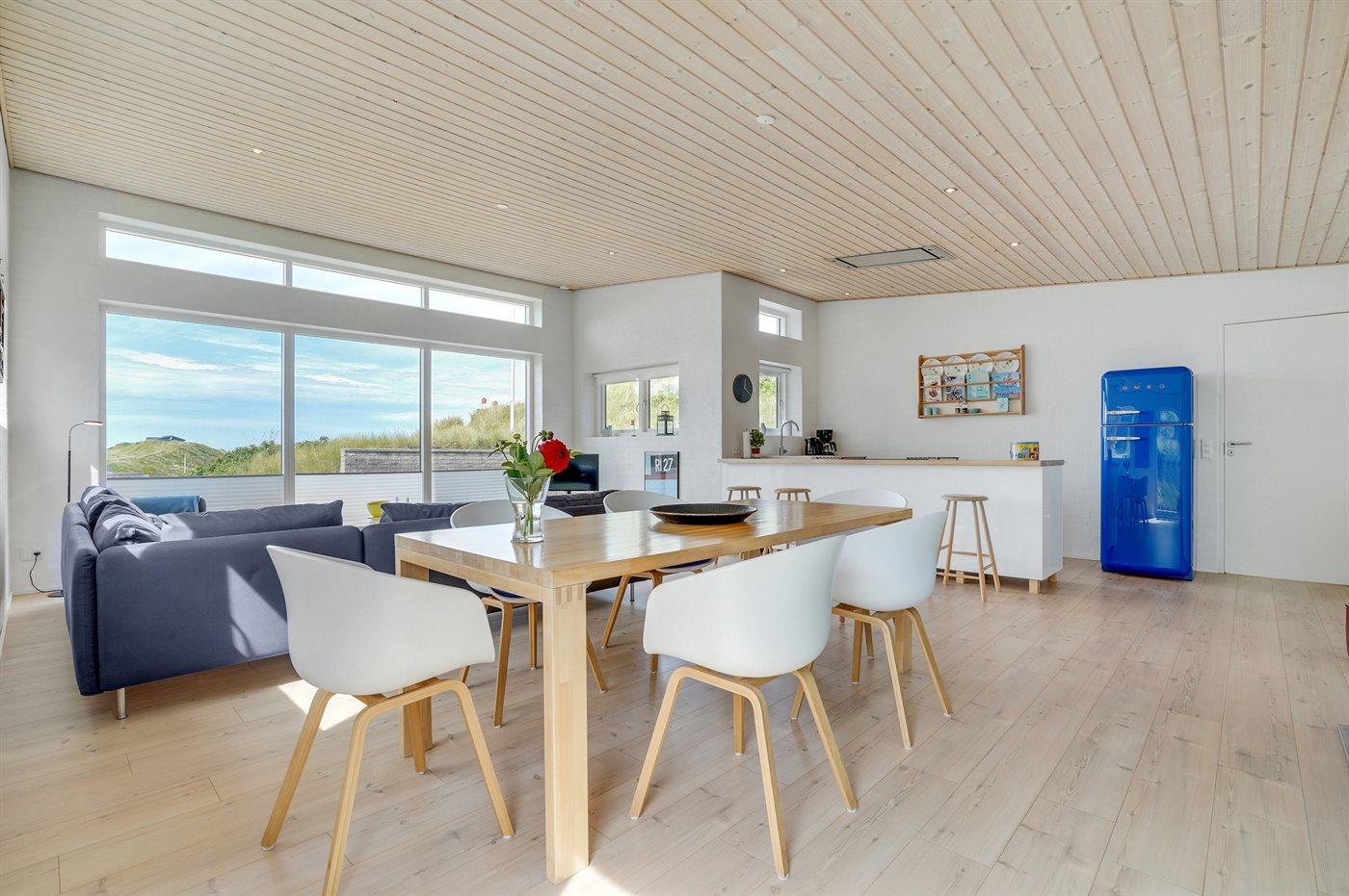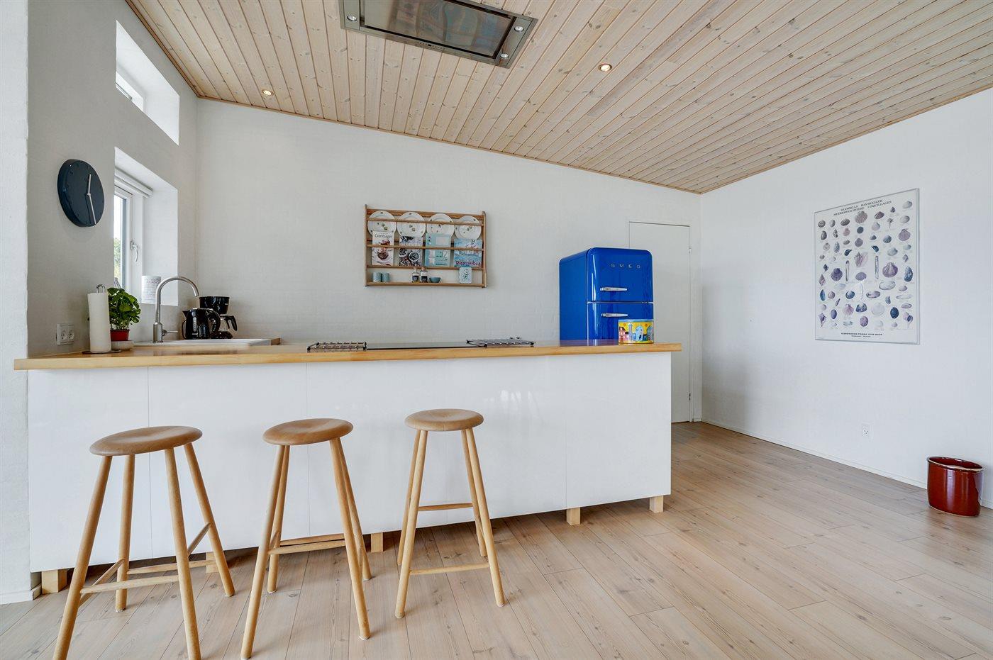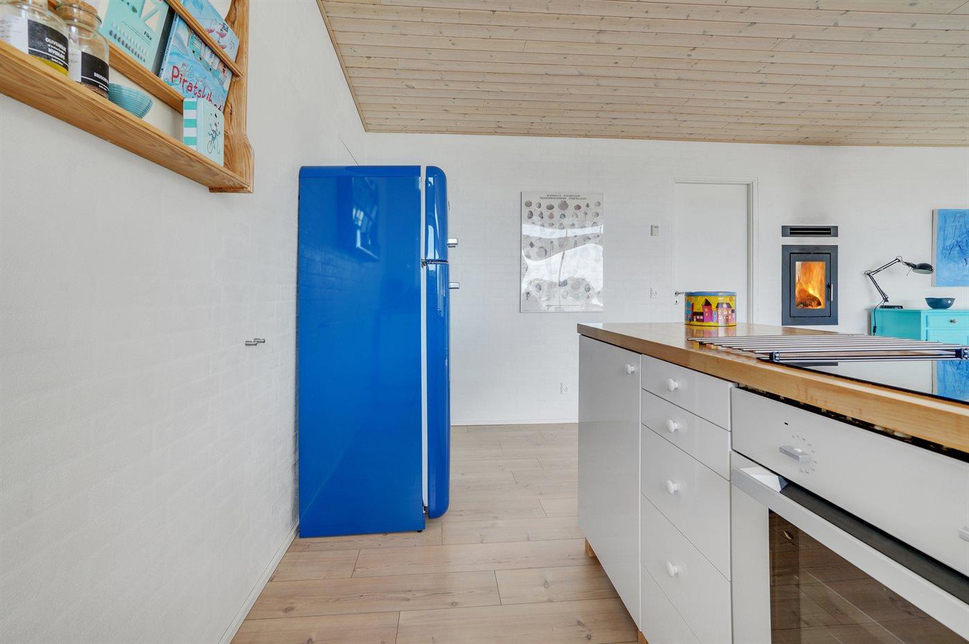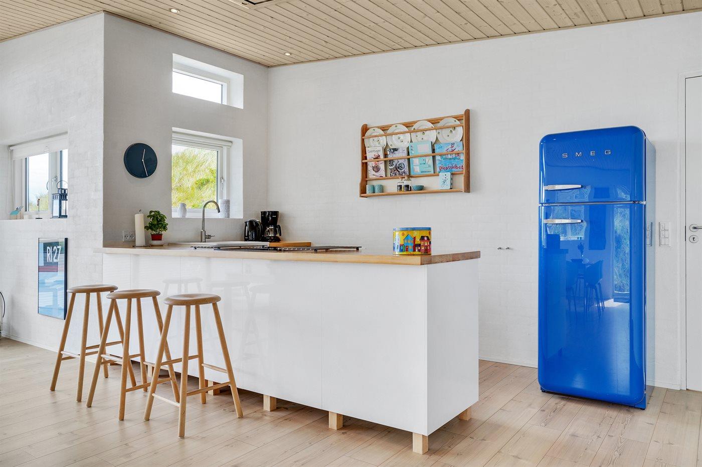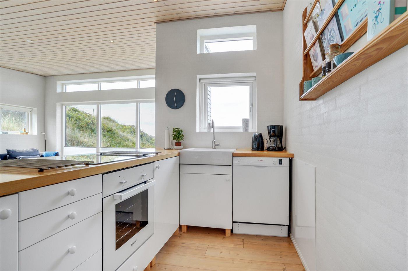 Køkkenet er udstyret med 1 køleskab. Der er 4 keramiske kogeplader, varmluftovn, mikrobølgeovn samt opvaskemaskine.