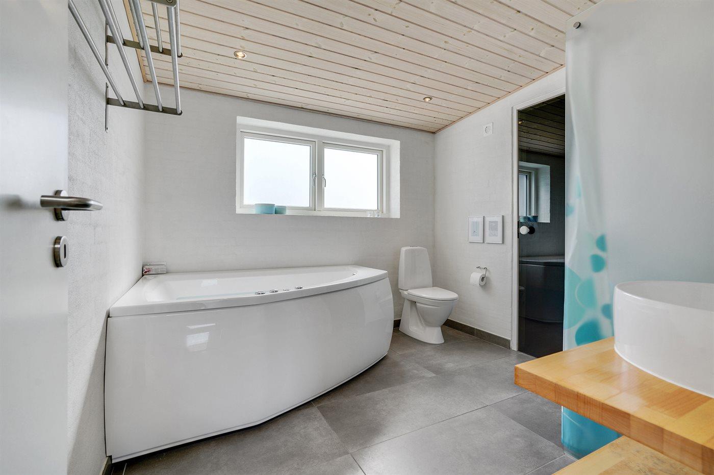 Der er 2 badeværelser med bruseniche og 2 toiletter. Der er gulvvarme på 2 badeværelser. I saunaen er der mulighed for afslapning.