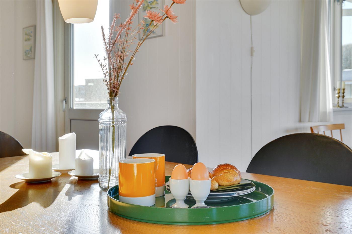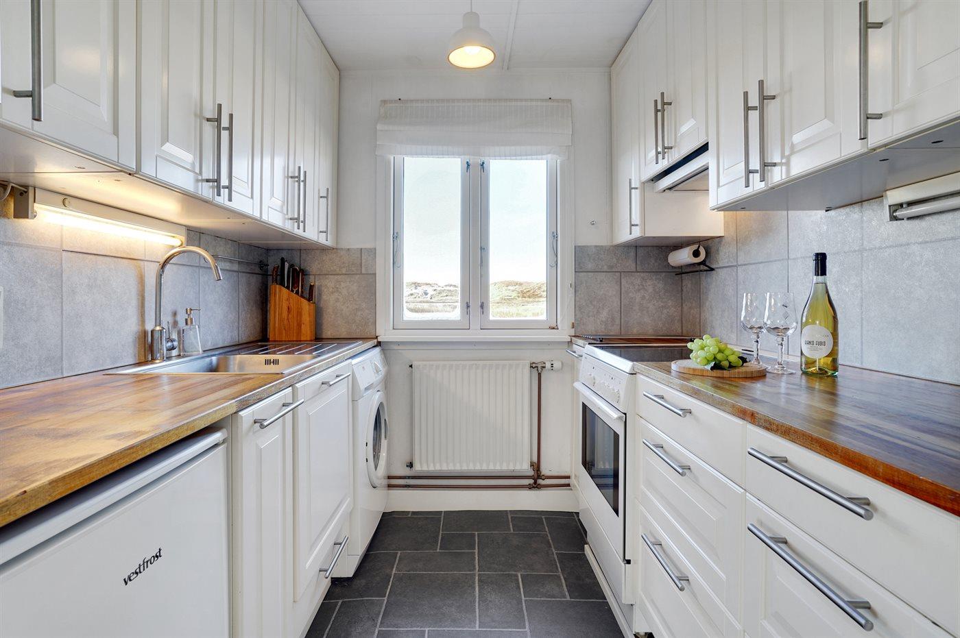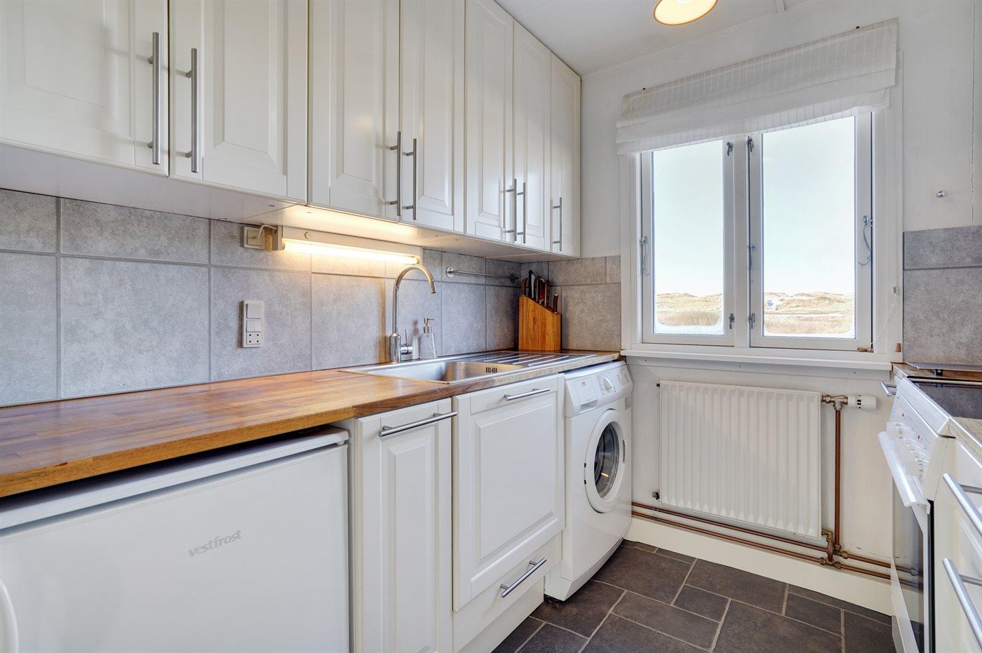 Køkkenet er udstyret med 1 køleskab. Der er 4 keramiske kogeplader, varmluftovn.
