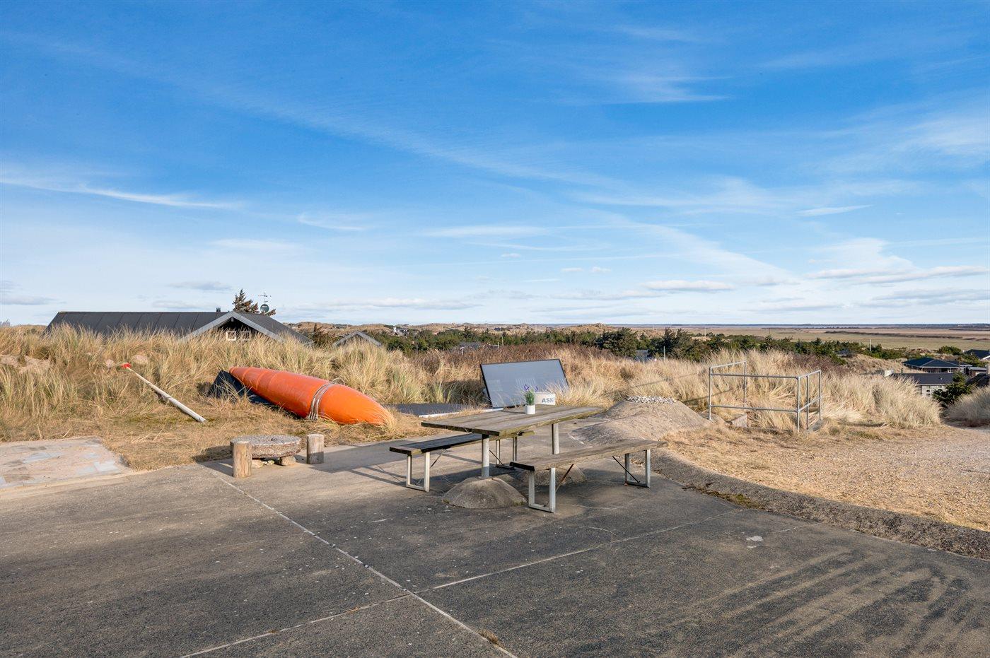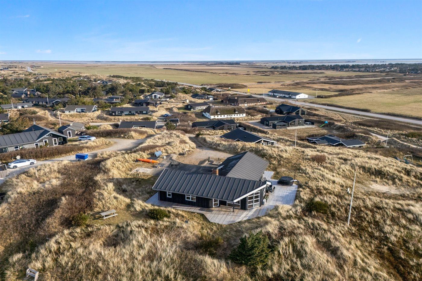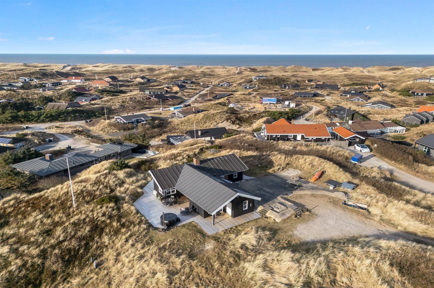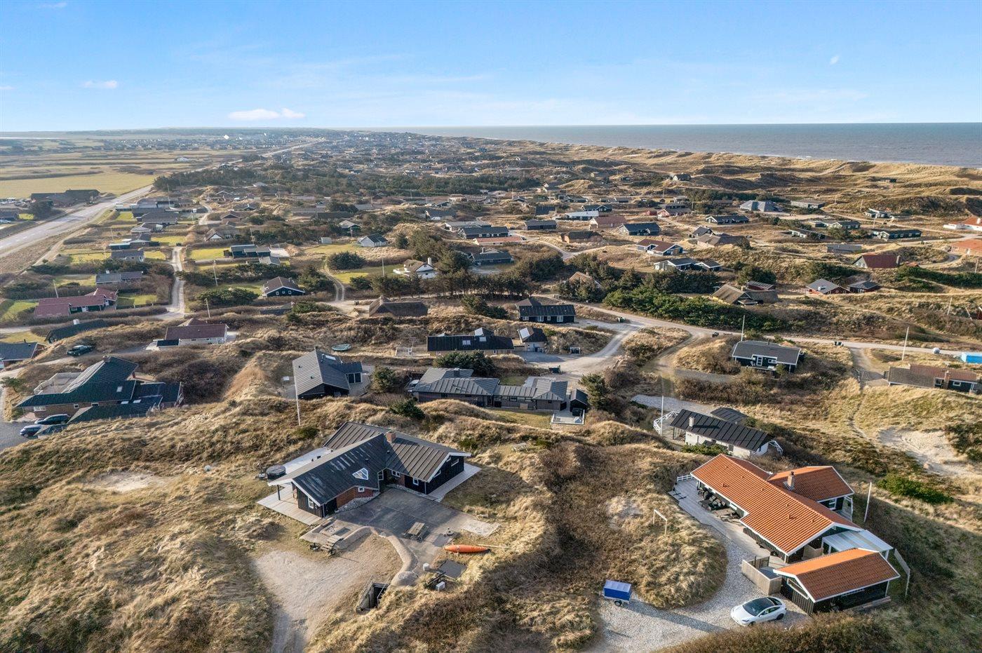 Sommerhuset er beliggende på en 1447 m² stor og skøn klitgrund med kun 450 m til havet. Nærmeste forretning er beliggende i en afstand af 450 m. Der er en golfbane i en afstand af 1000 m. Til sommerhuset hører stort, åbent terrasseareal. Desuden findes der overdækket terrasse. Der er installeret stik til opladning af elbil (type 2 stik). Parkering ved ferieboligen.