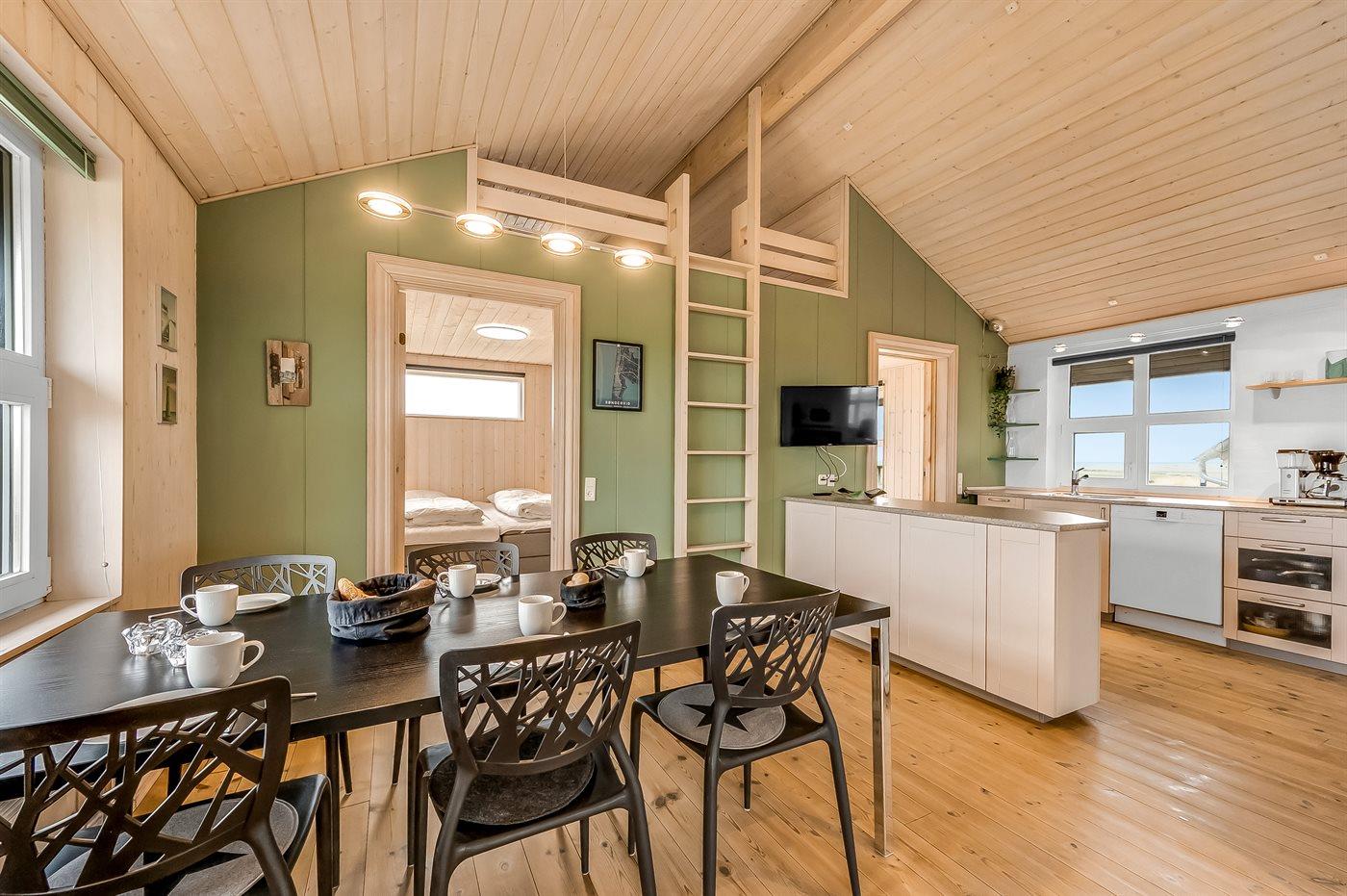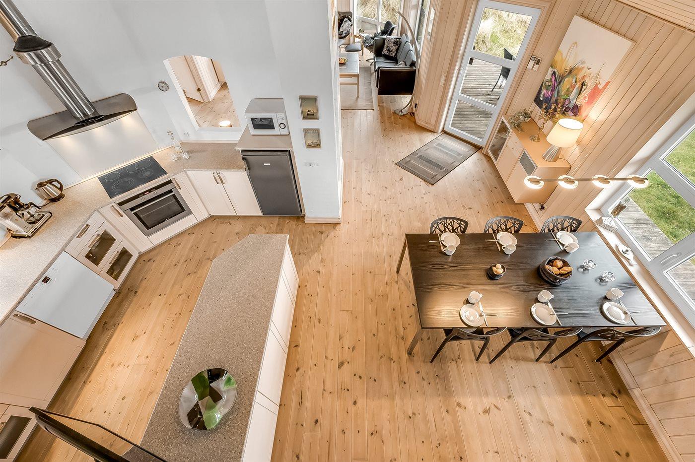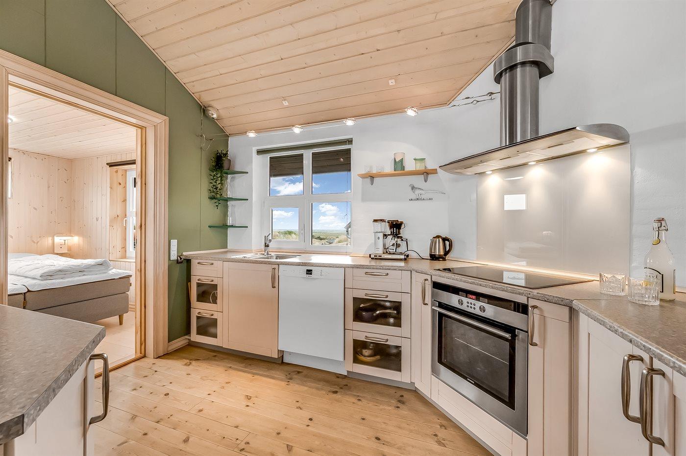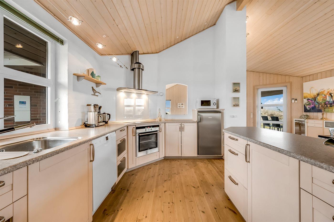 Køkkenet er udstyret med 1 køleskab, 4 keramiske kogeplader, varmluftovn, mikrobølgeovn samt opvaskemaskine.
