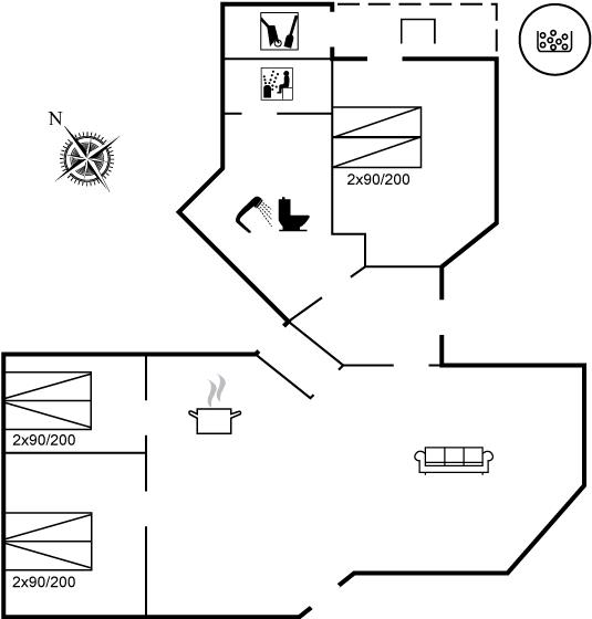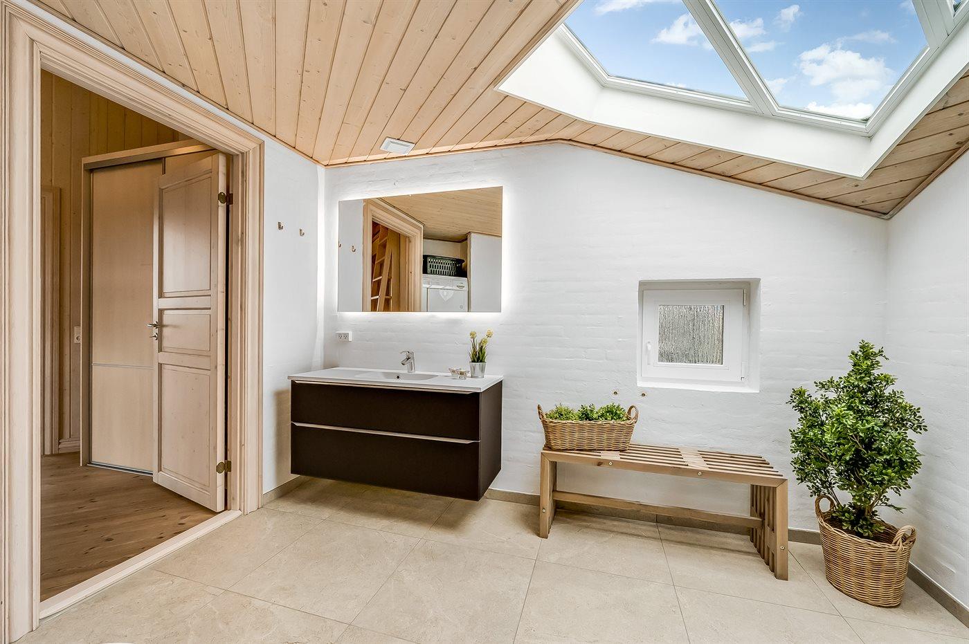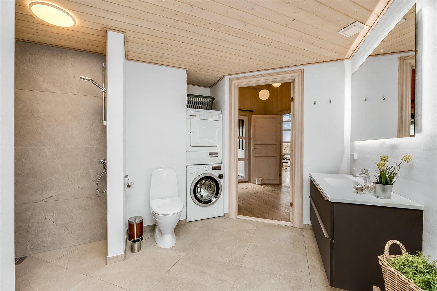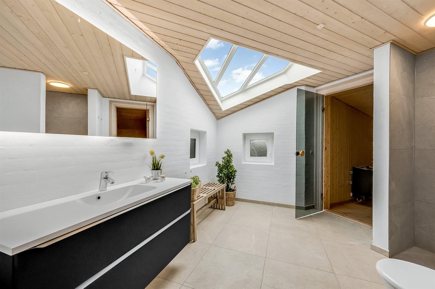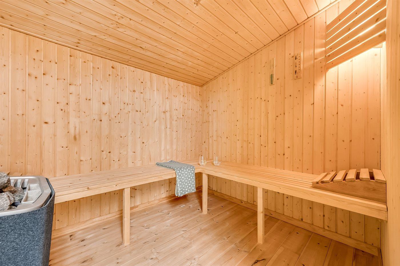 Der er 1 badeværelse med gulvvarme, bruseniche og toilet. I saunaen er der mulighed for afslapning.