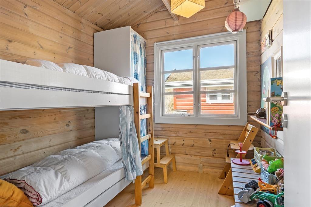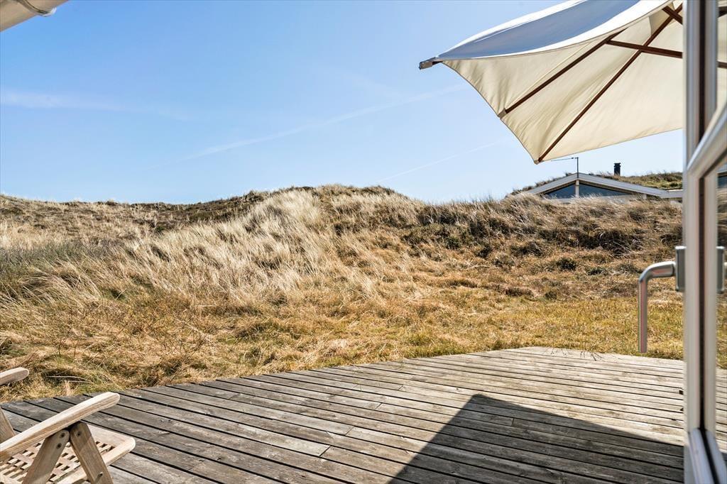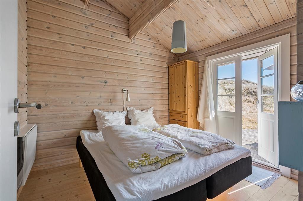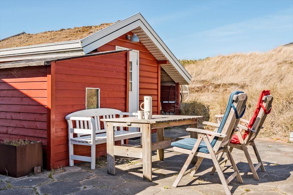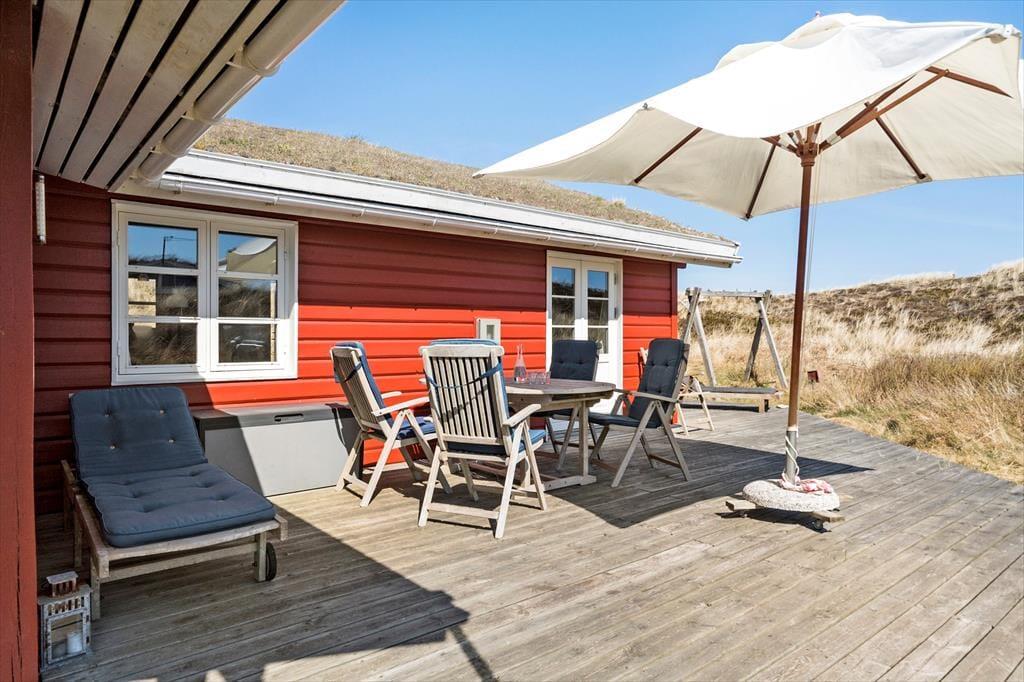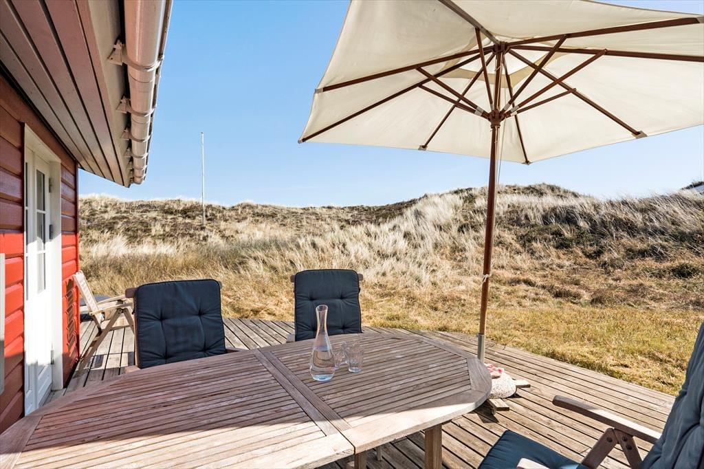 Sortebærdalen er en lille vej, der ender blindt, og sommerhuset ligger helt for enden i fredfyldte og ugenerede omgivelser. En lille sti fører jer direkte gennem klitlandskabet og ned mod Vesterhavet – for at komme ned på stranden skal I kun tilbagelægge 400 meter, så flere daglige badeture kan sagtens komme på tale. Skal hele ferien ikke foregå her på den dejlige sandstrand, er der få kilometer til både Stadil Fjord og Ringkøbing Fjord, og den hyggelige badeby Søndervig ligger bare tre kilometer væk. Her kan I klare indkøbene og gå ud at spise, og hvis I har medbragt cykler, er der cykelsti hele vejen derhen.