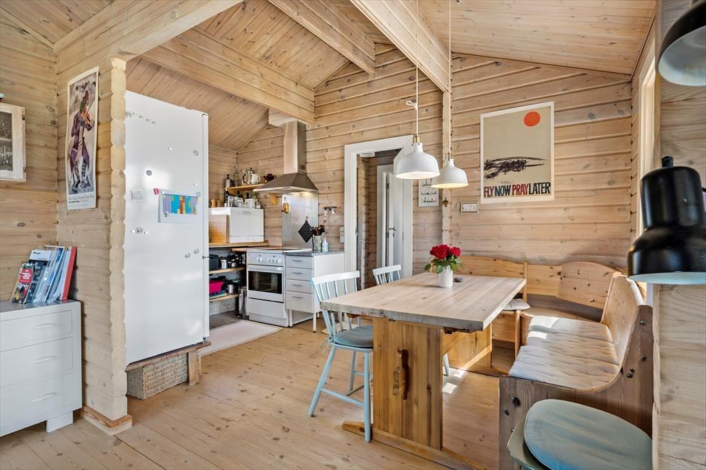 Huset har fået navnet Bjælkehytten, hvilket passer helt perfekt til den rødmalede bygning med grønt tag og hvide sprossevinduer. Inden døre emmer det 71 m2 store hus af hygge og charme med rustikke trævægge, loft til kip og komfortabelt møblement. I stuen kan I slappe af i sofaafdelingen, og ellers kan I samles ved spisepladsen nær det åbne køkken. Er vejret køligt, er der mulighed for at tænde op i brændeovnen og tage varmepumpen i brug – og på badeværelset kan I tænde for gulvvarmen og håndklædetørreren, så både tæer og håndklæder kan holde sig dejligt lune. Soveværelser er der tre af, hvoraf to er med dobbeltseng og det tredje med køjeseng, så huset kan rumme fire voksne og to børn. Og til de yngste er der for øvrigt legesager i køjerummet.