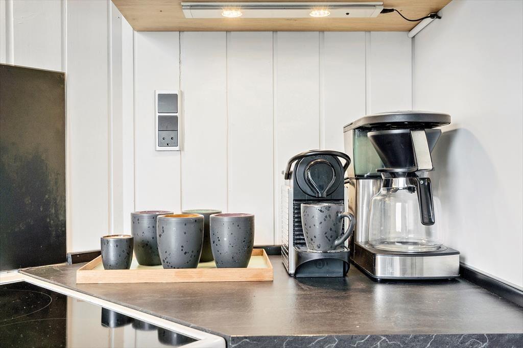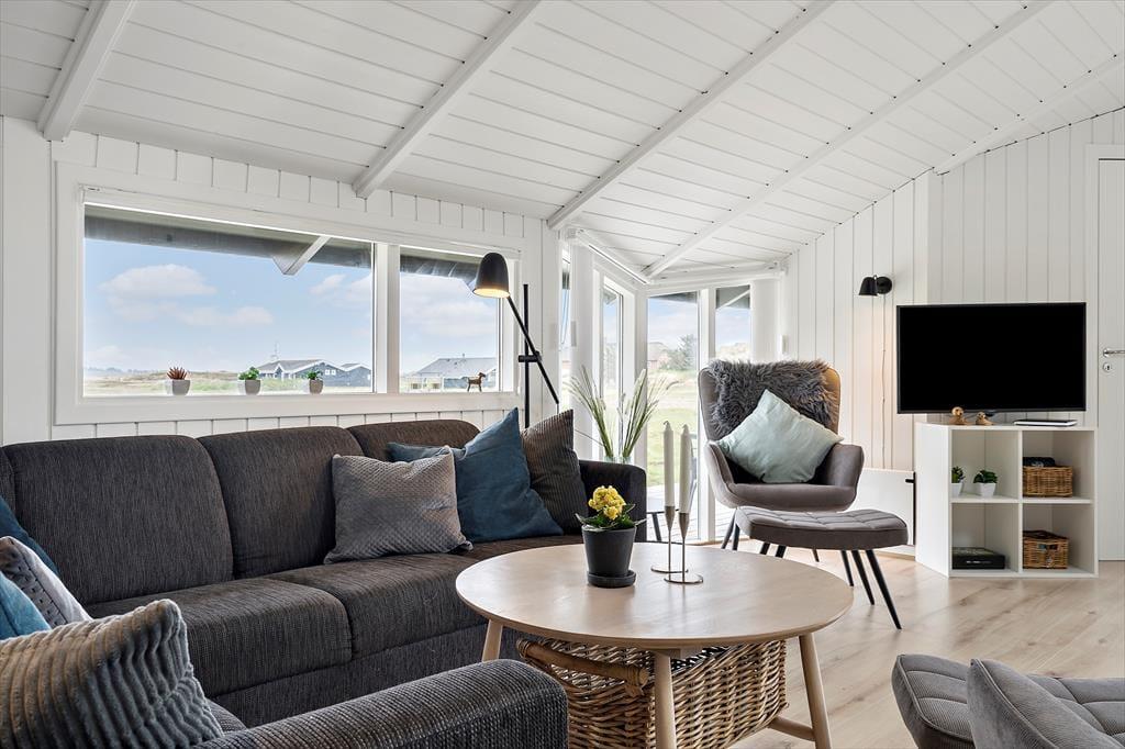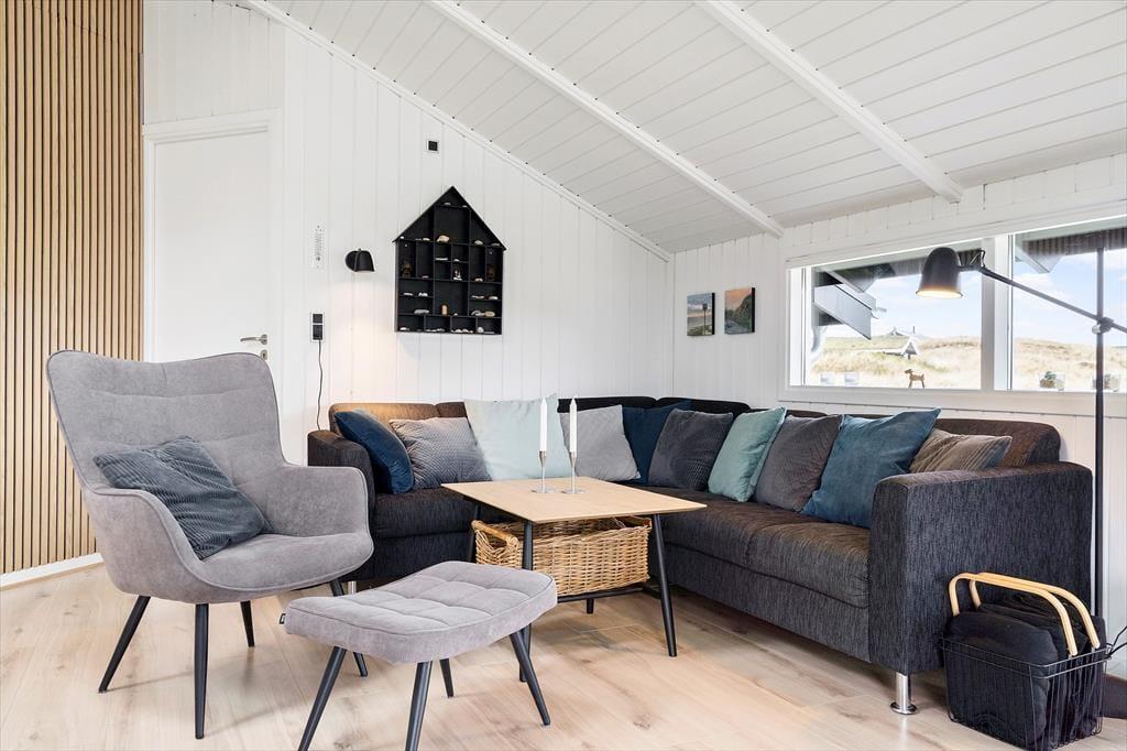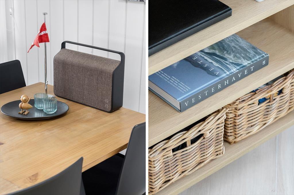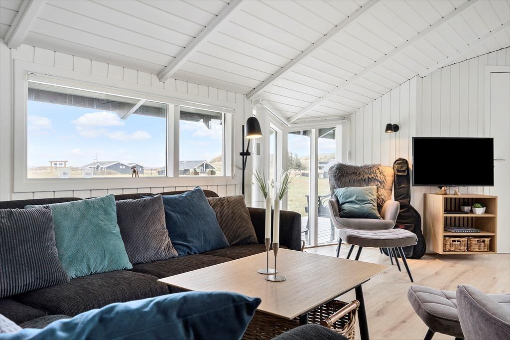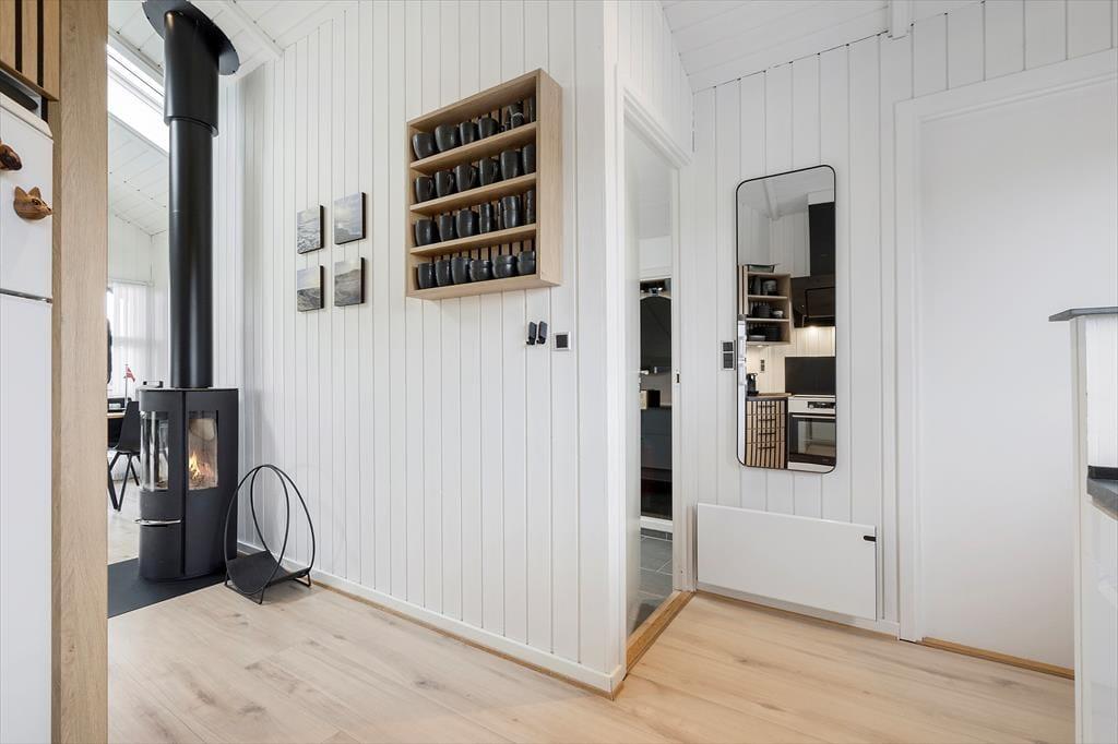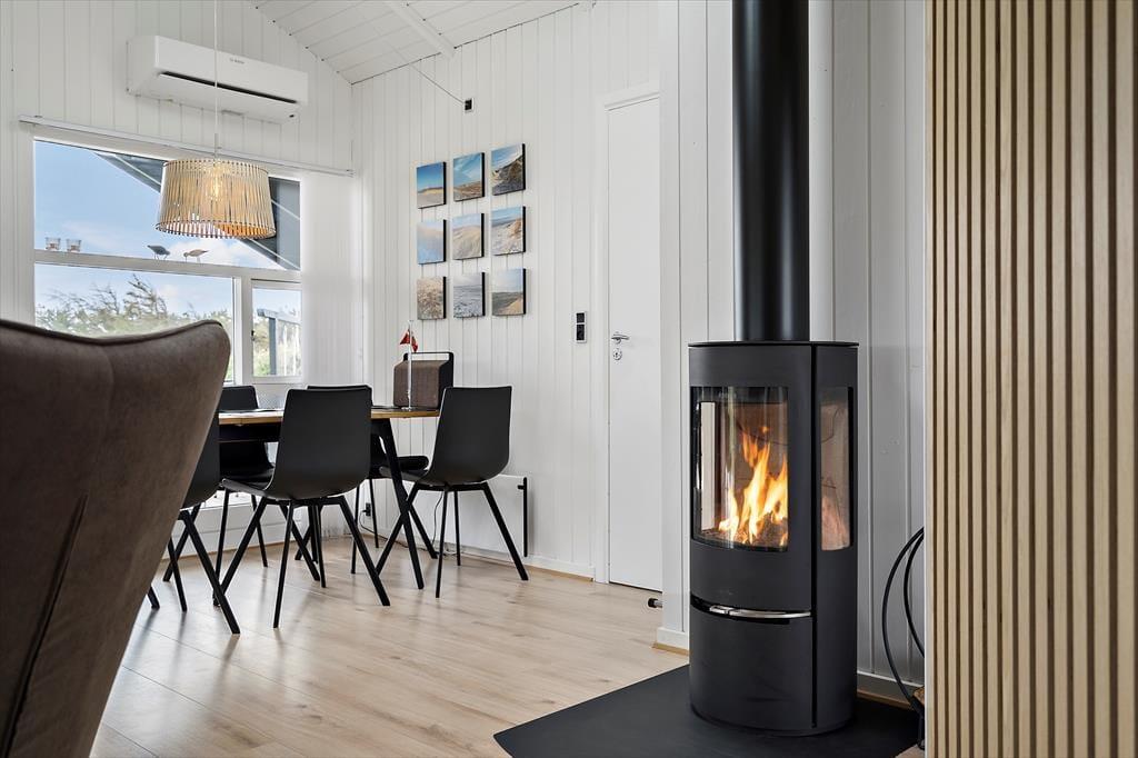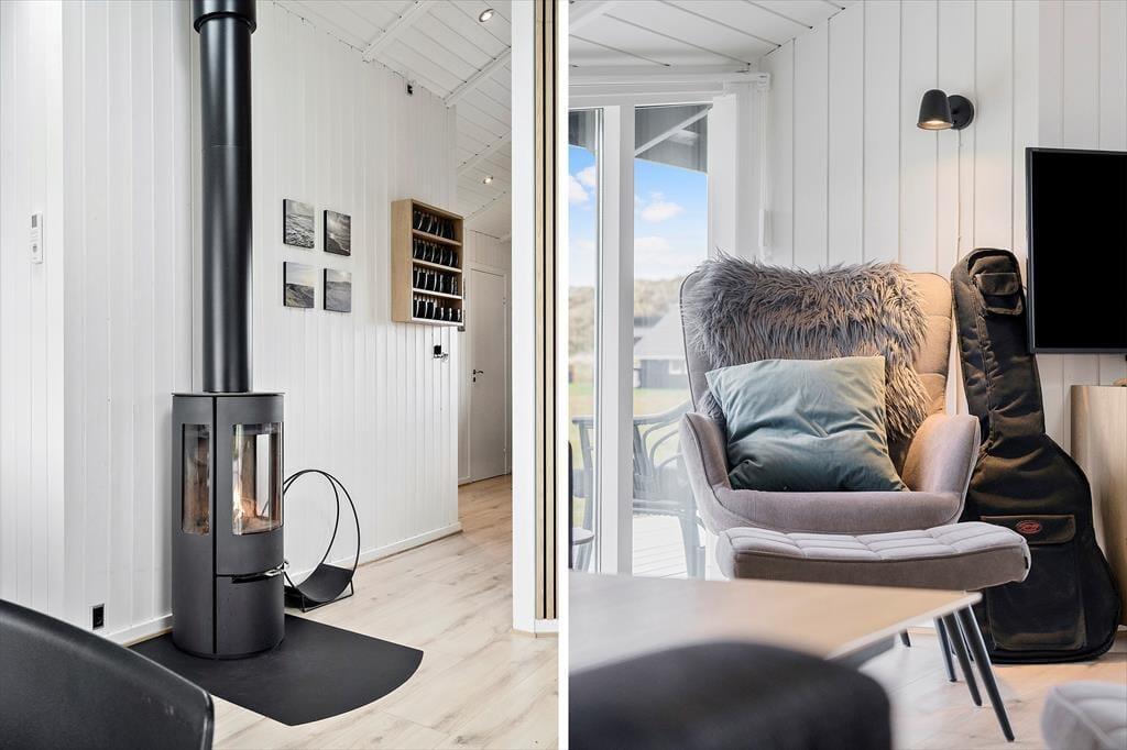 Udover sovegemakker og badefaciliteter er der selvfølgelig også en opholdsafdeling i det 88 m2 store sommerhus. Den består af stue og køkken i åben forbindelse, og med loft til kip, ovenlysvinduer og hvidmalede trævægge er atmosfæren lys og indbydende. Efter seneste renovering, der foregik i 2021, er interiøret stilfuldt, og i køkkenet har I alt, hvad I skal bruge for at trylle noget lækkert frem til alle måltider på dagen. Er det køligt udenfor, kan I tænde op i brændeovnen, inden I sætter jer til bords – og også fra sofaafdelingen kan I kigge ind i flammerne og mærke varmen brede sig. En anden måde, I kan blive varmet igennem på, er at gå i spabad og sauna på det lækre wellnessbadeværelse, der ligger centralt i huset.