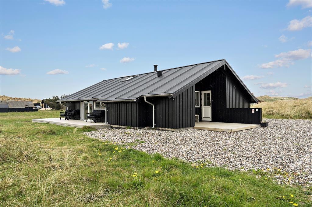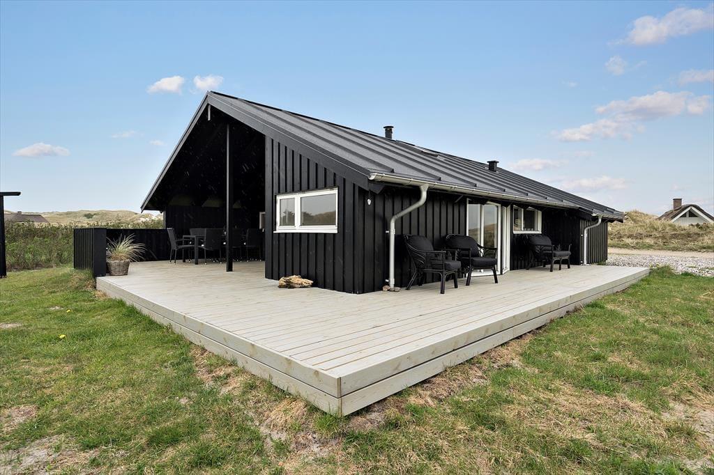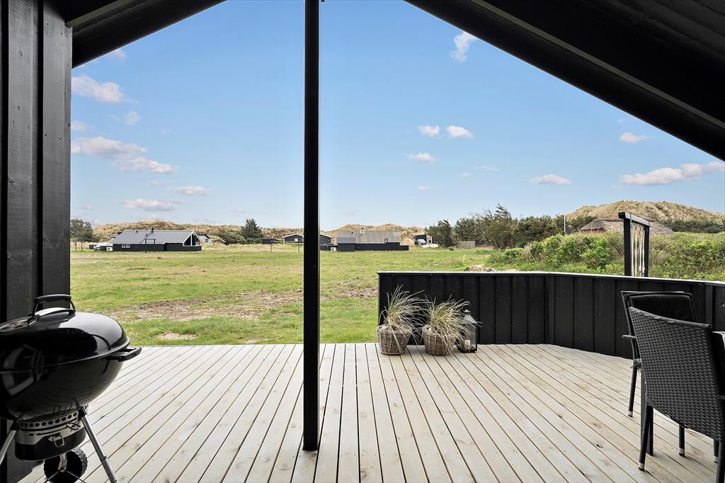 Fra sommerhuset har I direkte adgang til to delvist overdækkede terrasser. Den ene ligger i forlængelse af stuen, så på en solrig sommerdag kan I åbne terrassedøren og lade inde- og udemiljøet smelte sammen. Den sydvendte orientering betyder, at terrassen er dejligt solrig, og så har I tilmed udsigt til et åbent naturareal, der breder sig mellem nabohusene. Afskærmningen mod vest giver jer mulighed for at finde læ, hvis det blæser ind fra havet, og I kan se frem til mange skønne stunder med gode bøger eller lækker mad fra grillen.