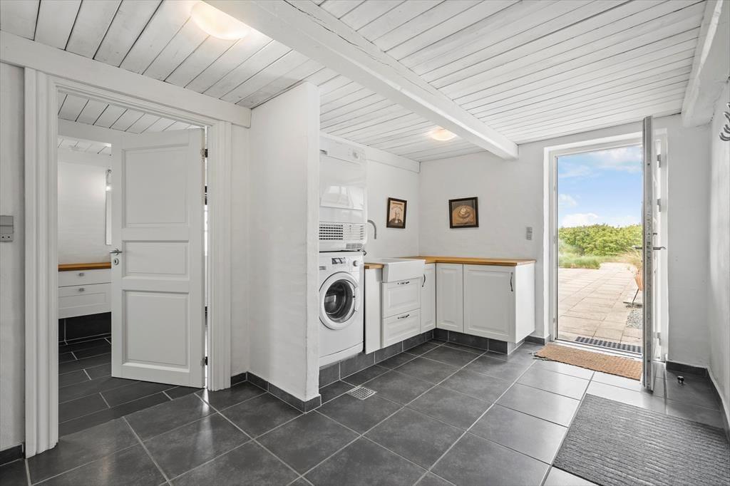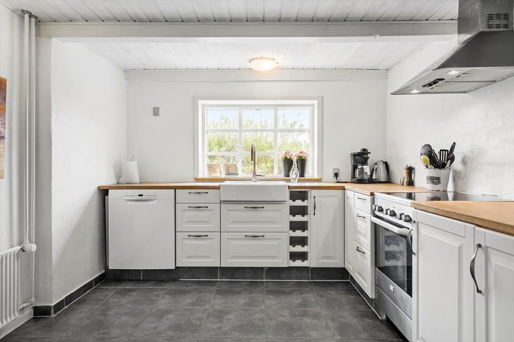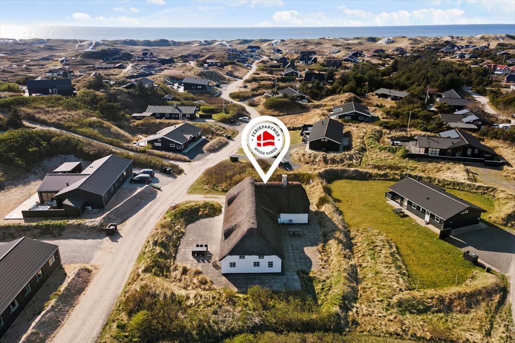 Den stråtækte klitgård har stået her ved vestkysten i et helt århundrede, men den velholdte facade afslører straks, at der er sket meget siden opførelsen. Ejendommen gennemgik en totalrenovering i 2019, så nu fungerer den som en dejlig feriebolig til seks personer. Inden døre er de store, lyst indrettede rum blevet moderniseret på smagfuld vis – blandt andet de to badeværelser, hvoraf det største er udstyret med et lækkert spabad. Også køkken og bryggers er funktionelle og pæne rum, og som en praktisk detalje er der en ekstra håndvask i bryggerset, som måske især lystfiskere vil sætte pris på. En rummelig entré og tre dejlige soveværelser hører også med til planløsningen, og endelig er der den hyggelige stue, som er et skønt opholdsrum med god plads til at slappe af og nyde ferielivet.