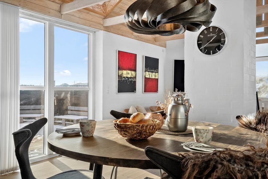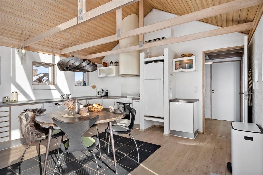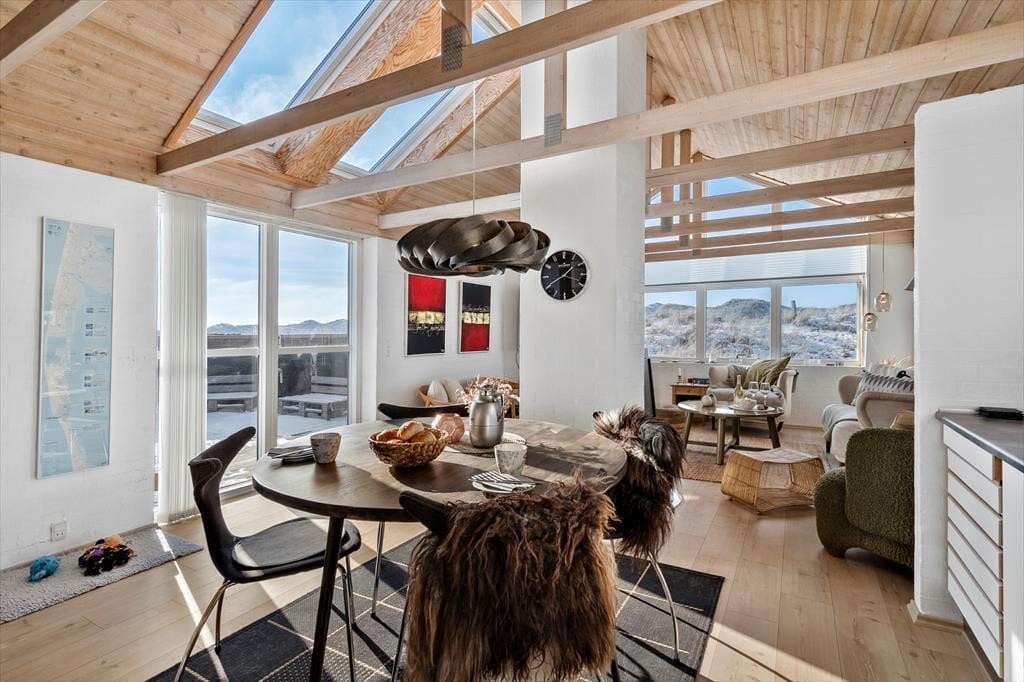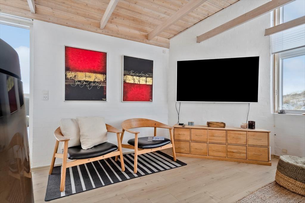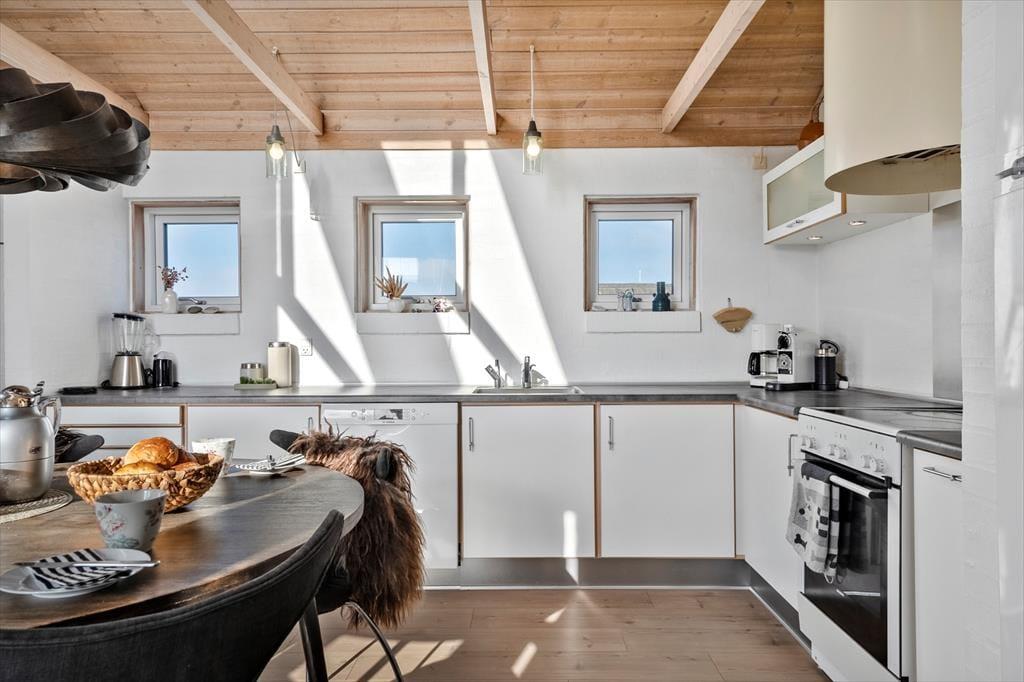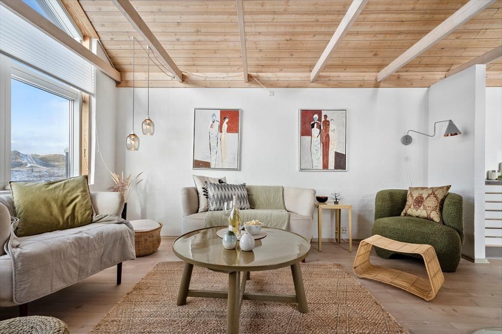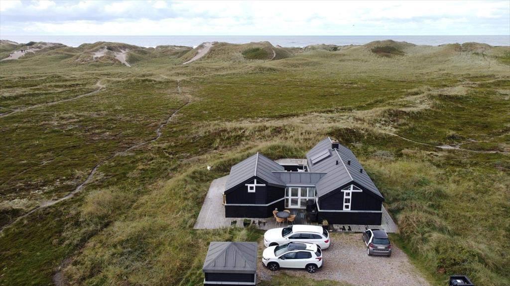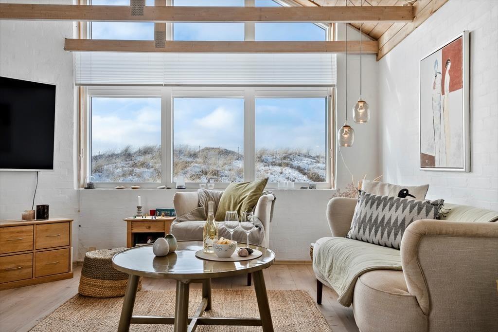 Indenfor mødes du af et lyst og lækkert sommerhus, hvor store vinduespartier lukker dagslyset ind og giver en smuk udsigt til klitterne udenfor. Det åbne køkken-alrum og stuen smelter naturligt sammen og skaber et samlingspunkt, hvor ferien leves i fællesskab – uanset om der står fælles madlavning, brætspil eller afslapning på programmet. Vi er især vilde med den luftige fornemmelse, som de åbne rum og det fine lysindfald giver. Sommerhuset rummer flere dejlige soveværelser, hvor du kan trække dig tilbage og nyde roen, og hemsen bliver hurtigt et populært sted for både børn og barnlige sjæle. Som en ekstra detalje gemmer der sig også et spil dart, til lidt venskabelig konkurrence – perfekt til hyggelige feriedueller, når vejret indbyder til indendørshygge. Her er der tænkt over detaljerne, og helheden fremstår både velholdt og indbydende.