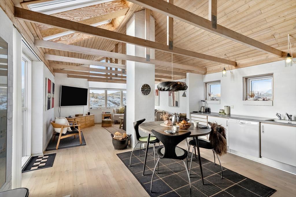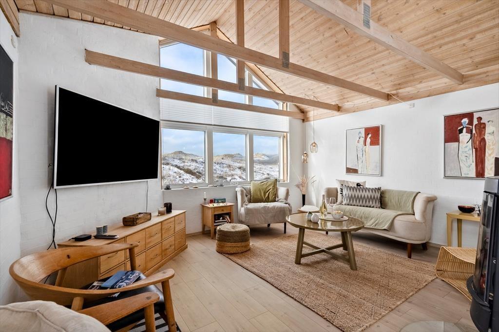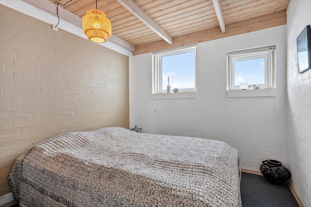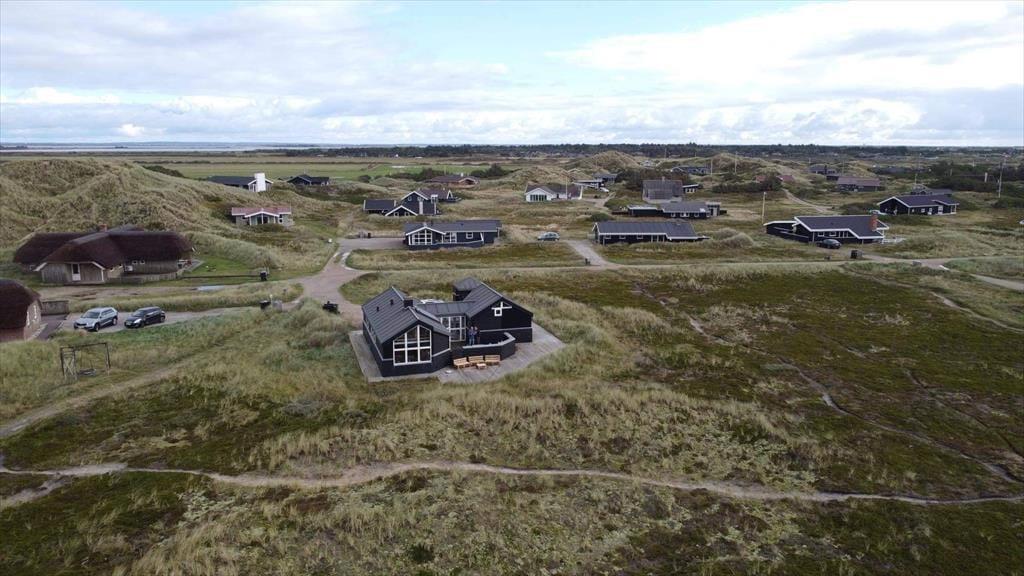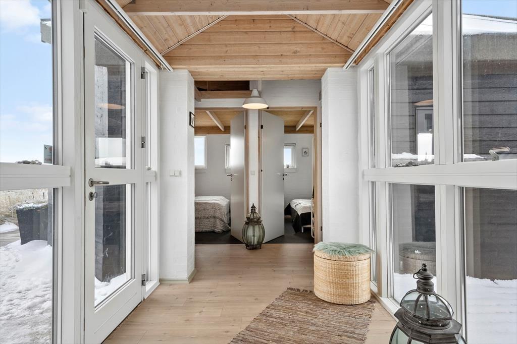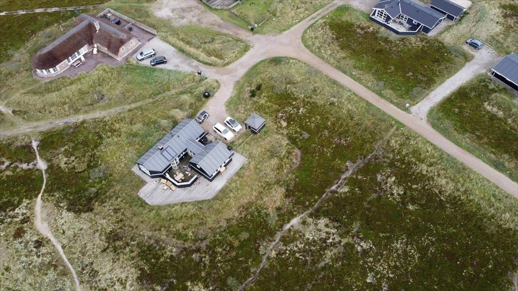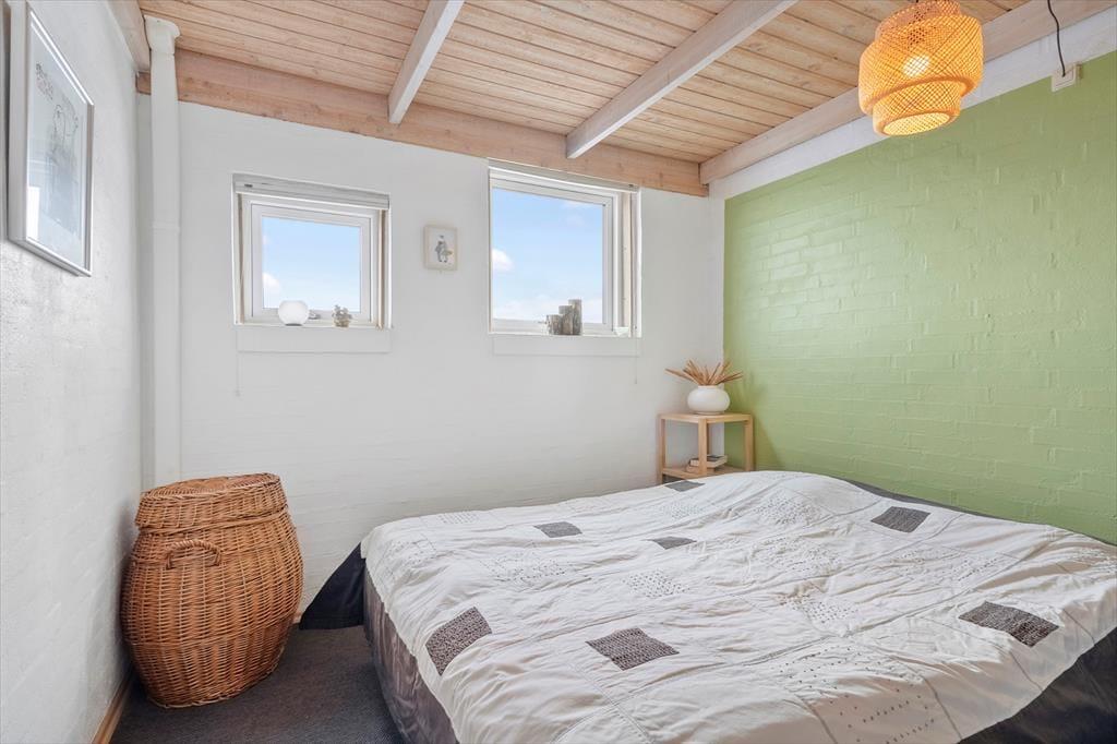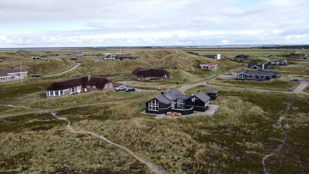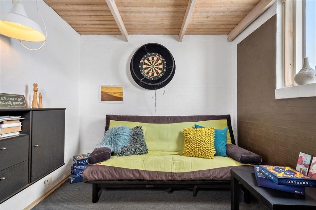 Indenfor mødes du af et lyst og lækkert sommerhus, hvor store vinduespartier lukker dagslyset ind og giver en smuk udsigt til klitterne udenfor. Det åbne køkken-alrum og stuen smelter naturligt sammen og skaber et samlingspunkt, hvor ferien leves i fællesskab – uanset om der står fælles madlavning, brætspil eller afslapning på programmet. Vi er især vilde med den luftige fornemmelse, som de åbne rum og det fine lysindfald giver. Sommerhuset rummer flere dejlige soveværelser, hvor du kan trække dig tilbage og nyde roen, og hemsen bliver hurtigt et populært sted for både børn og barnlige sjæle. Som en ekstra detalje gemmer der sig også et spil dart, til lidt venskabelig konkurrence – perfekt til hyggelige feriedueller, når vejret indbyder til indendørshygge. Her er der tænkt over detaljerne, og helheden fremstår både velholdt og indbydende.