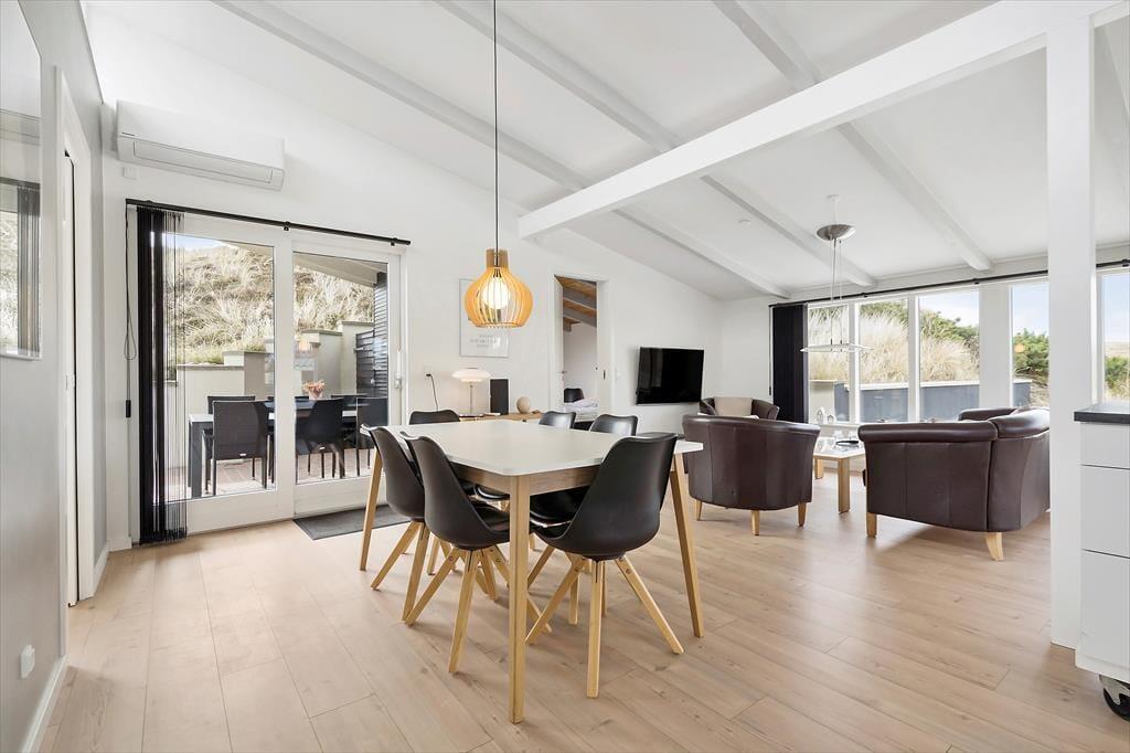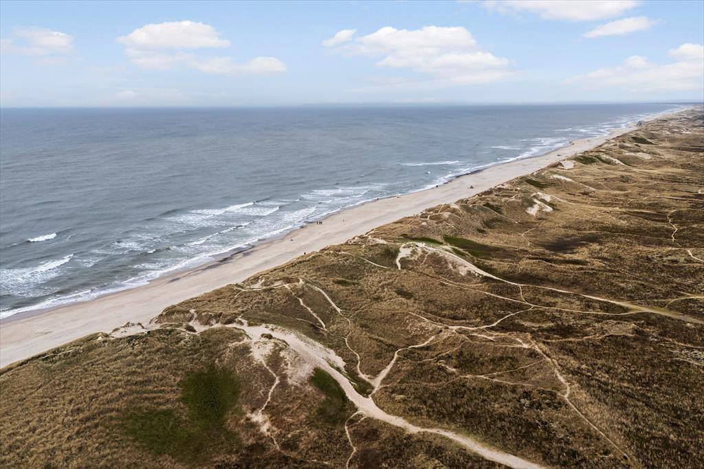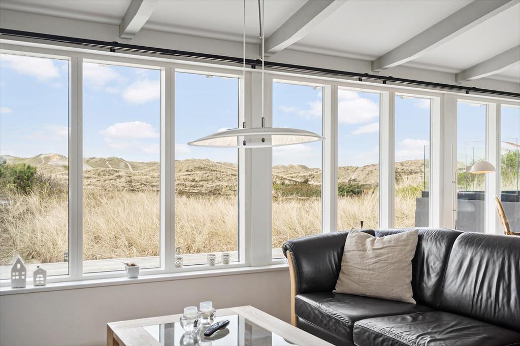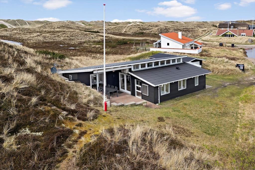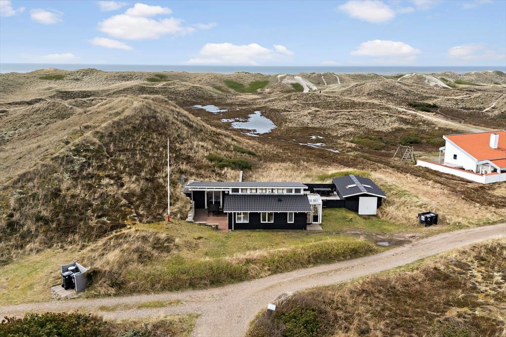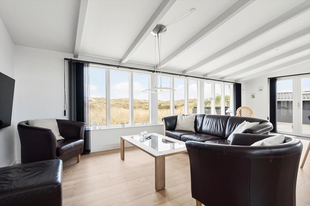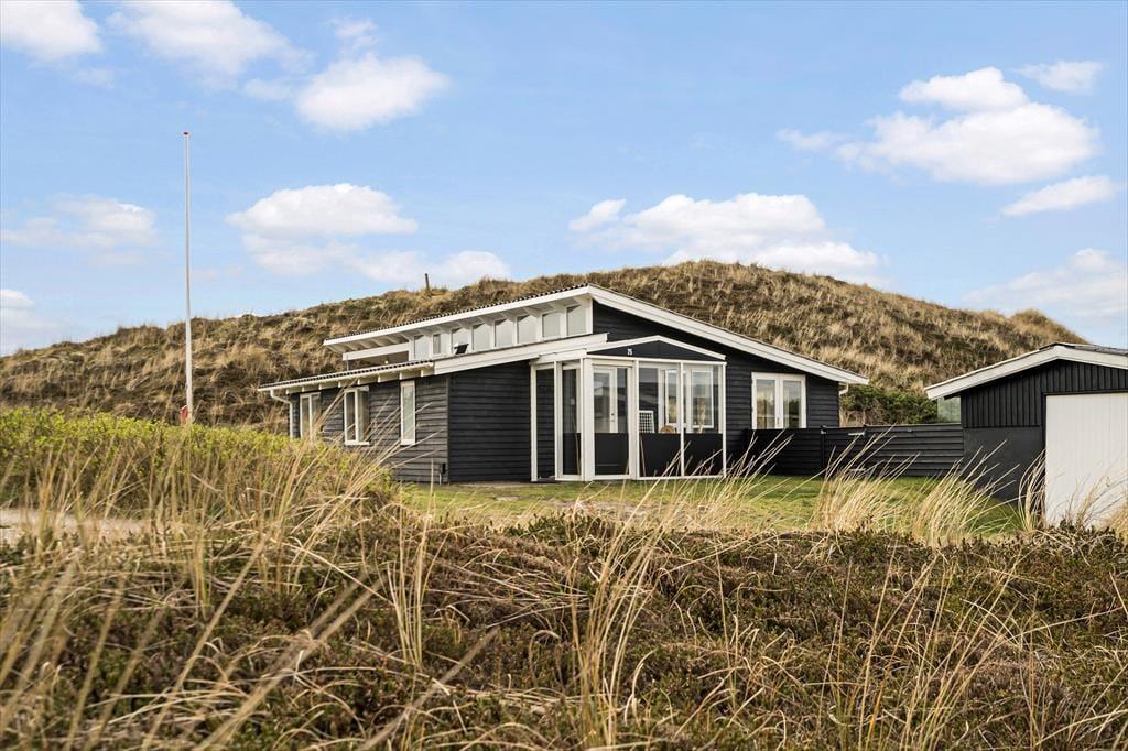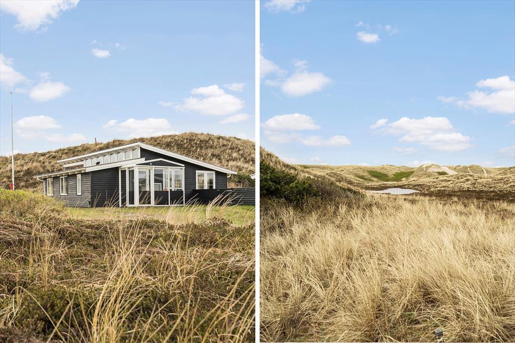 Dette flotte sommerhus har så dejlig en beliggenhed, at bare naturomgivelserne er med til at gøre ferien mindeværdig. Huset ligger op ad en høj klit og lige ud til det fredede, marehalmsklædte landskab, og hvis du vil ud til Vesterhavet, skal du kun gå et par hundrede meter, før du står på Houvig Strand.