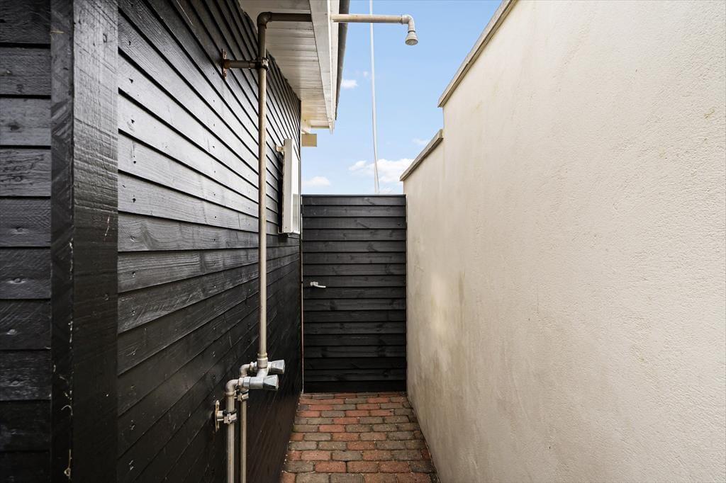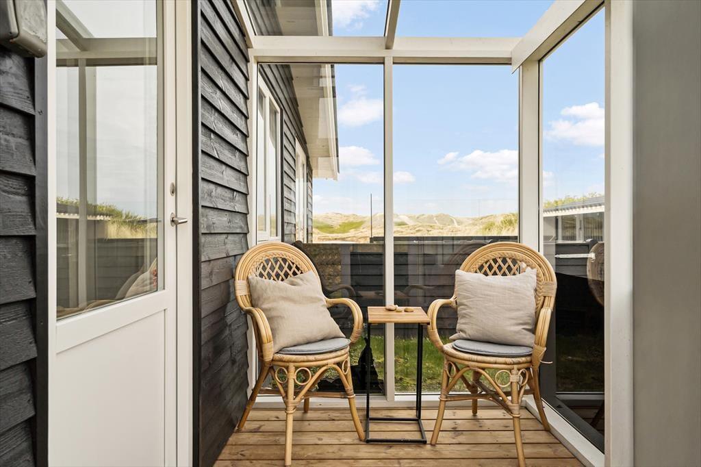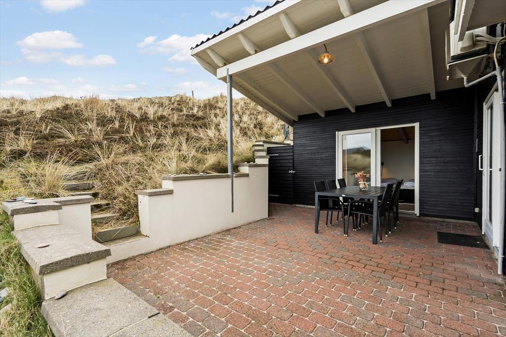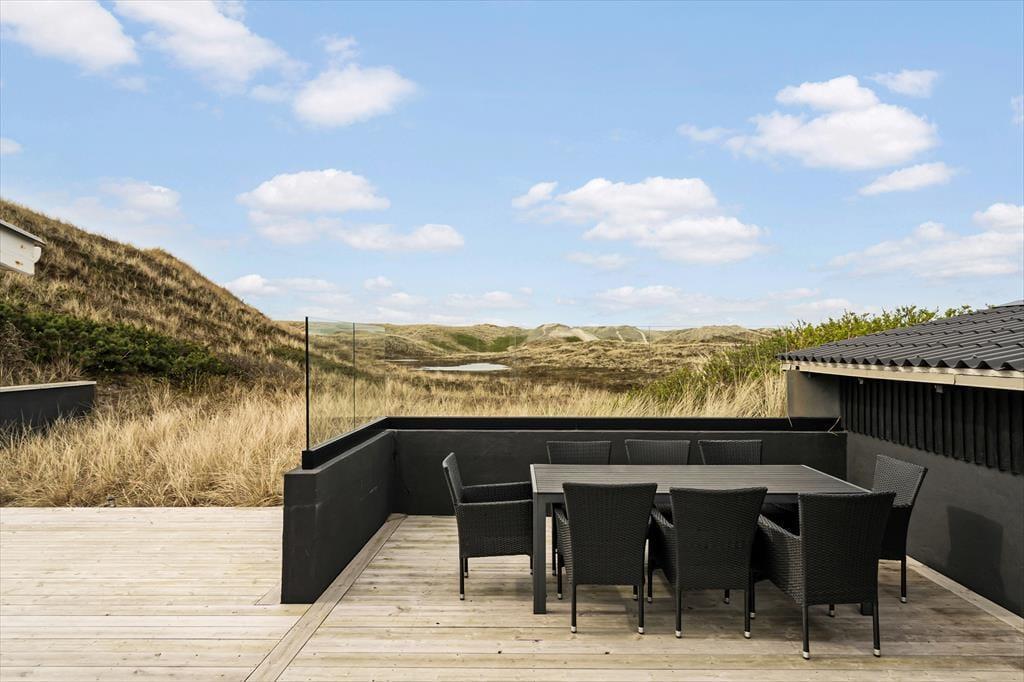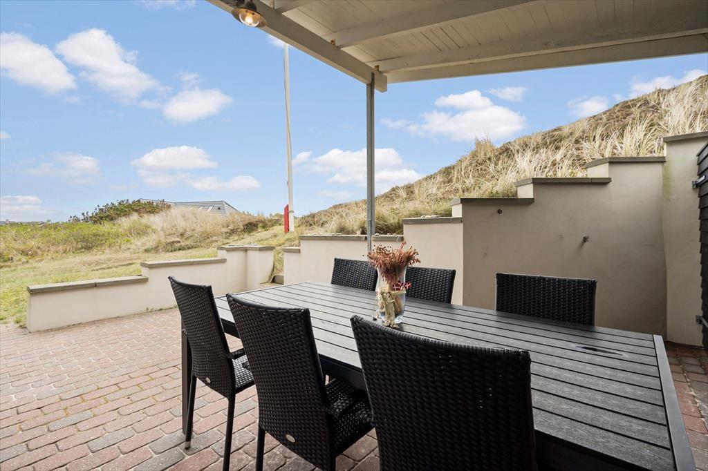 Stuens store vinduespartier giver dig fri udsigt til klitterne, men når du sætter dig helt ud på terrassen, bliver det smukke syn ledsaget af andre sanseoplevelser – de lune solstråler, den salte, friske lugt og måske endda lyden af rullende bølger. En del af terrassen er skærmet af et glasværn, hvis du får brug for læ for vestenvinden, og der er både parasoller og et overdækket areal til de sommervarme dage, hvor det er rart med skygge. Har du været ned for at blive frisket op af en havdukkert, kan du skylle dig under den udendørs bruser, så snart du er tilbage igen ved sommerhuset.