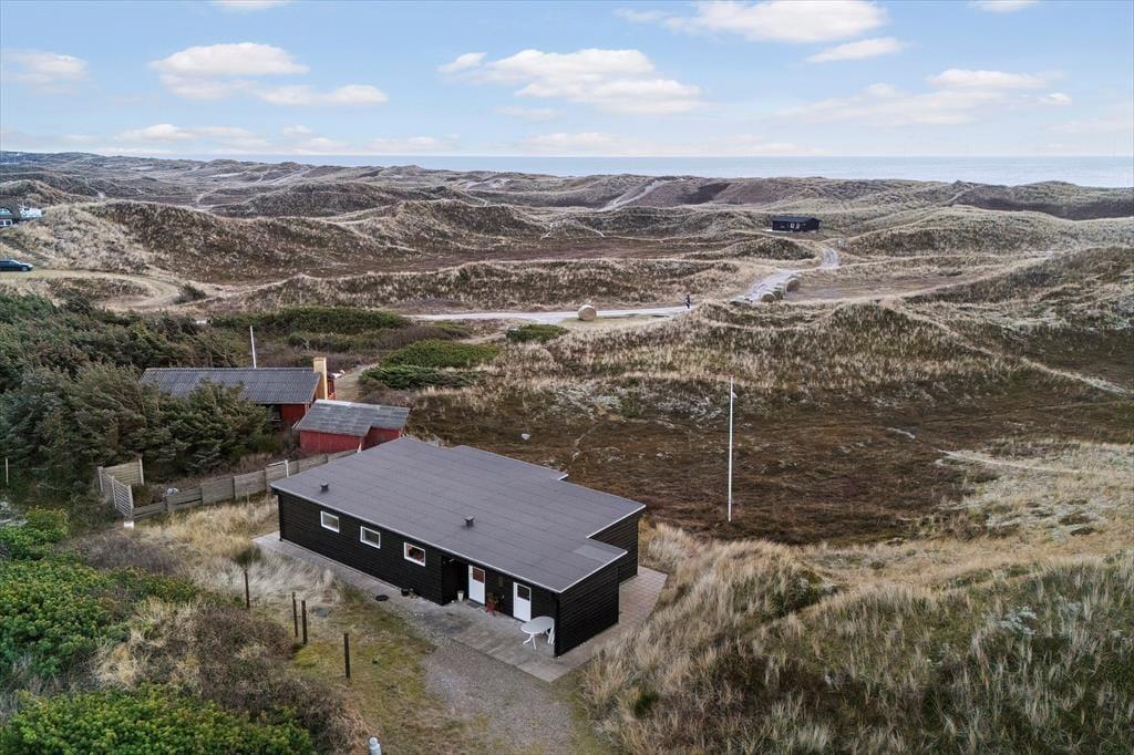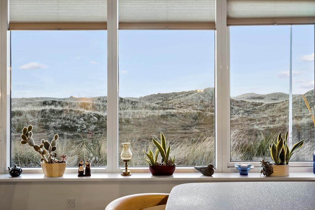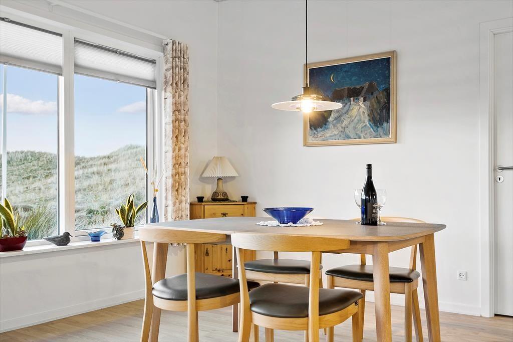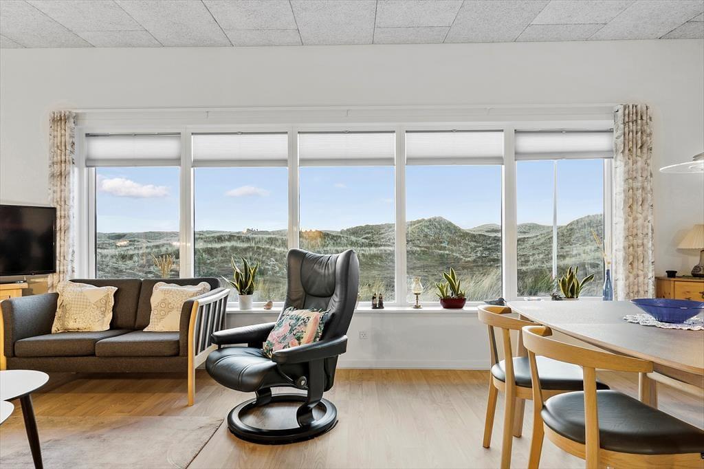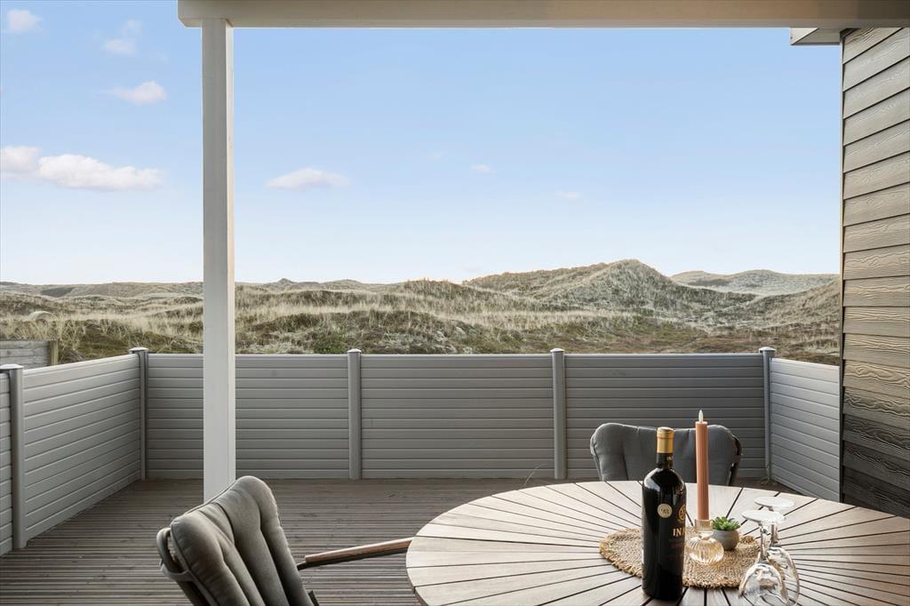 Udenfor venter en dejlig både lukket og overdækket træterrasse, hvor du kan tilbringe mange timer i det fri. Her kan du sidde og nyde den smukke natur omkring dig, og måske endda nyde en god bog eller en kop kaffe, mens du lader roen sænke sig. Den private beliggenhed gør det muligt at være helt uforstyrret, så du kan nyde både sol og skygge, afhængigt af hvor du placerer dig på terrassen. Den skønne udsigt til klitterne gør det ekstra hyggeligt at være ude, og om aftenen kan du få en fantastisk oplevelse, når solen går ned over landskabet.