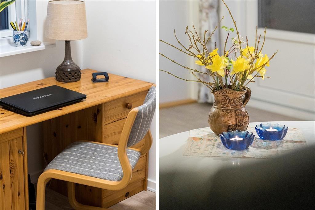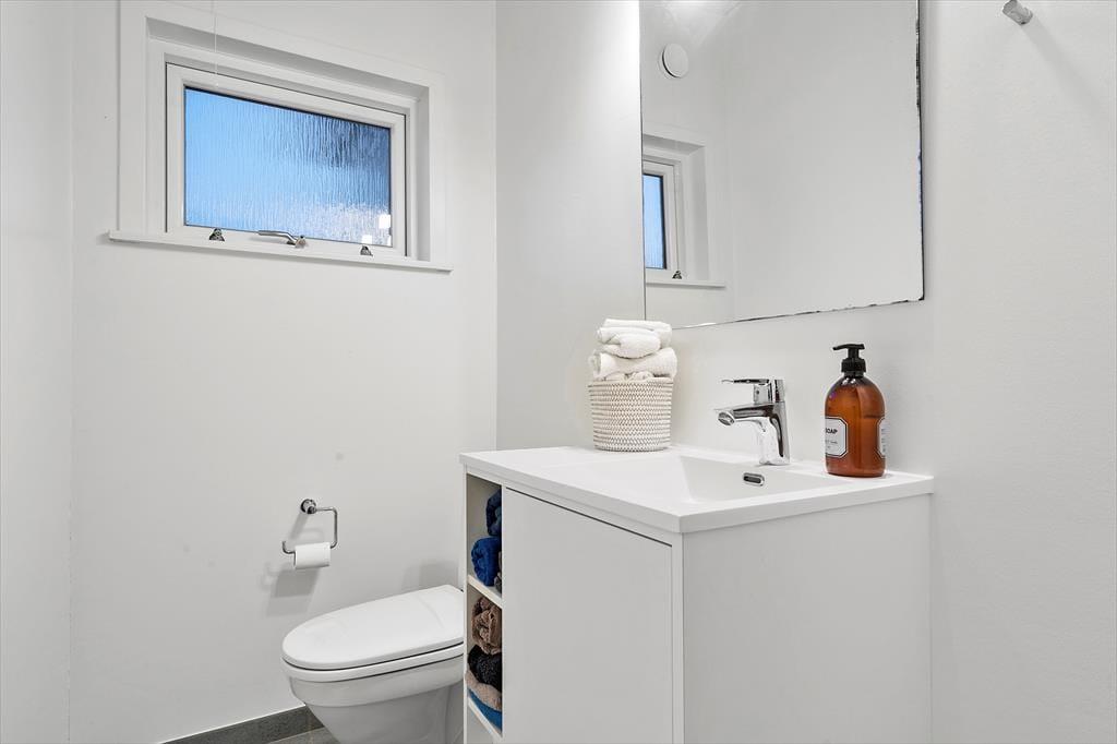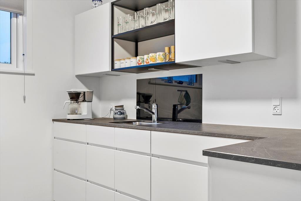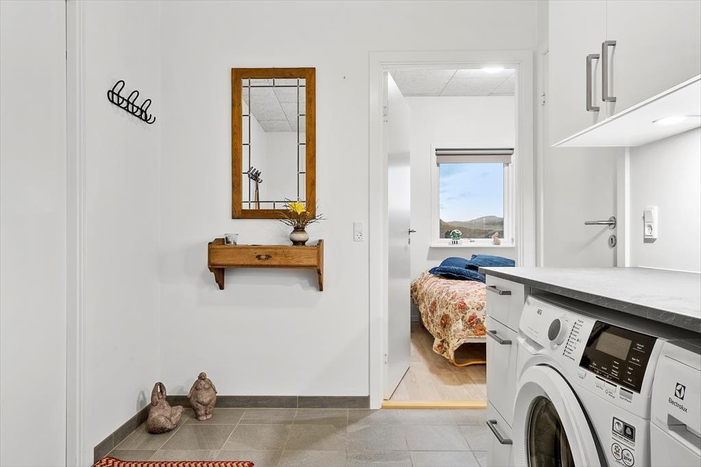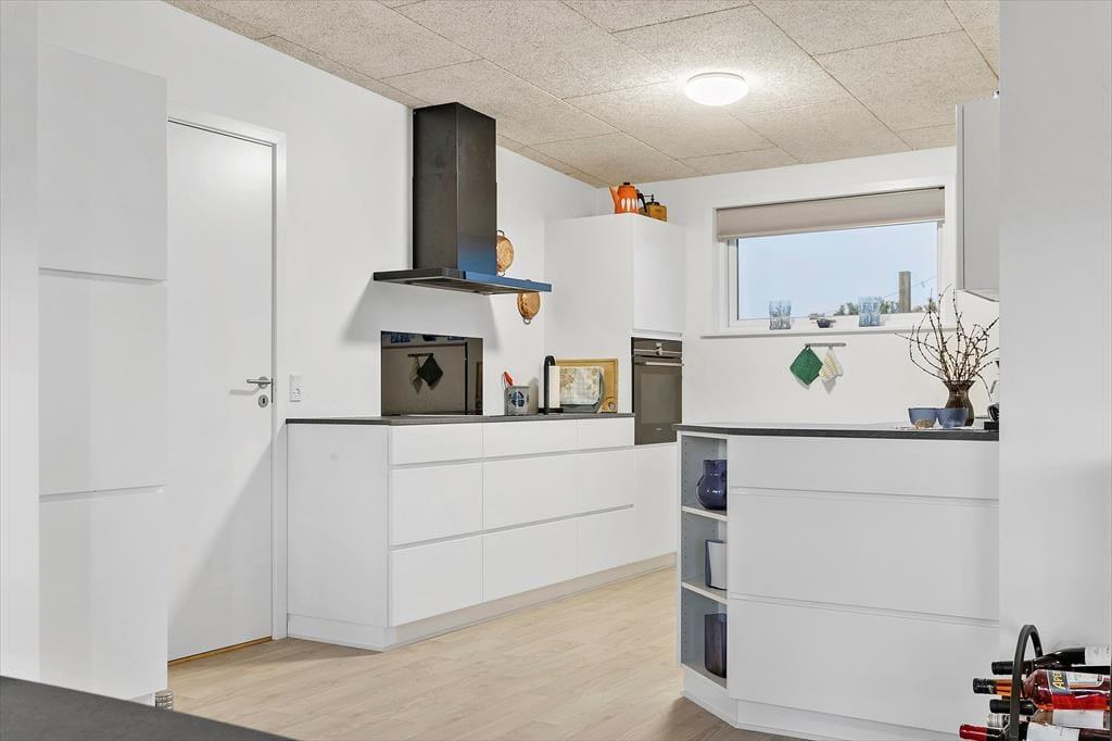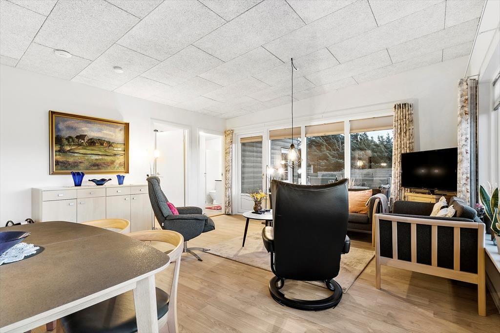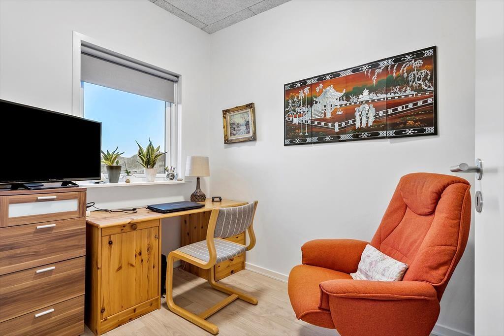 Når du træder ind i sommerhuset, bliver du mødt af en lys og luftig atmosfære. Store vinduer i stuen åbner op for en fantastisk panoramaudsigt over landskabet, og med gulvvarme i hele huset kan du nyde komforten på selv de koldeste dage. Indretningen er både enkel og stilfuld, og du vil straks føle dig hjemme. Der er to dejlige soveværelser med masser af skabsopbevaring, så du nemt kan få plads til alt dit feriegrej. Der er også et kontorværelse, som giver mulighed for at arbejde i ro og mag, hvis behovet skulle opstå. Badeværelset er et rent velvære-oase med både bruseniche og et dejligt badekar, hvor du kan slappe af og nyde lidt ekstra forkælelse.