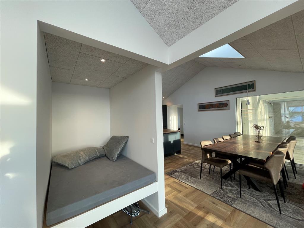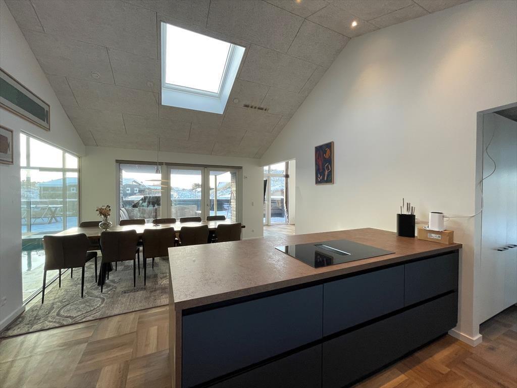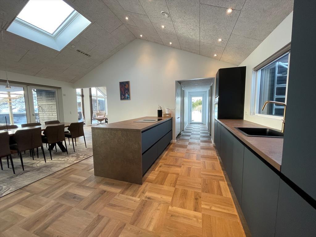 Når I træder ind i sommerhuset, mødes I af en lys, luftig og indbydende atmosfære med højt til loftet og store, åbne rum, der straks sætter feriestemningen. Det store køkken-alrum er sommerhusets naturlige samlingspunkt – et sted, hvor madlavning, samtaler og afslapning flyder sammen på tværs af generationer. Vi oplever ofte, at netop denne type rum skaber de bedste ferieminder, fordi ingen bliver skilt ad, men i stedet kan være sammen – uanset om man står ved køkkenbordet, slapper af eller bare nyder nærværet.