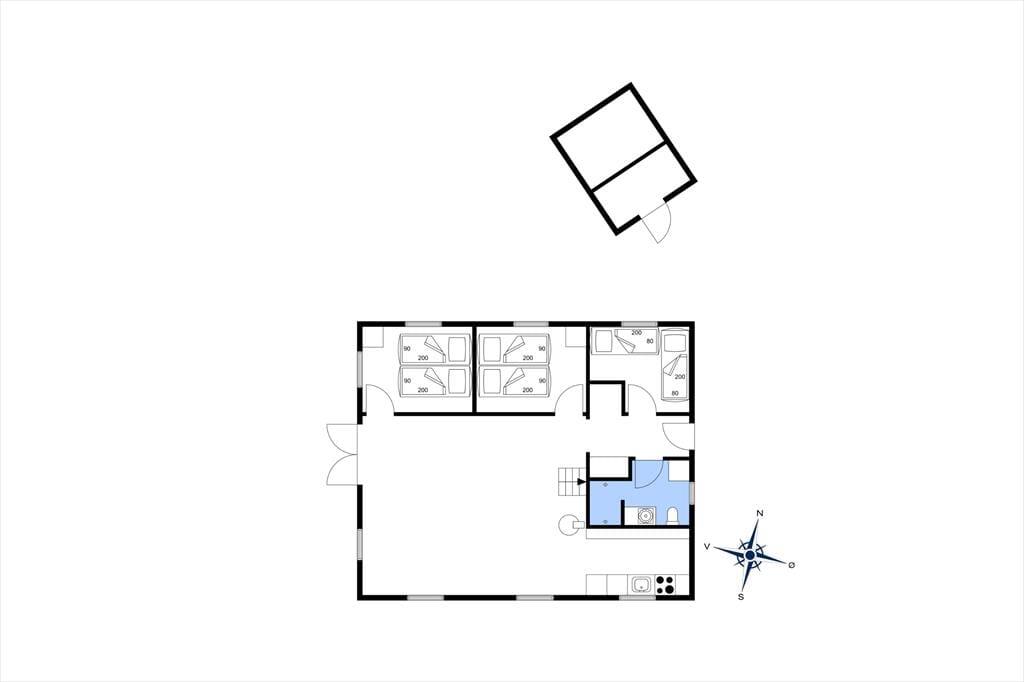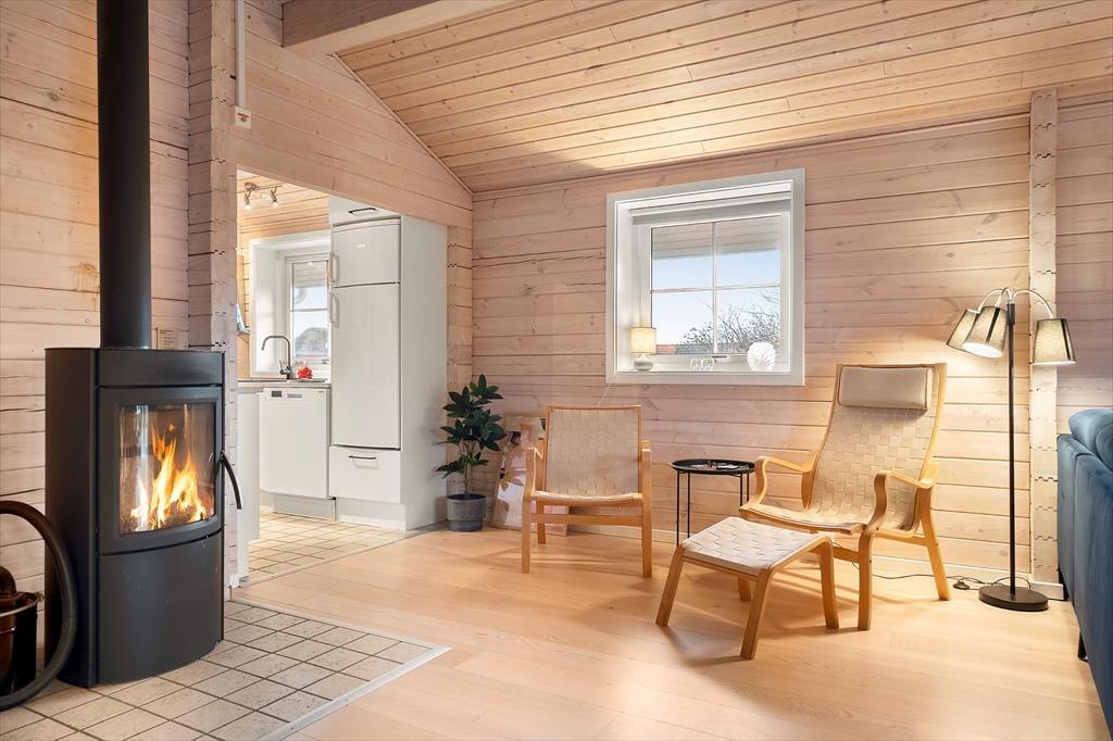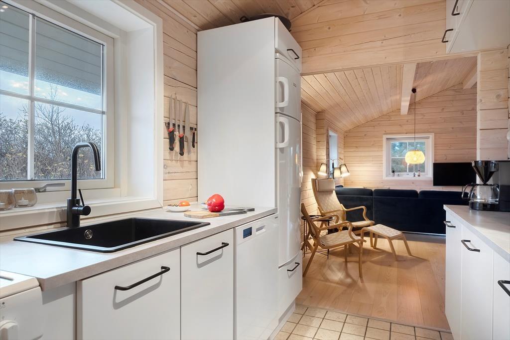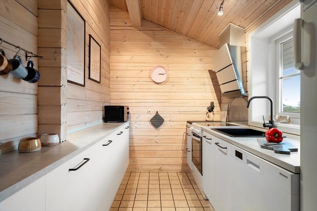 Det 90 m2 store bjælkehus passer godt ind i Houvigs naturskønne omgivelser. Det ligger lidt i læ mellem klitterne og grundens grønne beplantning – hvilket også betyder, at I kan se lige ud på hybenbuske og bølgende marehalm, når I hygger jer inden døre. Sommerhuset, der er opført i 2009, har et venligt og imødekommende indre med loft til kip, lyse trævægge og brændeovn i stuen. Det er et dejligt opholdsrum, og når I ikke hygger jer her i samlet flok, kan børnene smutte op ad stigen for at lege på husets gode hems. Køkkenet, der ligger i åben forbindelse med stuen, er veludstyret med blandt andet opvaskemaskine og køleskab med en 40 liters fryser, og på badeværelset har I ikke bare en, men to brusere foruden vaskemaskine og tørretumbler. Soveværelser er der tre af, som i alt har sengepladser til seks personer.