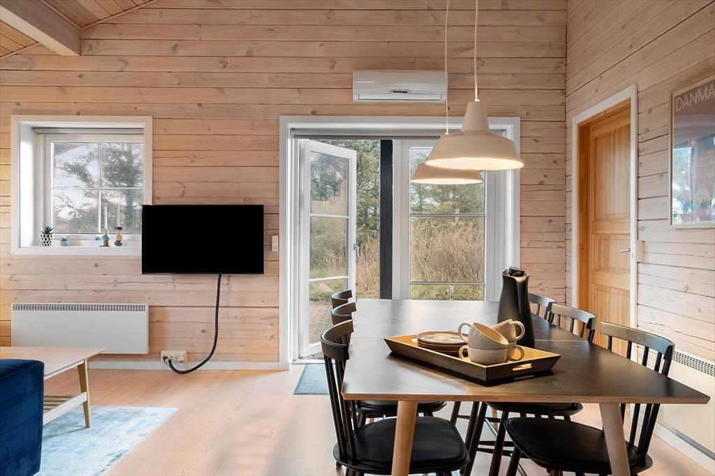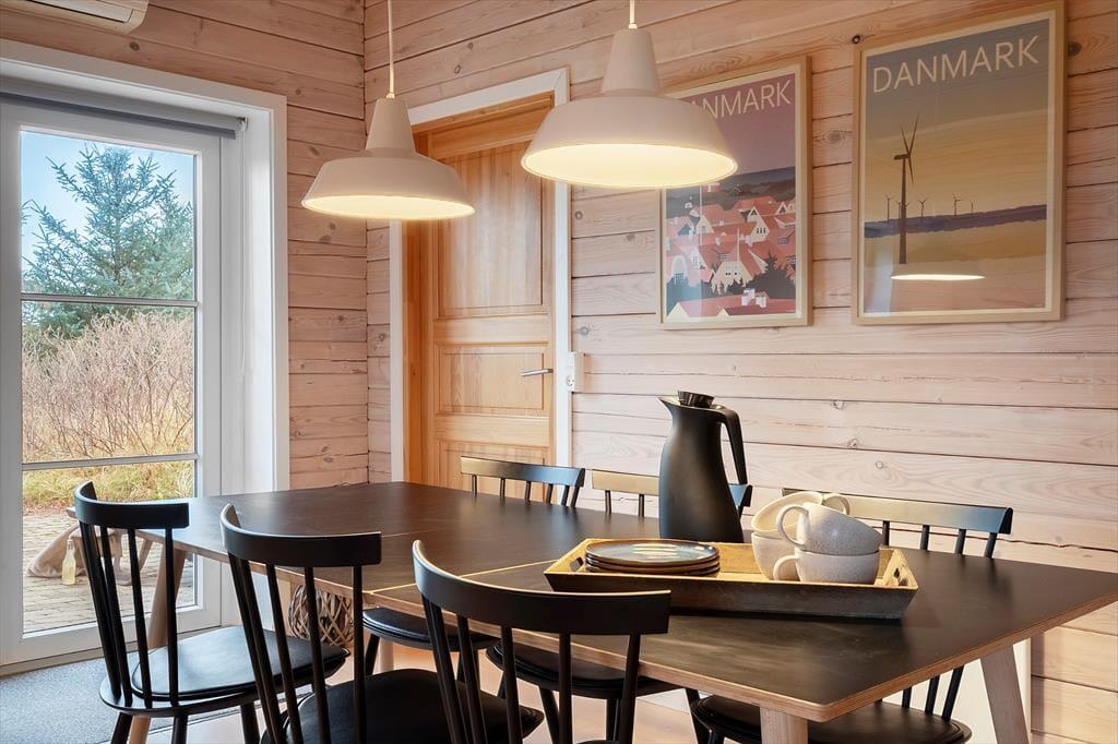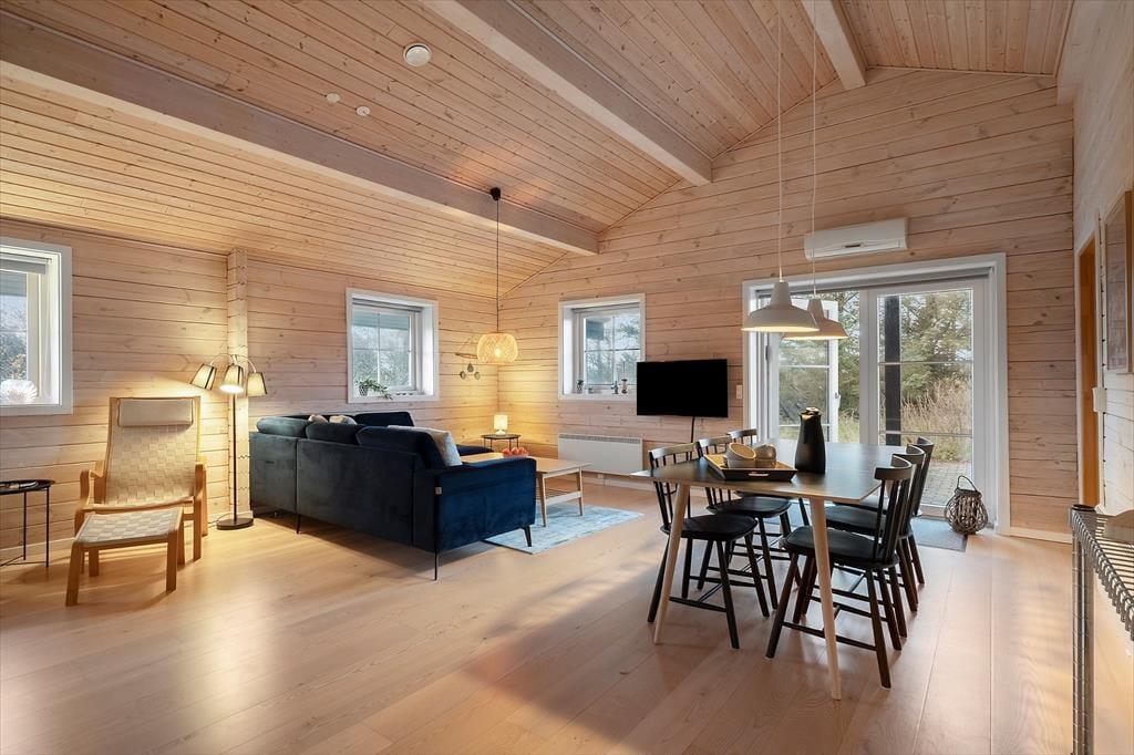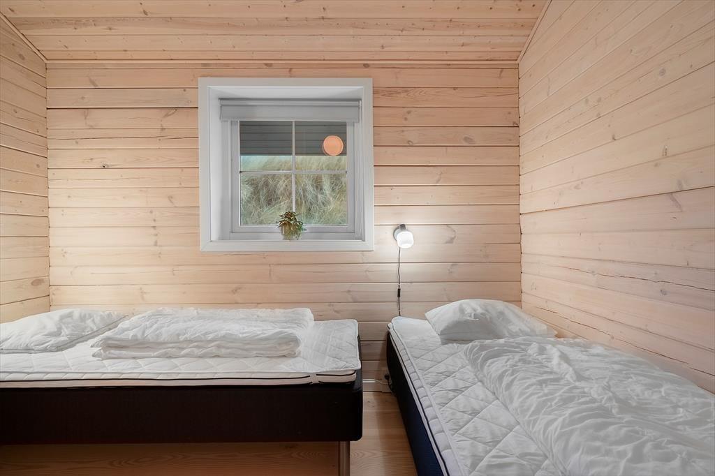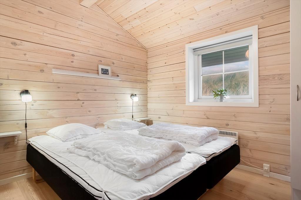 Det hyggelige bjælkehus ligger godt tilbagetrukket på den lukkede Troldedalen, bare 400 meter fra Houvig Strand og det brusende Vesterhav. Den attraktive adresse betyder, at I kan tilbringe en stor del af ferien i vandkanten – uanset om I er kommet for at bade, eller om I er mere til at gå lange ture og lede efter flotte sten og skaller. Den nemme adgang til den nærmeste golfbane og lokalområdets mange fiskespots vil golfspillere og lystfiskere sikkert værdsætte, og hvis I har medbragt cykler, kan I se frem til mange skønne udflugter til Stadil Fjord, Ringkøbing eller Hvide Sande. Den hyggelige badeby Søndervig ligger kun et par kilometer mod syd, når I vil købe ind, gå på restaurant eller finde en sjov ferieaktivitet til hele familien.