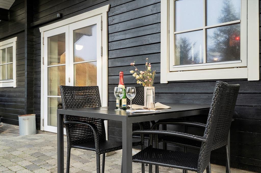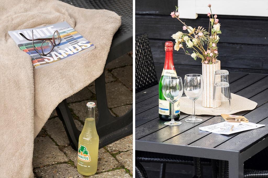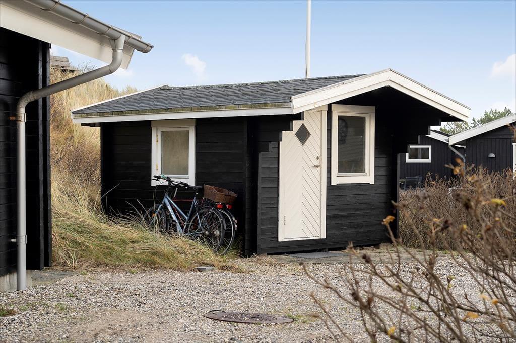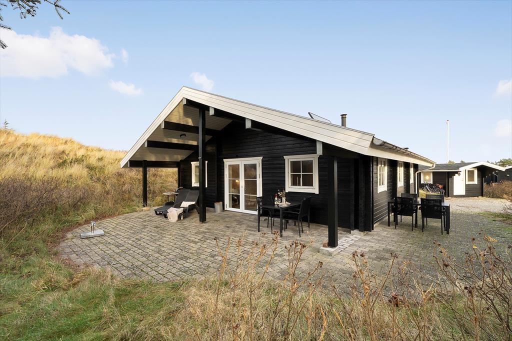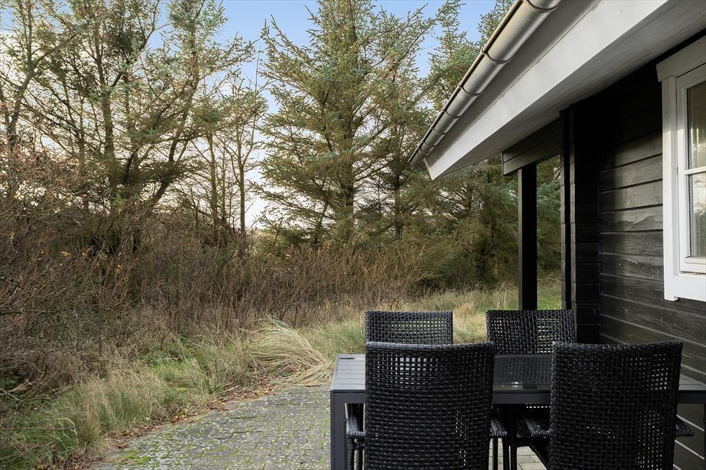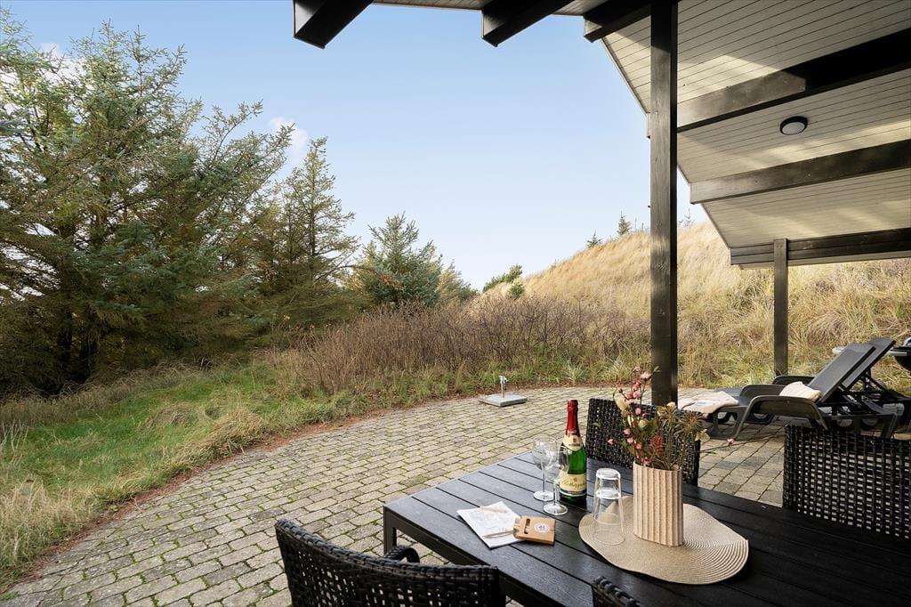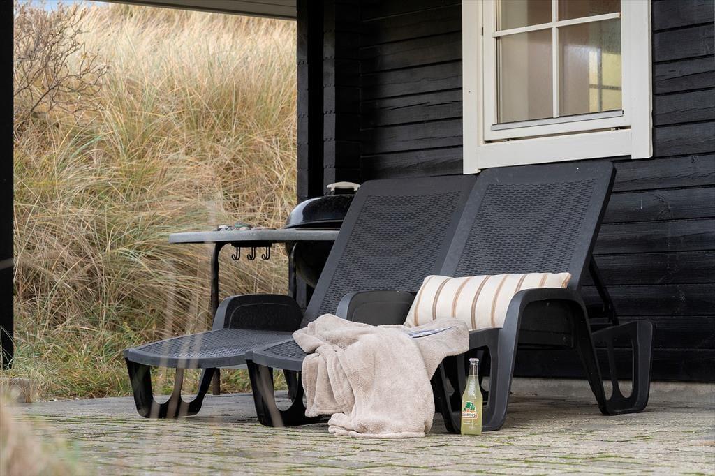Sommerhusets vestvendte terrassemiljø ligger godt i læ som en ugeneret oase mellem klitter og hybenbuske. Her kan I sole jer, godt tilbagelænede i havemøblerne og med en kølig forfriskning indenfor bekvem rækkevidde. Senere kan I tænde grillen og dække op til et udendørs festmåltid. Solnedgangen kan I nyde fra klittoppen og bagefter kan I rykke ind under terrassens overdækning for at fortsætte den udendørs feriehygge.