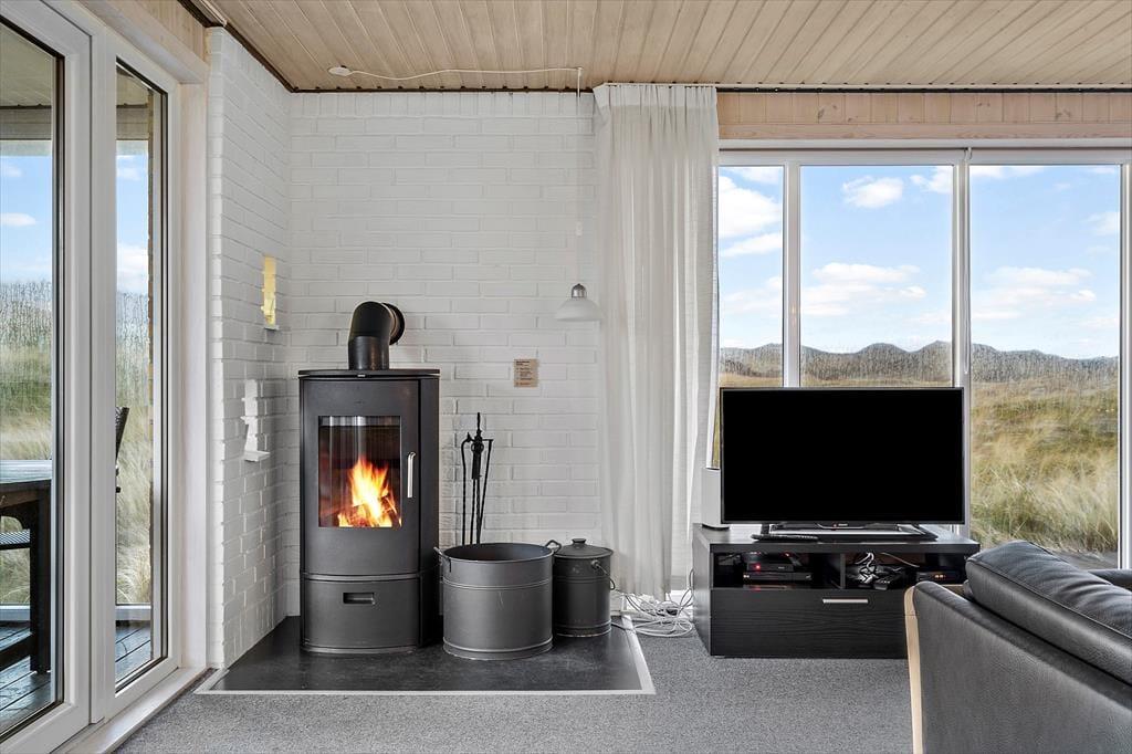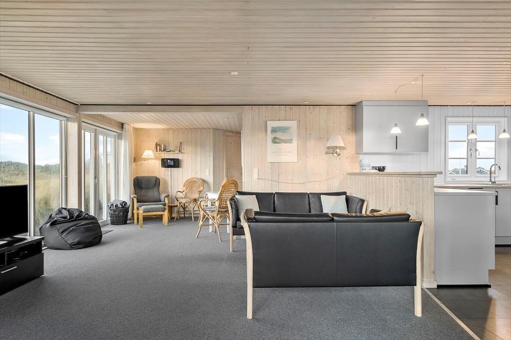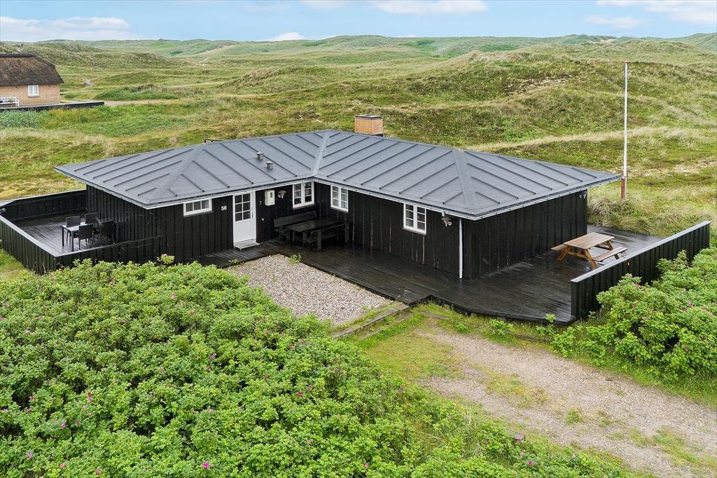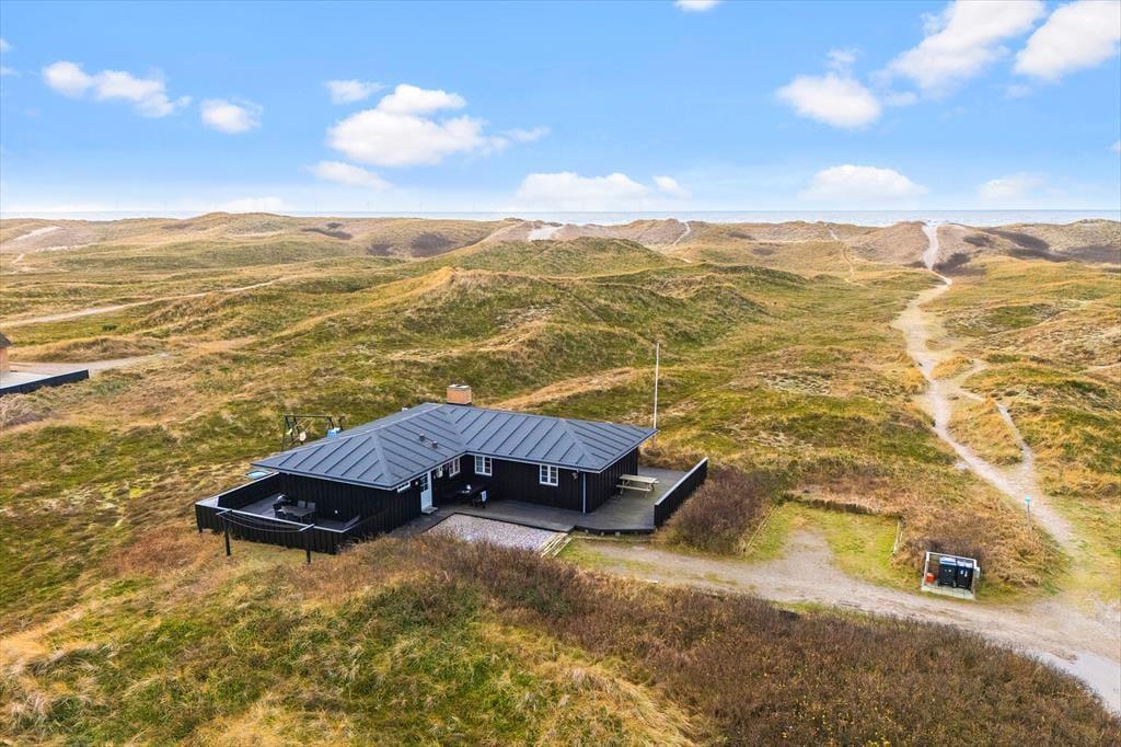 Det 112 m2 store hus giver jer en skøn ramme om feriens små og store begivenheder. Inden døre er der plads til otte personer, der kan overnatte på fire gode soveværelser – og de er endda praktisk fordelt i to soveafsnit med hver sit badeværelse, så huset passer ideelt til to børnefamilier. Det største badeværelse er ikke bare udstyret med vaskemaskine, men også spabad og sauna, så her kan I både klare tøjvasken og skrue op for feriens wellnessfølelse. Centralt i huset ligger stue og køkken samlet, og her sørger et stort vinduesparti mod vest for, at I kan kigge lige ud i det smukke klitlandskab. Brændeovnen kører et godt parløb med elradiatorerne, hvis det er køligt udenfor, og hvis I får nok af yatzy, krydsogtværser, bøger og hyggesnak, er der både parabol-tv og god wi-fi-forbindelse inden døre.