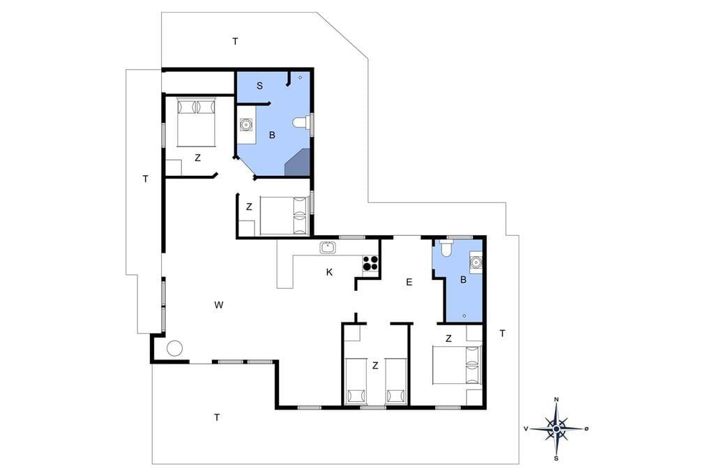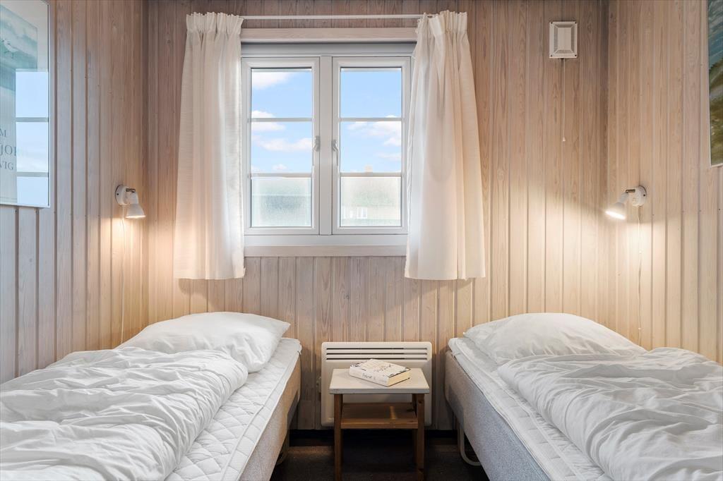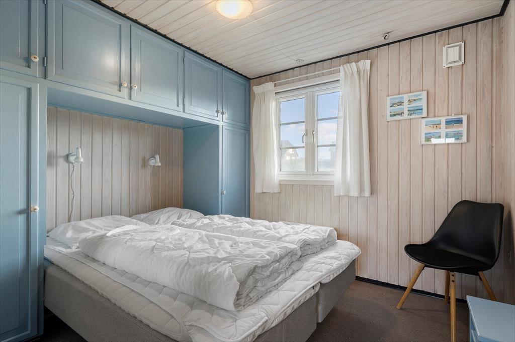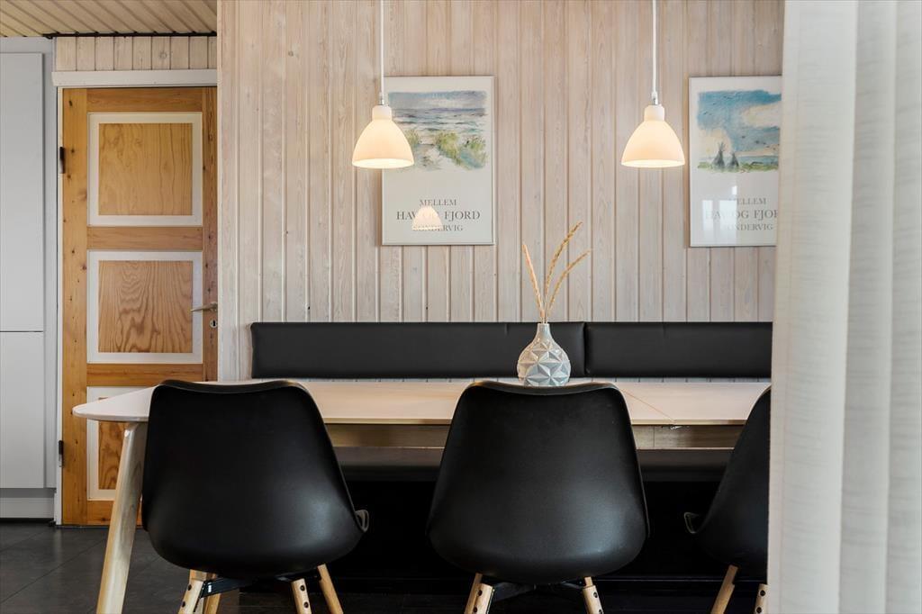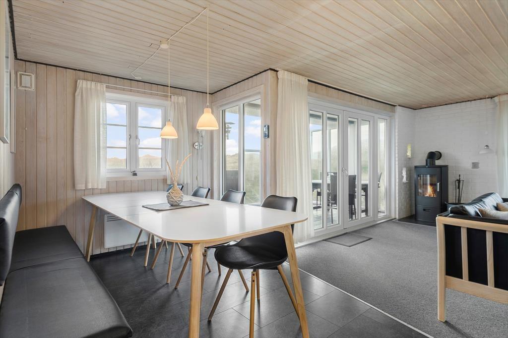 Det 112 m2 store hus giver jer en skøn ramme om feriens små og store begivenheder. Inden døre er der plads til otte personer, der kan overnatte på fire gode soveværelser – og de er endda praktisk fordelt i to soveafsnit med hver sit badeværelse, så huset passer ideelt til to børnefamilier. Det største badeværelse er ikke bare udstyret med vaskemaskine, men også spabad og sauna, så her kan I både klare tøjvasken og skrue op for feriens wellnessfølelse. Centralt i huset ligger stue og køkken samlet, og her sørger et stort vinduesparti mod vest for, at I kan kigge lige ud i det smukke klitlandskab. Brændeovnen kører et godt parløb med elradiatorerne, hvis det er køligt udenfor, og hvis I får nok af yatzy, krydsogtværser, bøger og hyggesnak, er der både parabol-tv og god wi-fi-forbindelse inden døre.