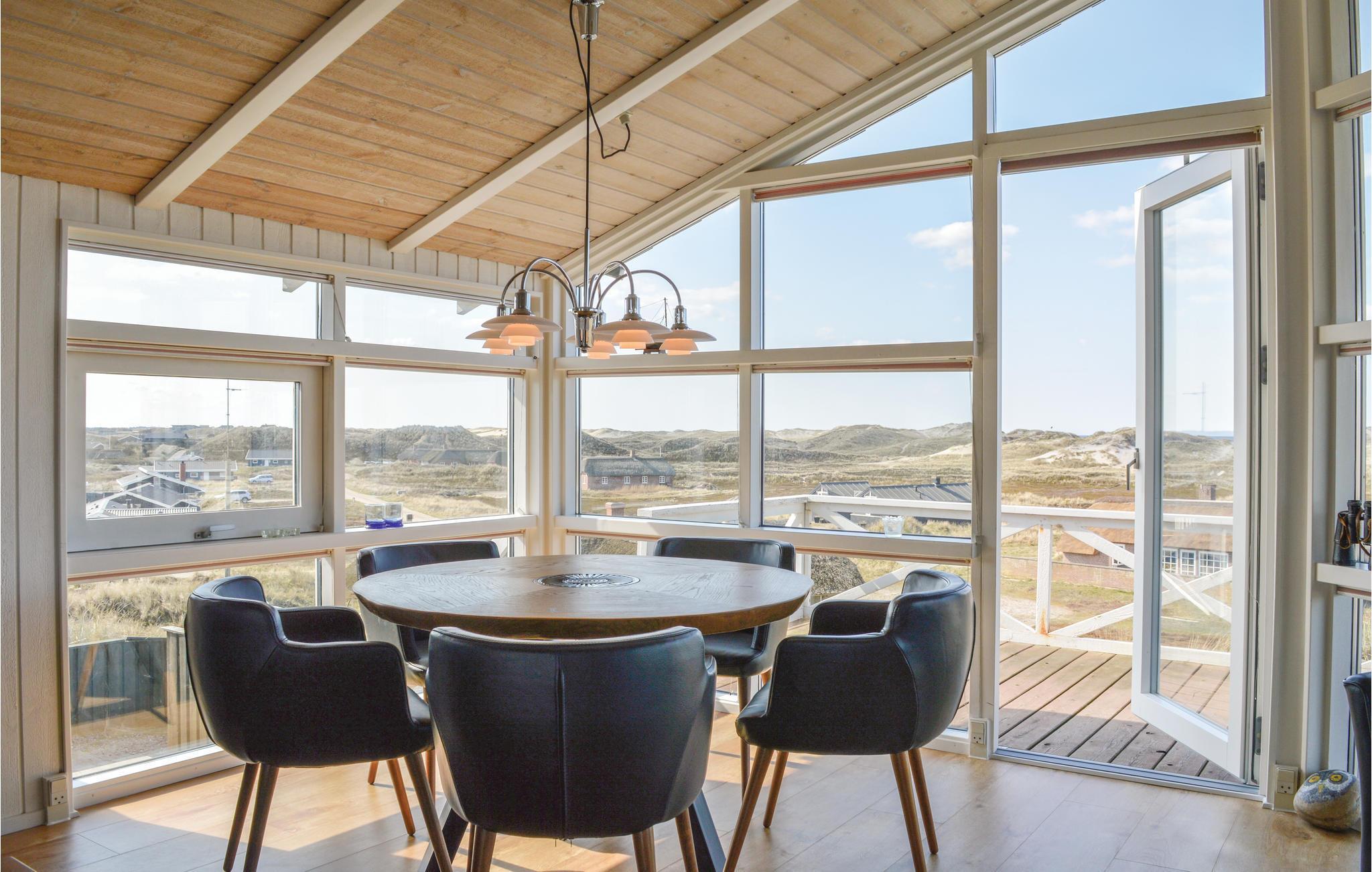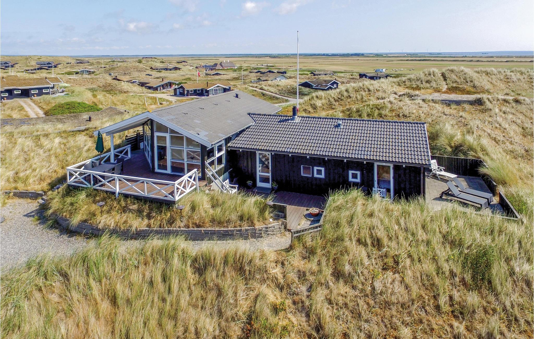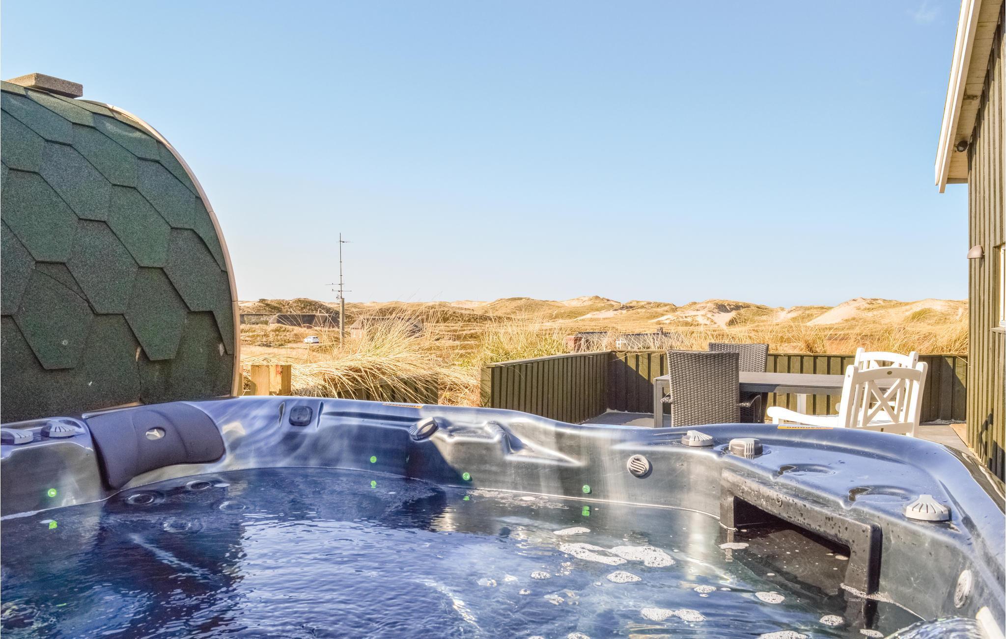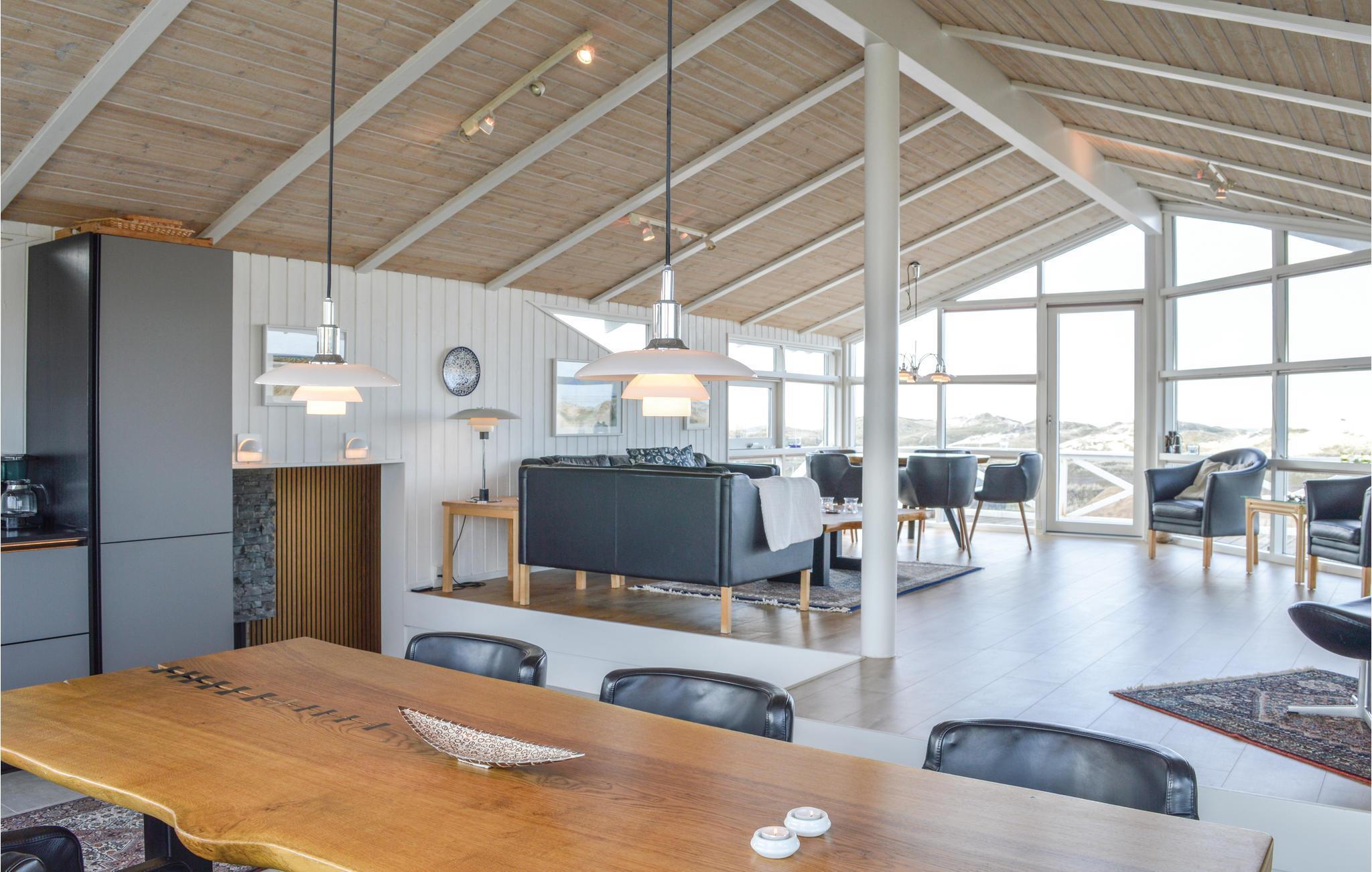 I dette luksuriøse, rigtig godt beliggende feriehus finder I alt til den perfekte ferie. Huset er omgivet af terrasser i forskellige niveauer, alle med en fantastisk udsigt over landskab, klitter, sommerhusområdet og til Vesterhavet. På den ene terrasse findes en standvandsspa og en udesauna, ligeledes med en fantastisk udsigt, så her er lagt op til mange timers udendørs wellness efter en lang gåtur ved det brusende Vesterhav. Når I træder ind i huset, er det første I møder en flot gaspejs, der styres via en fjernbetjening. I den ene ende af huset ligger soveværelserne. Et af de fire soveværelser er et master bedroom med tilhørende badeværelse, dertil kommer endnu et badeværelse med både bruser og et eksklusivt badekar.