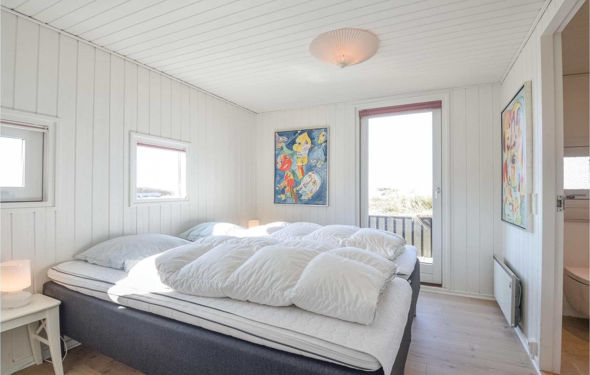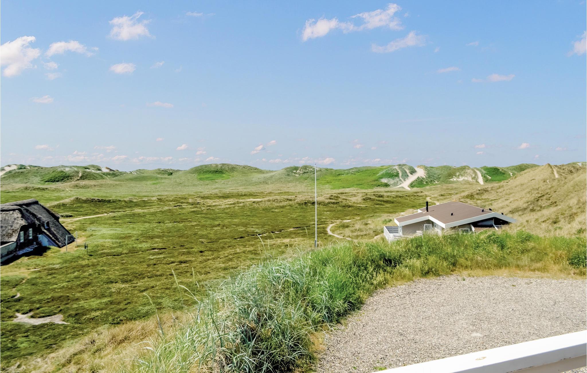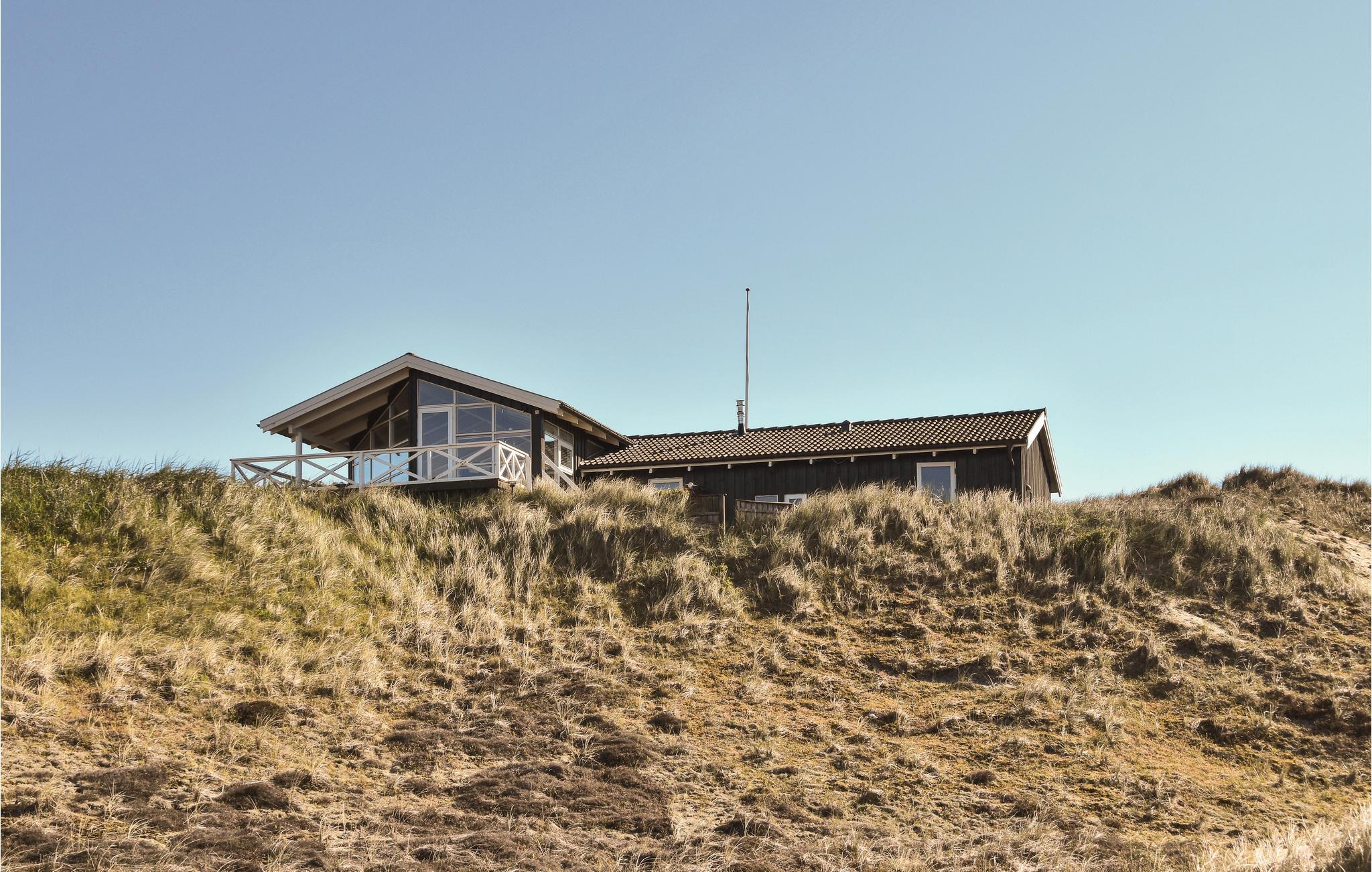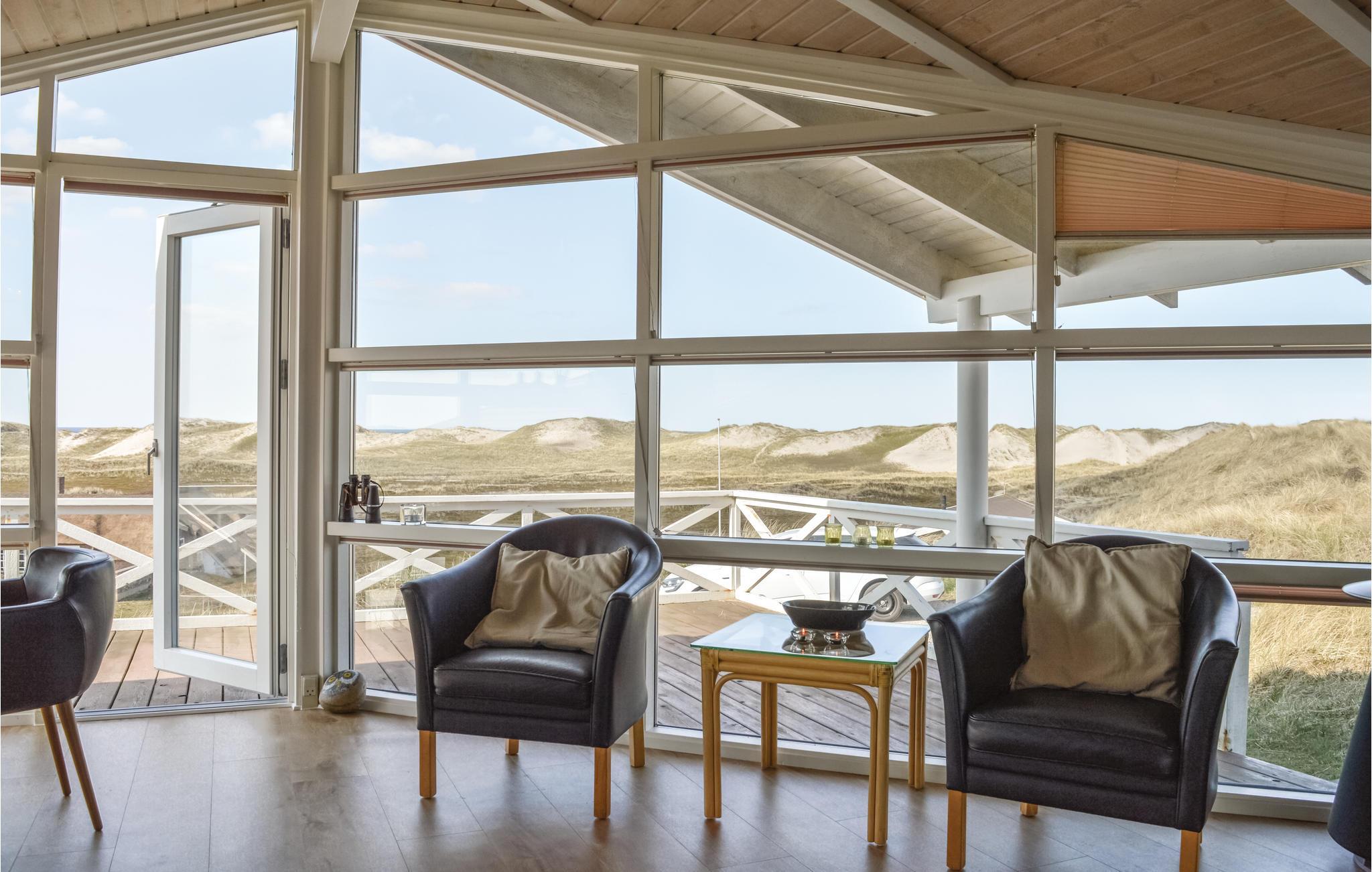 I dette luksuriøse, rigtig godt beliggende feriehus finder I alt til den perfekte ferie. Huset er omgivet af terrasser i forskellige niveauer, alle med en fantastisk udsigt over landskab, klitter, sommerhusområdet og til Vesterhavet. På den ene terrasse findes en standvandsspa og en udesauna, ligeledes med en fantastisk udsigt, så her er lagt op til mange timers udendørs wellness efter en lang gåtur ved det brusende Vesterhav. Når I træder ind i huset, er det første I møder en flot gaspejs, der styres via en fjernbetjening. I den ene ende af huset ligger soveværelserne. Et af de fire soveværelser er et master bedroom med tilhørende badeværelse, dertil kommer endnu et badeværelse med både bruser og et eksklusivt badekar.