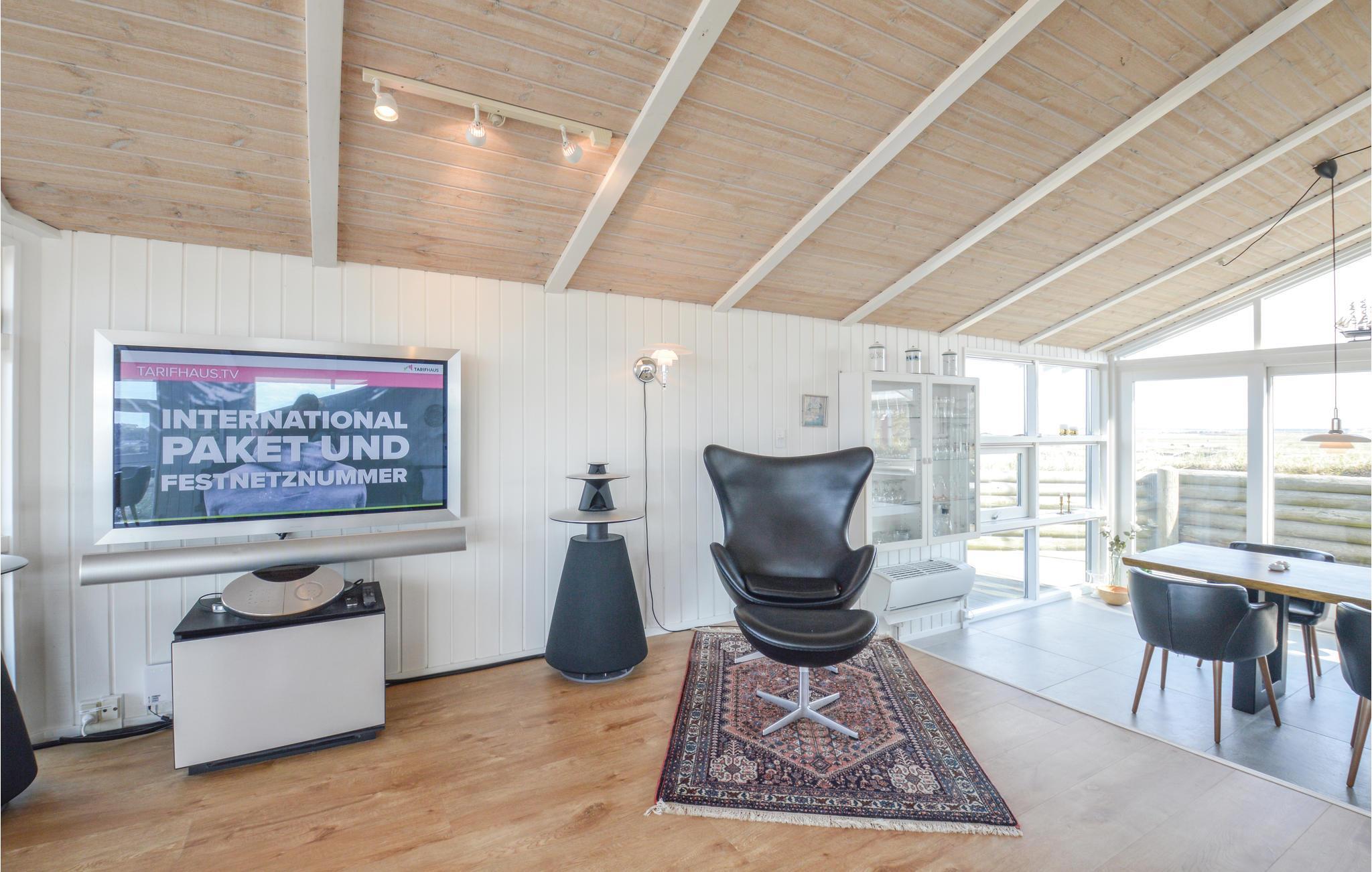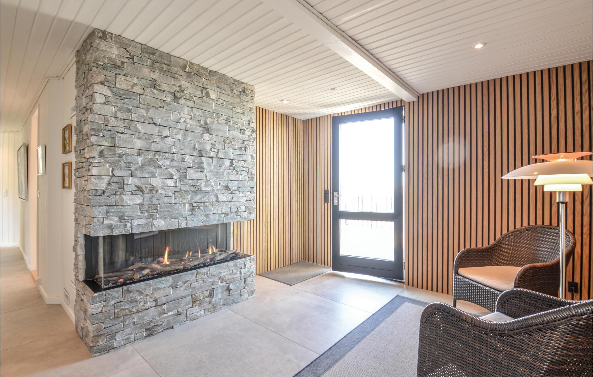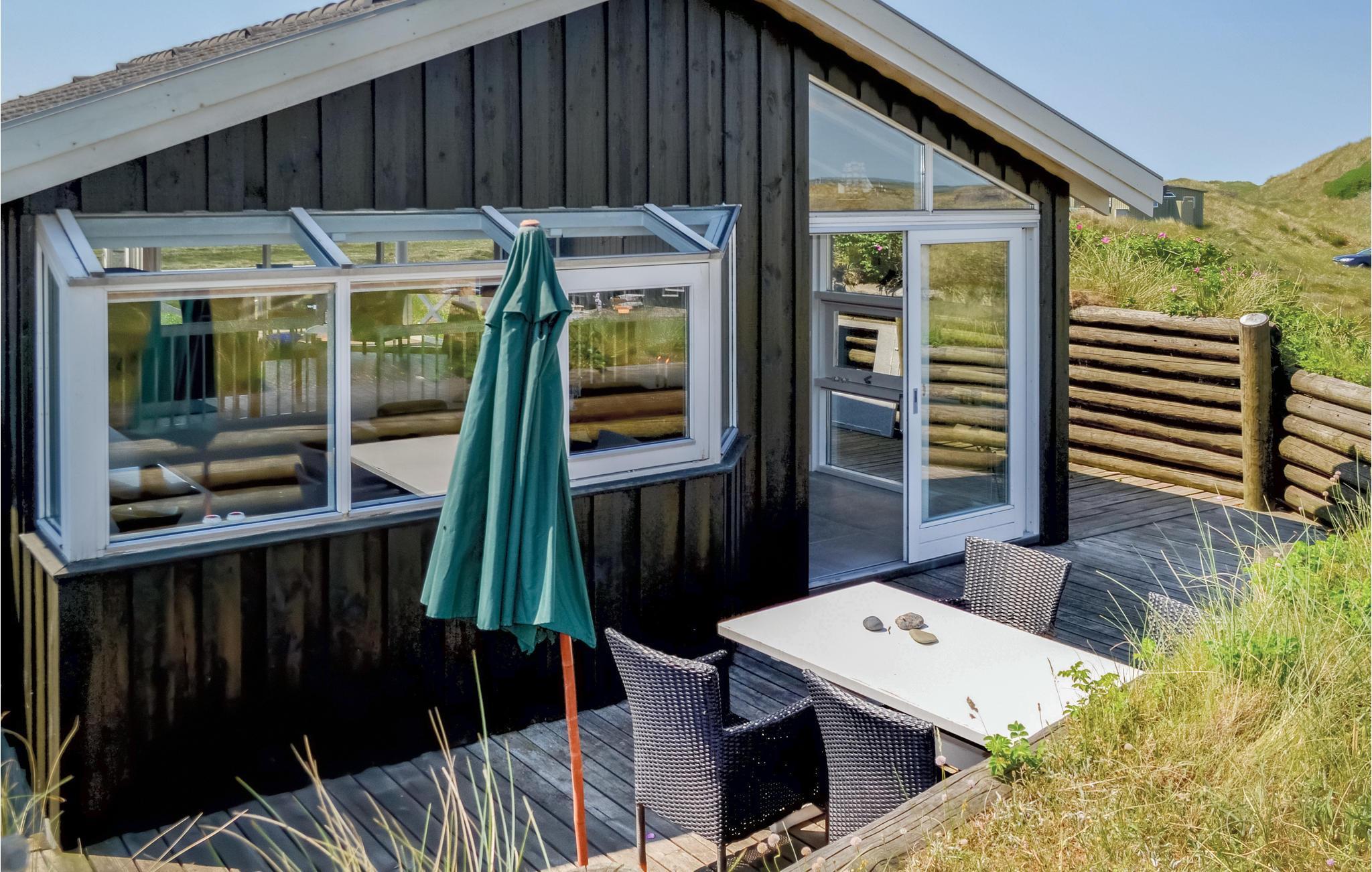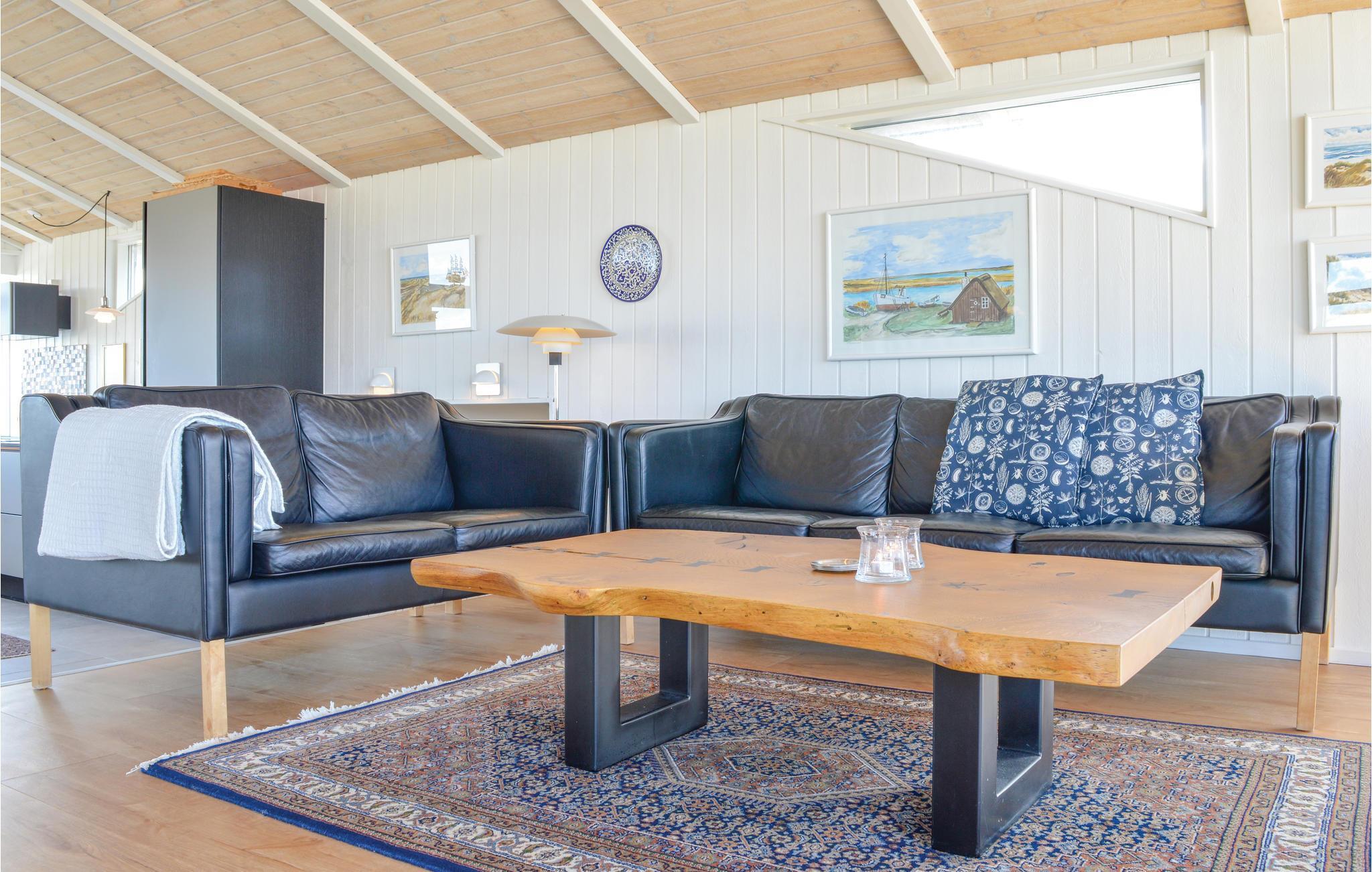 I dette luksuriøse, rigtig godt beliggende feriehus finder I alt til den perfekte ferie. Huset er omgivet af terrasser i forskellige niveauer, alle med en fantastisk udsigt over landskab, klitter, sommerhusområdet og til Vesterhavet. På den ene terrasse findes en standvandsspa og en udesauna, ligeledes med en fantastisk udsigt, så her er lagt op til mange timers udendørs wellness efter en lang gåtur ved det brusende Vesterhav. Når I træder ind i huset, er det første I møder en flot gaspejs, der styres via en fjernbetjening. I den ene ende af huset ligger soveværelserne. Et af de fire soveværelser er et master bedroom med tilhørende badeværelse, dertil kommer endnu et badeværelse med både bruser og et eksklusivt badekar.