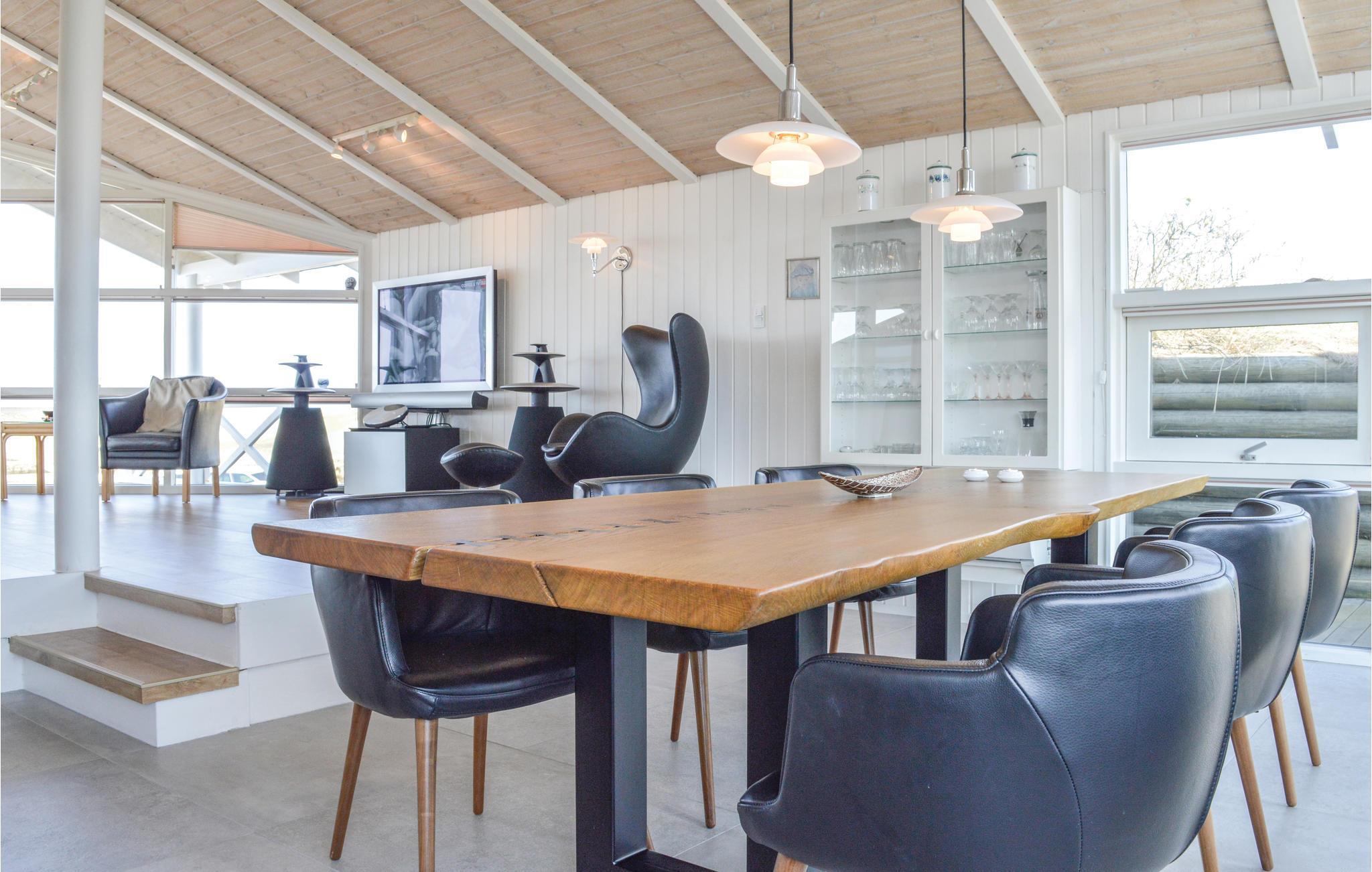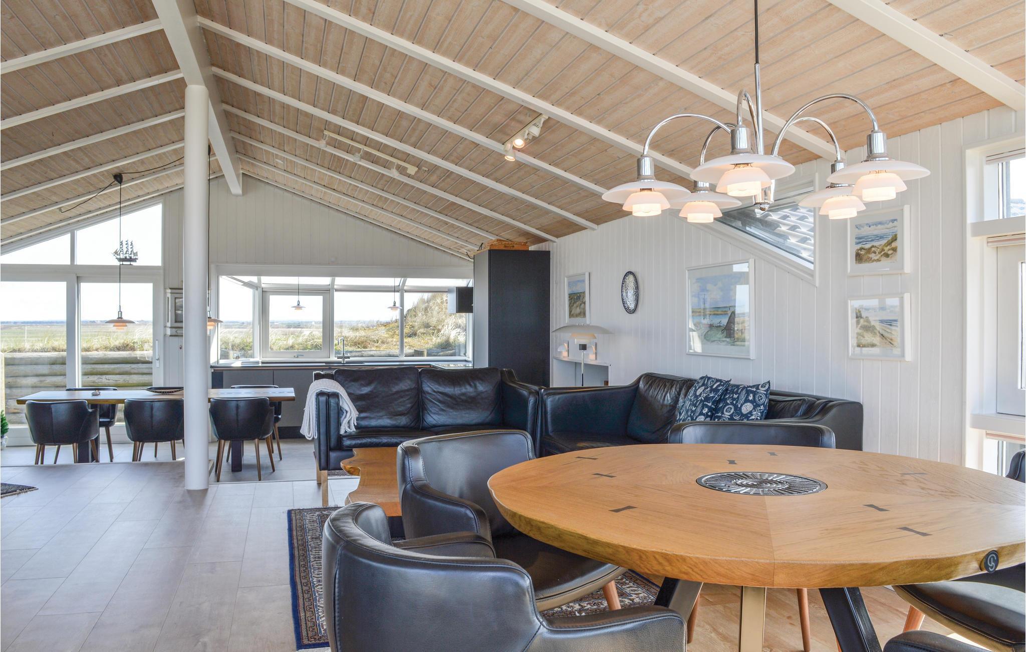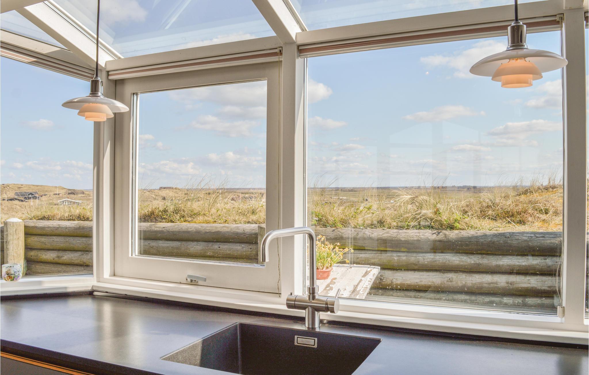 I den anden ende af huset, i forskudte plan ligger det store, flotte køkken med mange fine detaljer, bl.a. er der indbygget lys over de skjulte håndtag i køkkenlågerne. Opvasken behøver ikke længere være en sur pligt, når I samtidig kan stå og kigge ud over det flotte landskab. Husets stue ligger lige et par trin højere end køkken og spiseområde, og herfra er der ligeledes en fantastisk udsigt over klitter og helt til havet. I stuen er der tænkt på alle detaljer med designermøbler, stort tv og musikanlæg der har en vidunderlig lyd. Feriehuset ligger kun få kilometers afstand fra badebyen Søndervig.
